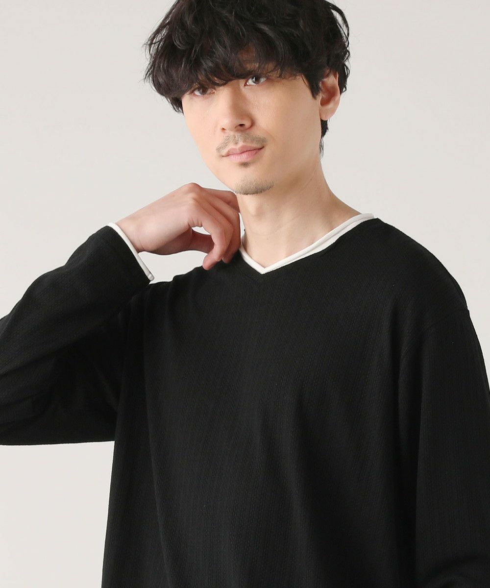シャープなVネックカットソーとインナーのレイヤードスタイルがこれ一枚で完成するアイテムです。