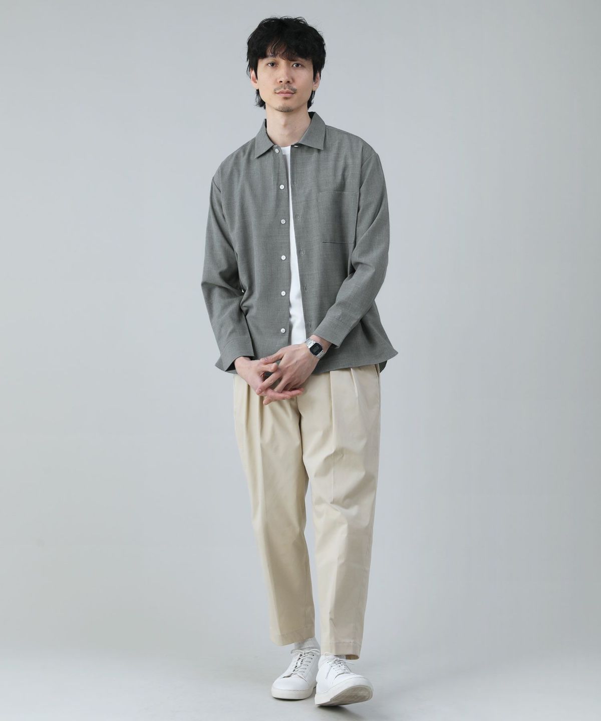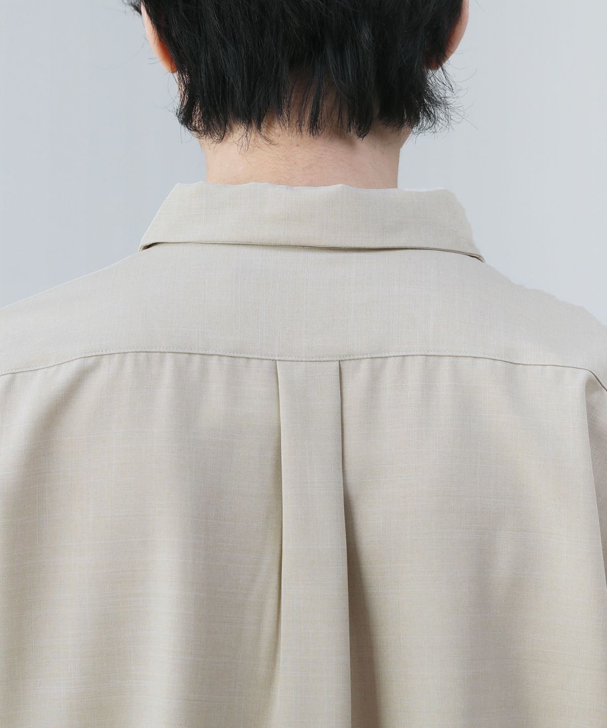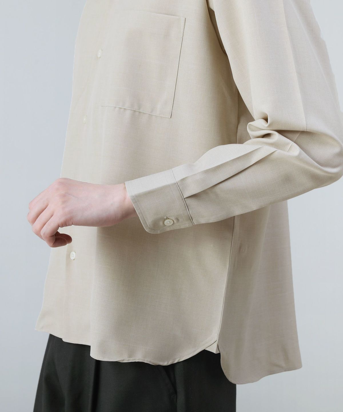 首まわりがスッキリと見えるレギュラーカラーでスタイリッシュな印象に。キレイめな印象ながらも、ゆとりがある胸囲や裾の前後差のバランスがアクセントとなって、リラックスしたシルエットを生み出してくれるアイテムです。