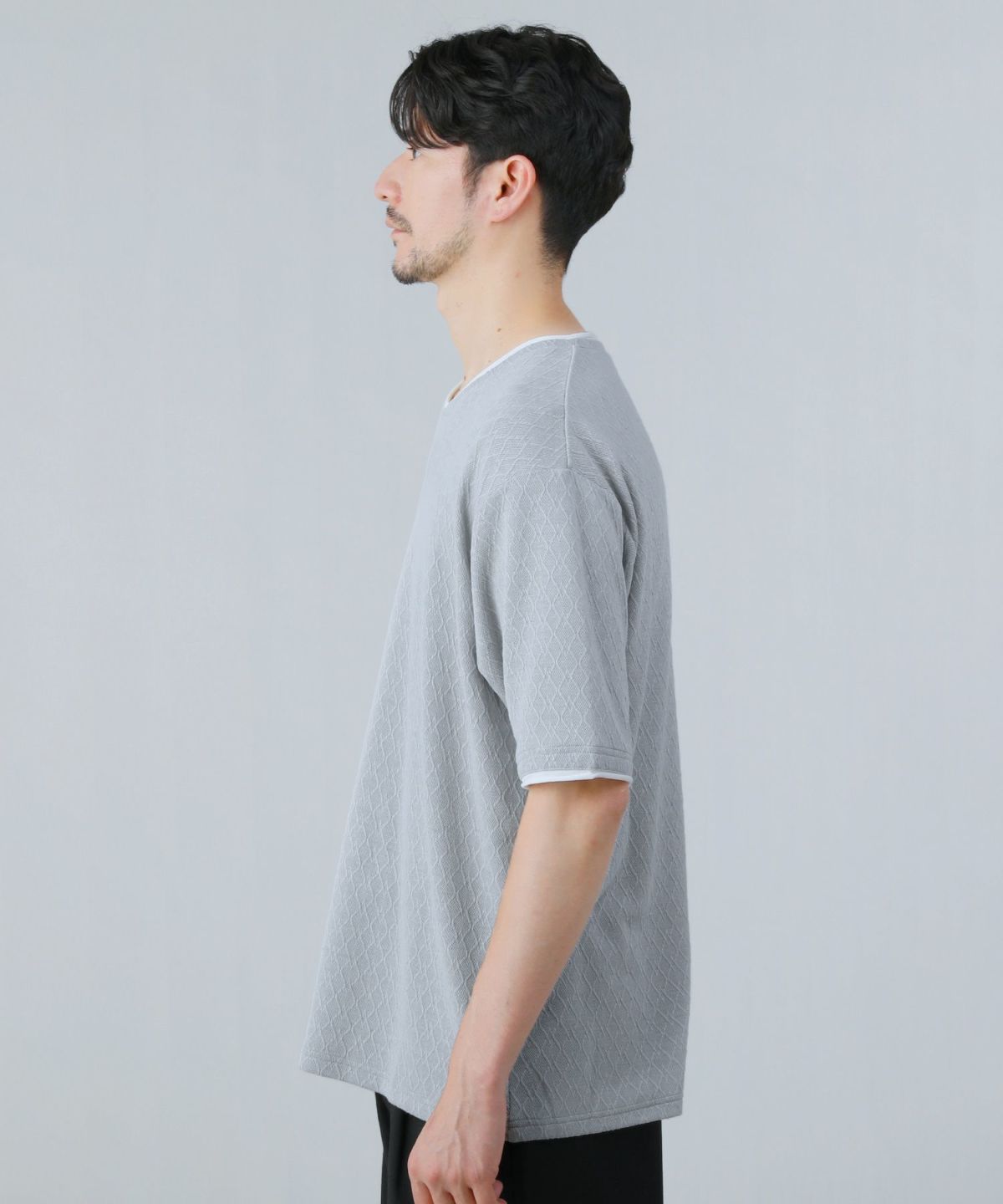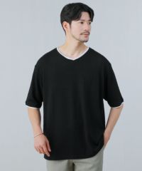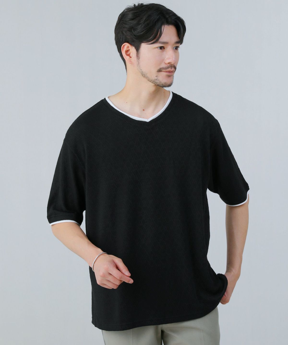 菱柄ジャガードフェイクレイヤードVネック半袖Tシャツ