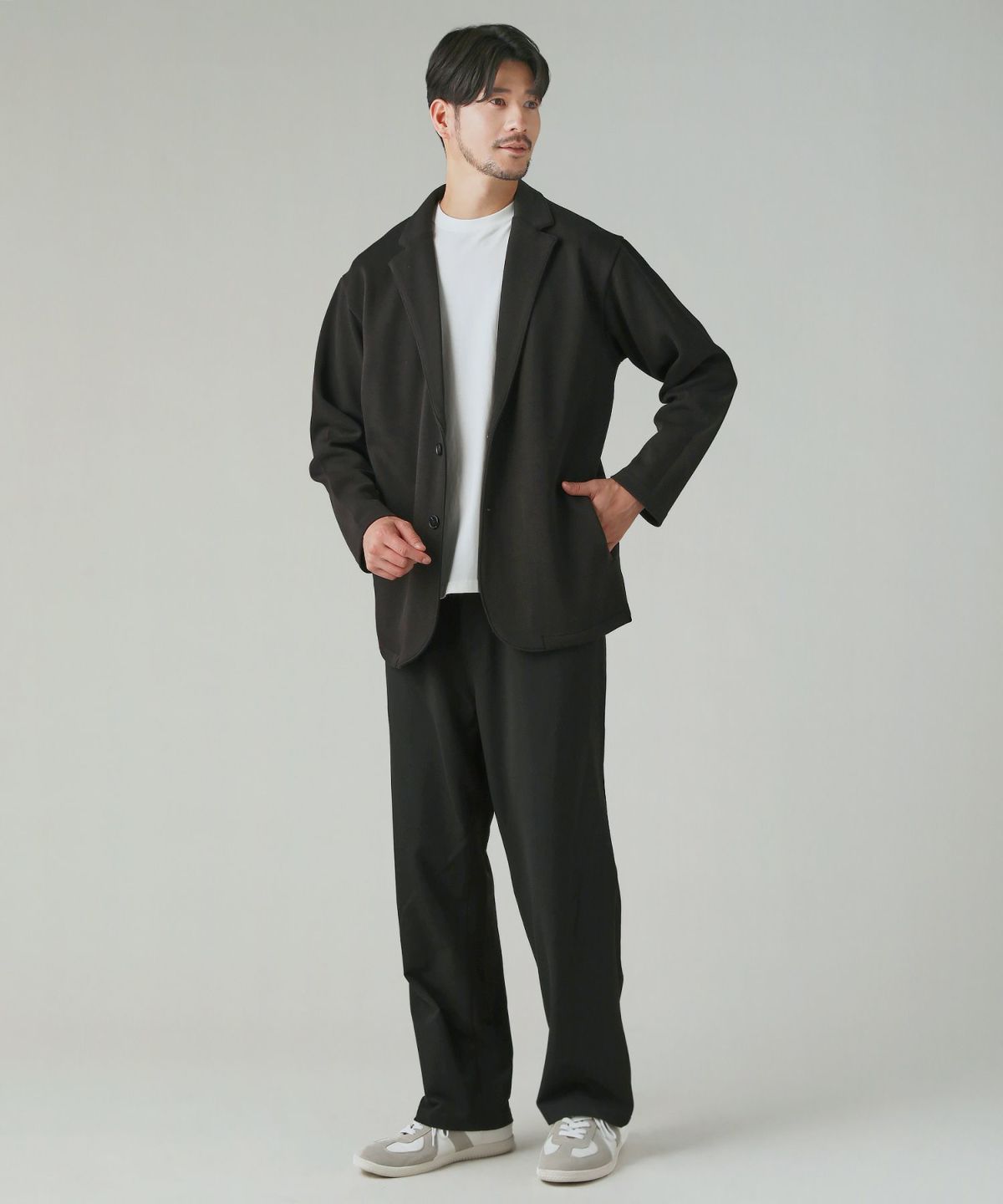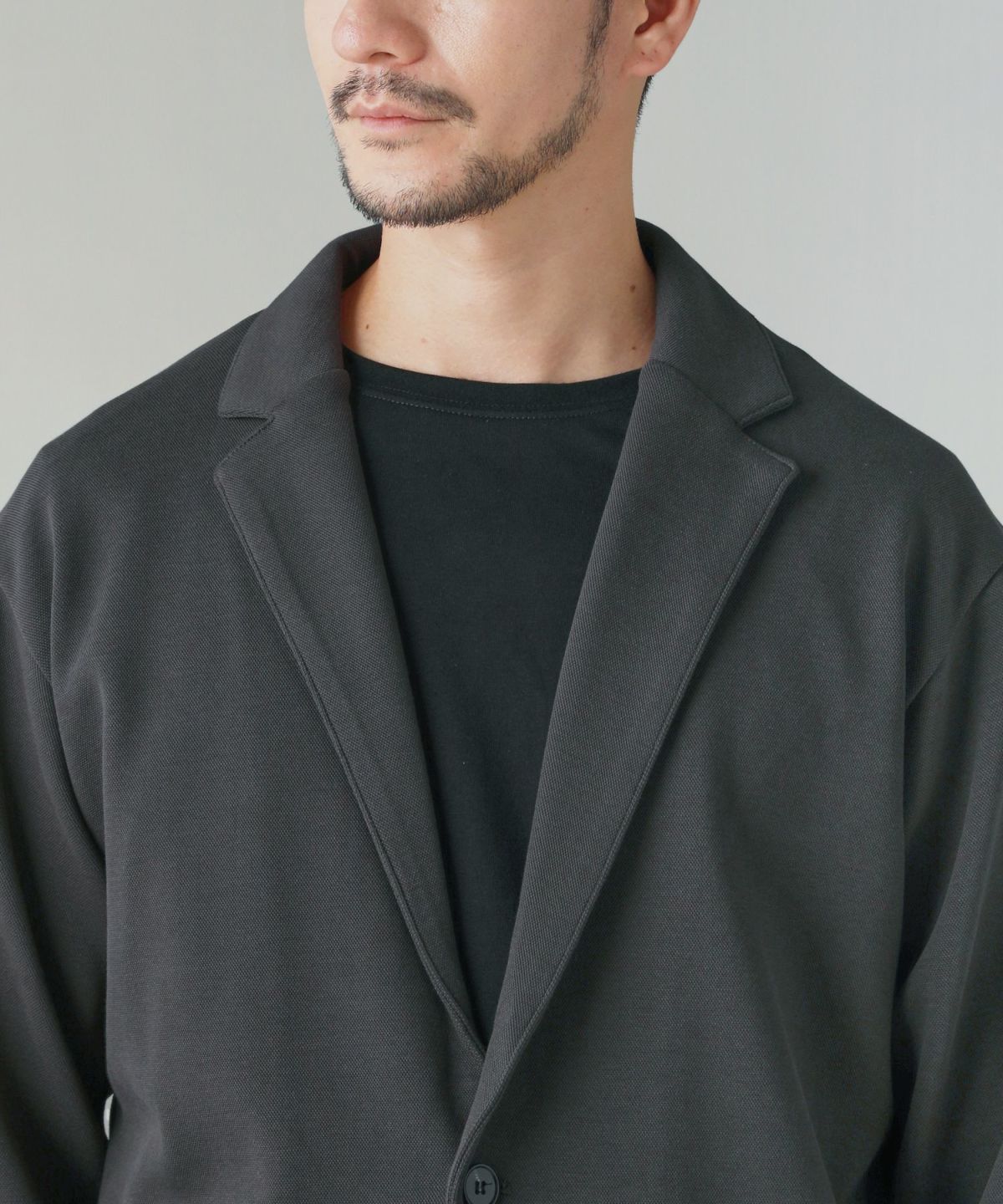 肩をしっかり落としたドロップショルダーにすることで、キレイめなテーラードジャケットを抜け感たっぷりにデザインしました。