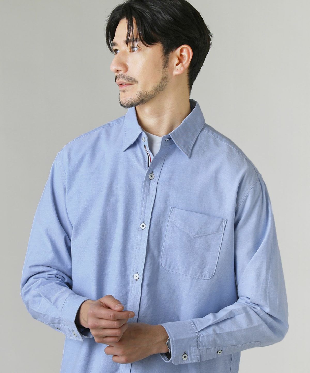 襟はキレイめにもカジュアルテイストにも合わせやすい、スタンダードなレギュラーカラーを採用しました。ボタンを開けたときに見える下前立ての配色ラインが、着こなしにお洒落なアクセントを添えます。ボタンにはブルーやグレーの付け糸を使用しており、細部にまでこだわったデザイン性が魅力です。さらに、前後差のある着丈がコーディネートに程よく抜け感をプラス。細身すぎない、ややゆとりを持たせたレギュラーシルエットで一枚着としてもインナーとしても使いやすいサイズ感となっております。