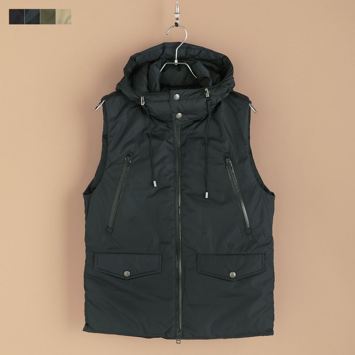 イタリアの最高級ナイロンと日本の生地メーカーがコラボした、一目でわかるほどの上質な艶感を誇るダウンベスト。首元はスナップボタンで覆うことができる、防寒性も備えた機能的な一着に仕上げました。フード部分は首回りのジッパーで脱着することが可能なので、シンプルなコーディネートにも使いやすいです。
