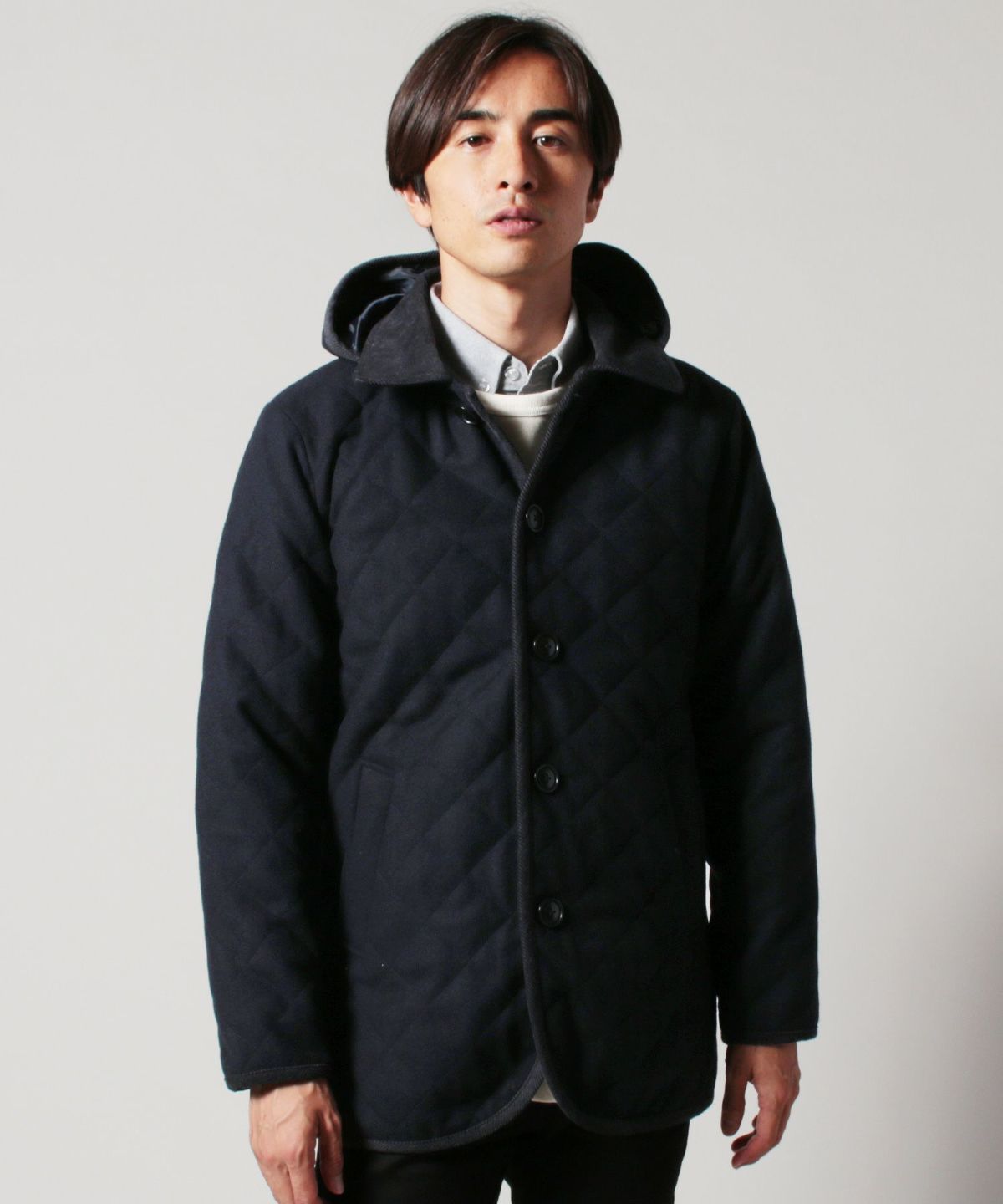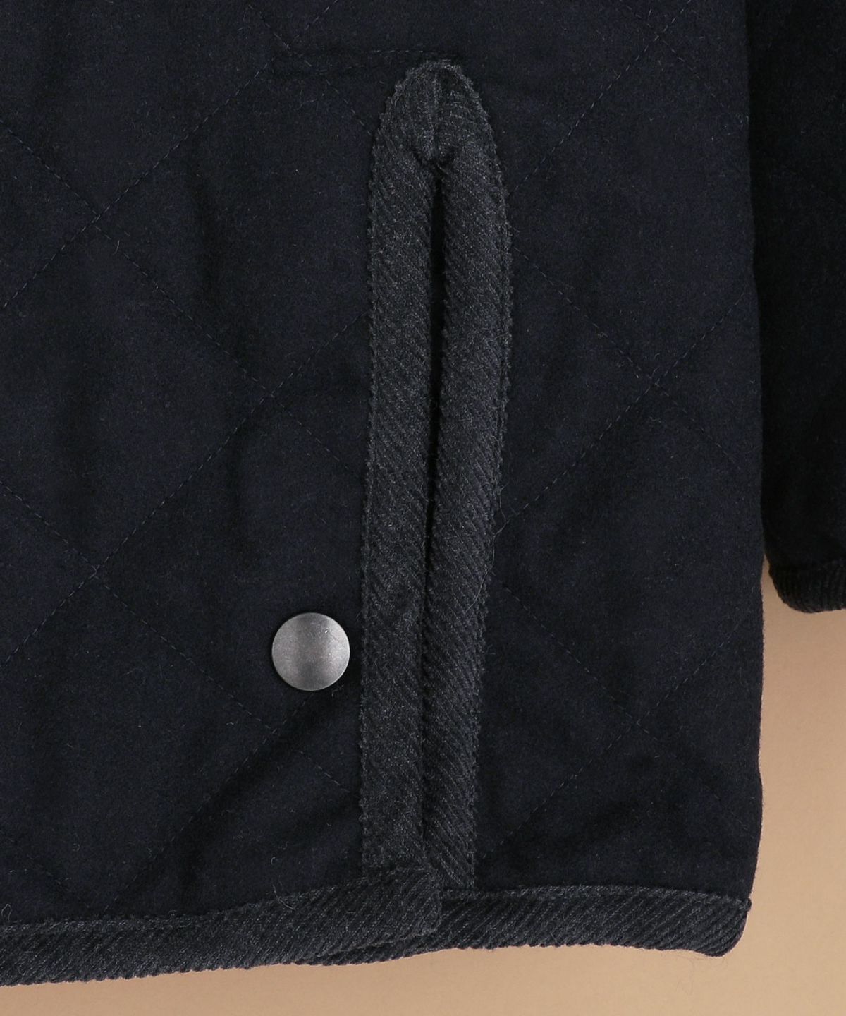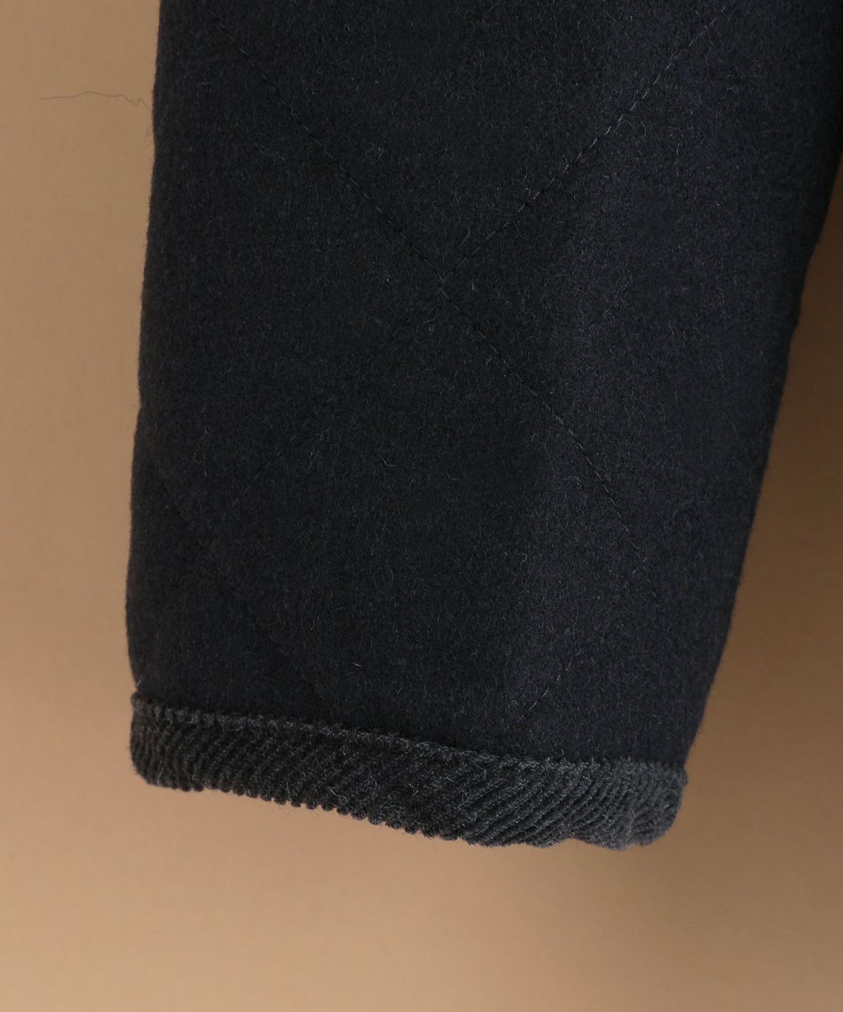 今回は148cm×100cm四方の重さが610gのメルトン素材を使用し、軽量かつ程よく厚みを持ったバランスの良い生地に仕上げました。更にキルティング加工を施し、保温性や耐久性もプラス。肌寒い季節でも確かな温もりを感じられる一着です。裏地にはサラッとしたポリエステル素材を100%使用。ニットなど厚手のトップスの上から羽織っても着脱がしやすく、ストレスフリーな着心地でお召しいただけます。
