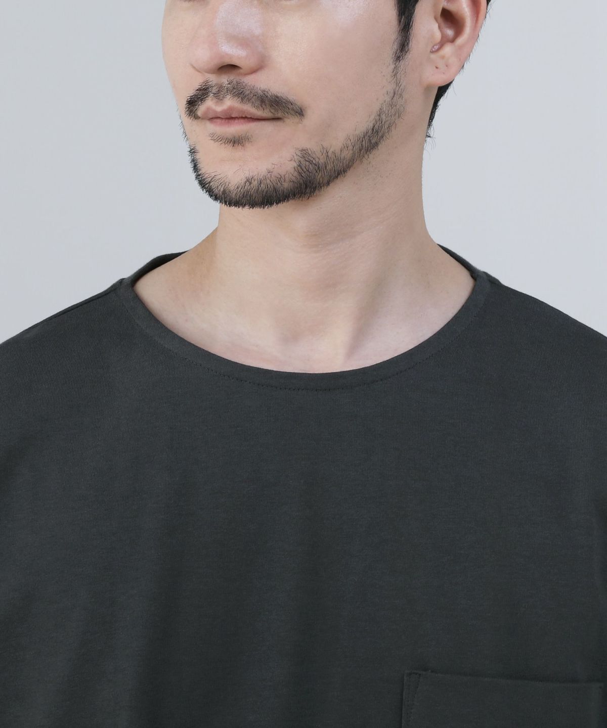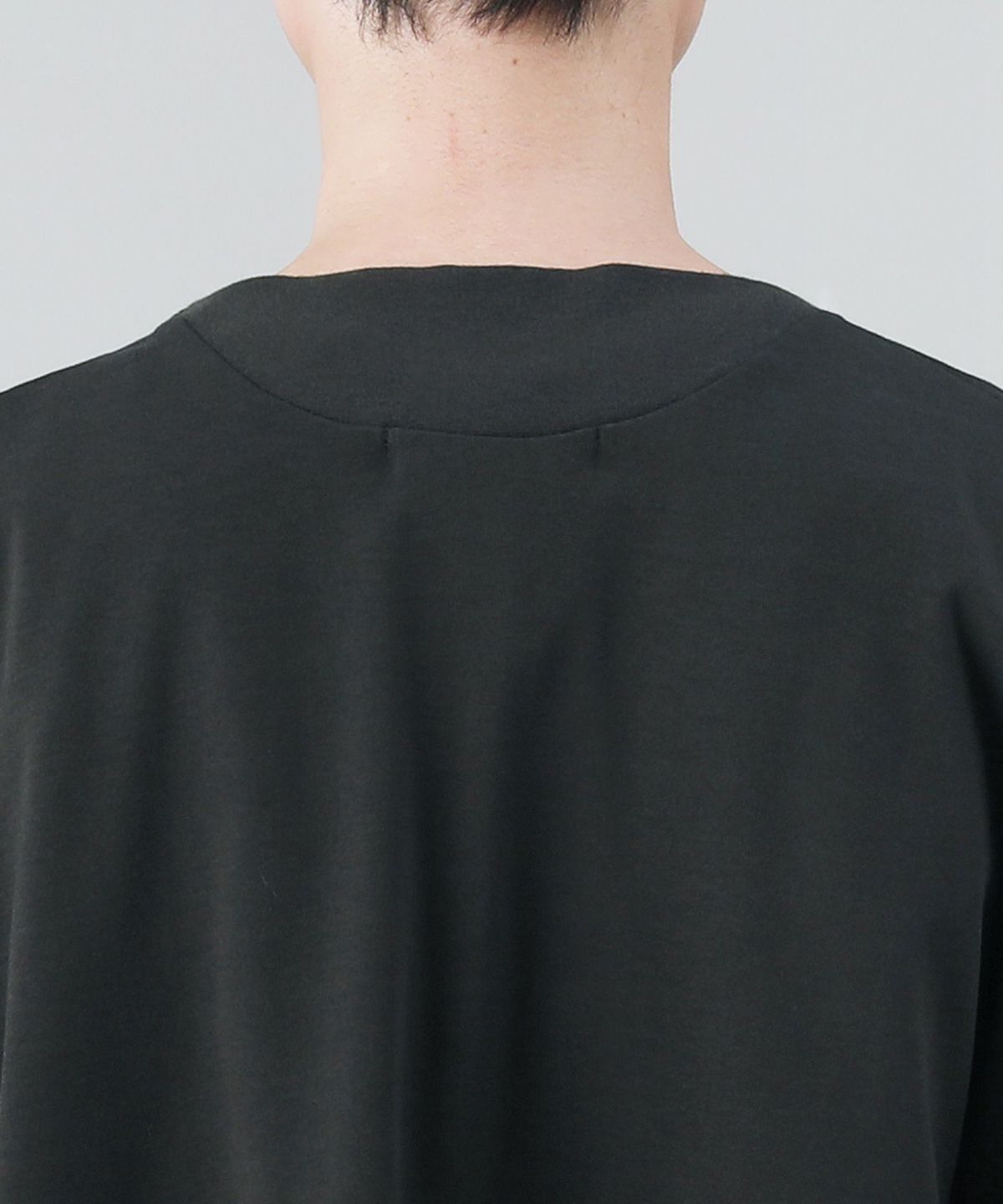 シルエットはビッグサイズのAラインを採用。シンプルな胸ポケットや深めに入ったサイドスリットがこなれ感を演出し、動きを軽やかに見せてくれます。また、前襟ぐりは折り返しデザイン、後ろの襟ぐりは深めのリブデザインとなっており、頭通りにも配慮した機能性とデザイン性の高さが目を引くアイテムです。