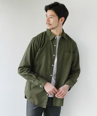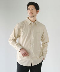 不規則な節を持つスラブ糸で織られた、表情のあるスラブ布帛生地を採用しています。陽にかざすと分かるような程よい透け感がある生地です。薄手な生地のため素肌の上から一枚で着用することには向いていませんが、汗ばむ季節の外出時の羽織りとして・冷房が効いた室内での体温調節用としても重宝します。ご自宅でもお洗濯が可能な綿ポリ混紡素材で日常的に着回しやすいシャツです。