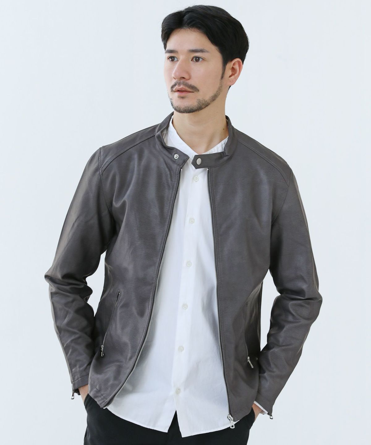 PUレザーを使ったジャケットにありがちなポケットやスタッズなどの装飾を最大限省き、コーディネートに取り入れやすいデザインに仕上げました。本革レザー同様の高級感とシンプルさを併せ持った、着回しやすさ抜群のアイテムです。
