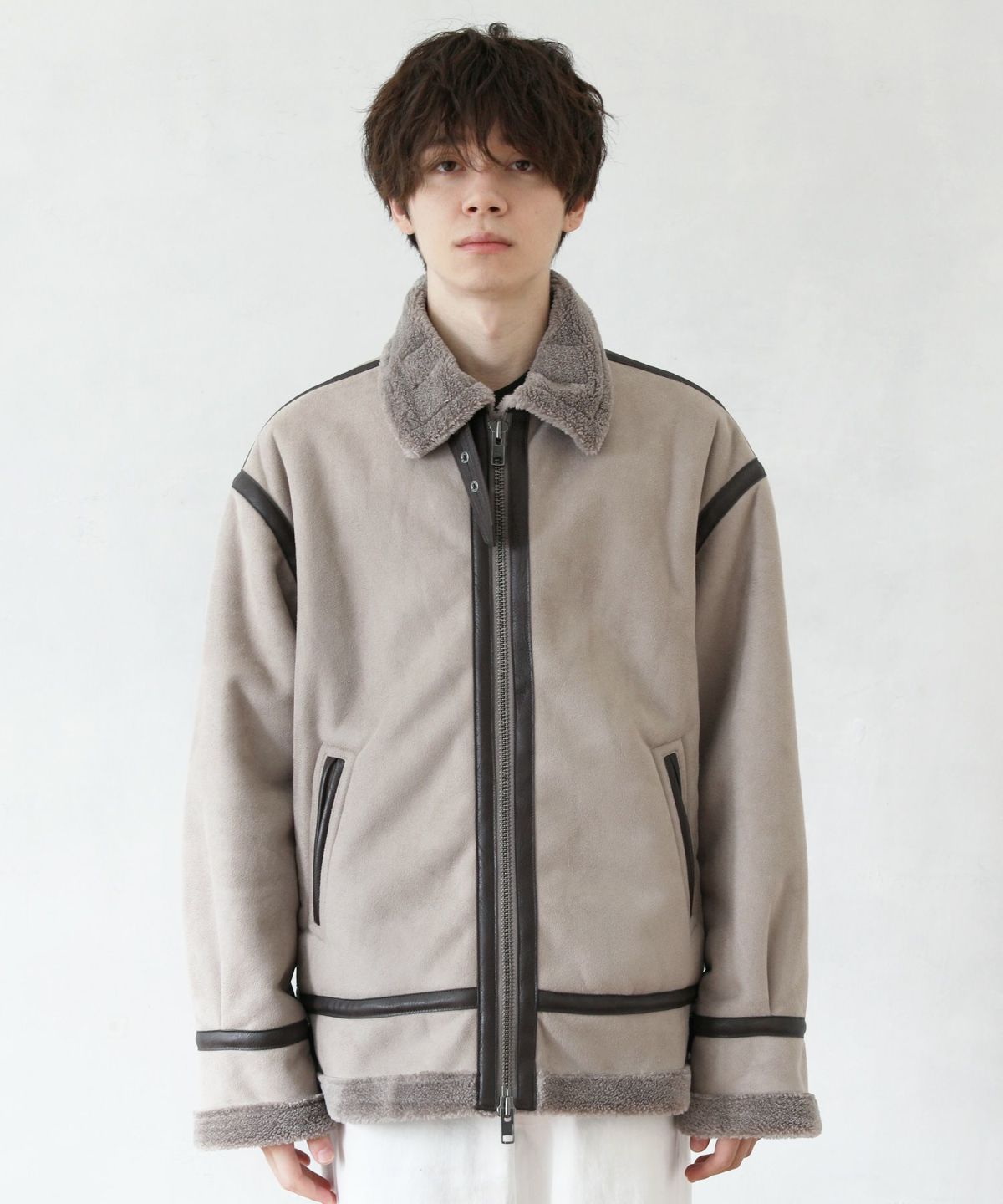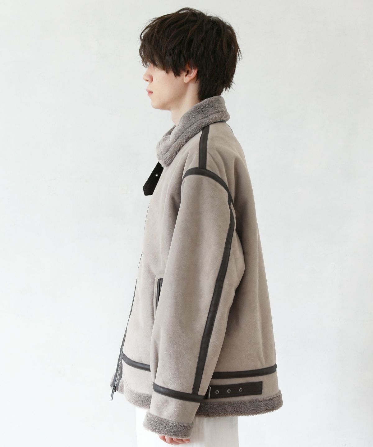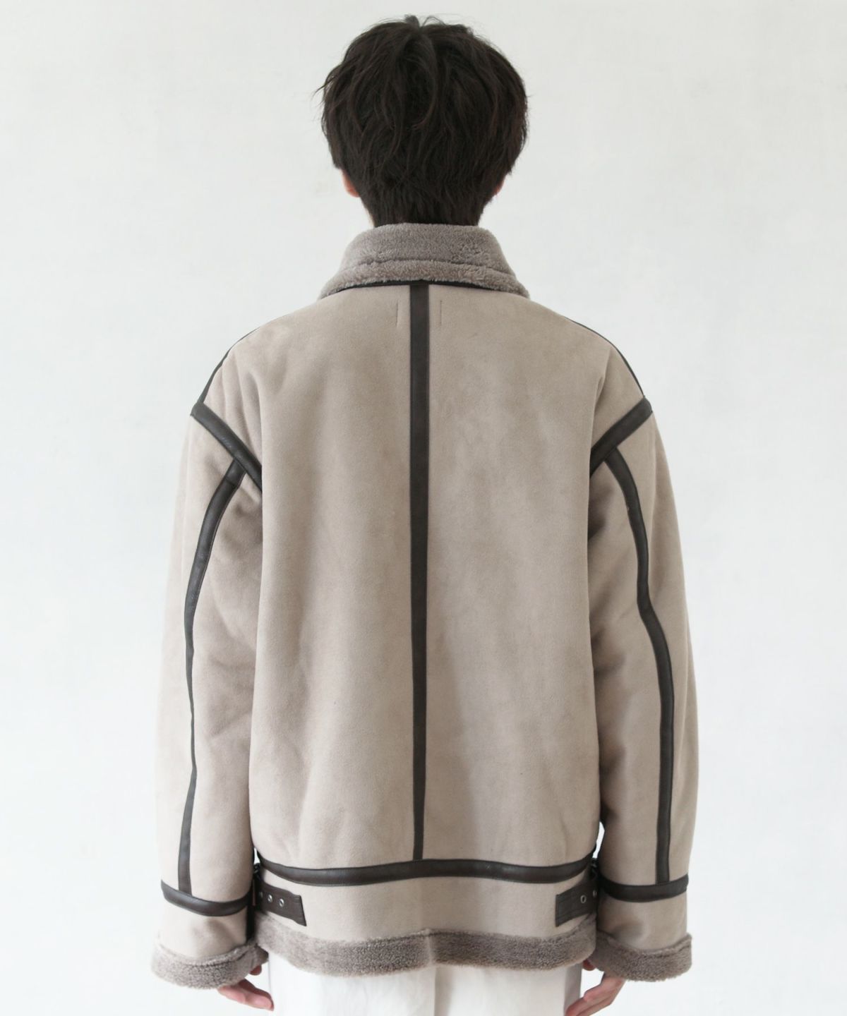 1930年代に登場したB-3フライトジャケットのデザインをベースにし、素材には繊細で高級感のある裏ボアエコムートンを採用しました。オーバーサイズのシルエットが程良いボリューム感を演出します。ボリューミーな見た目に反してその重さは軽量。長時間着ていても疲れにくい、着心地の良いアウターです。パイピングのデザインが目を惹くアクセントとなっています。