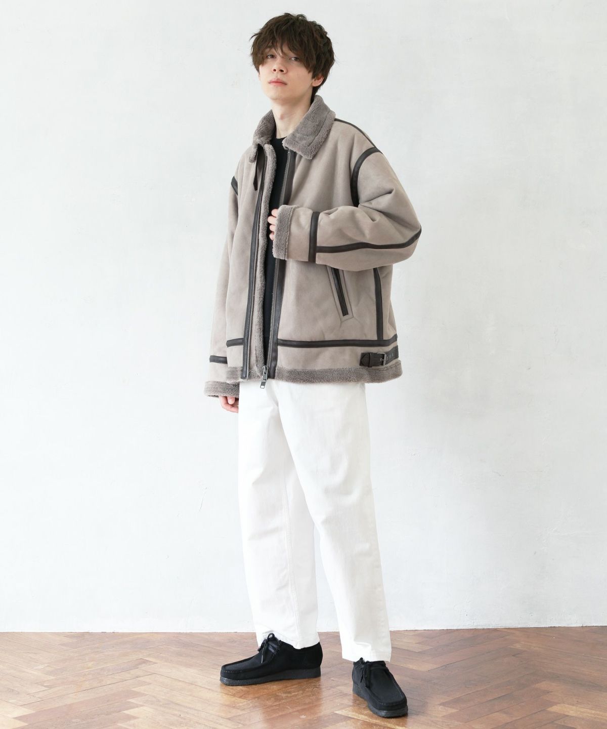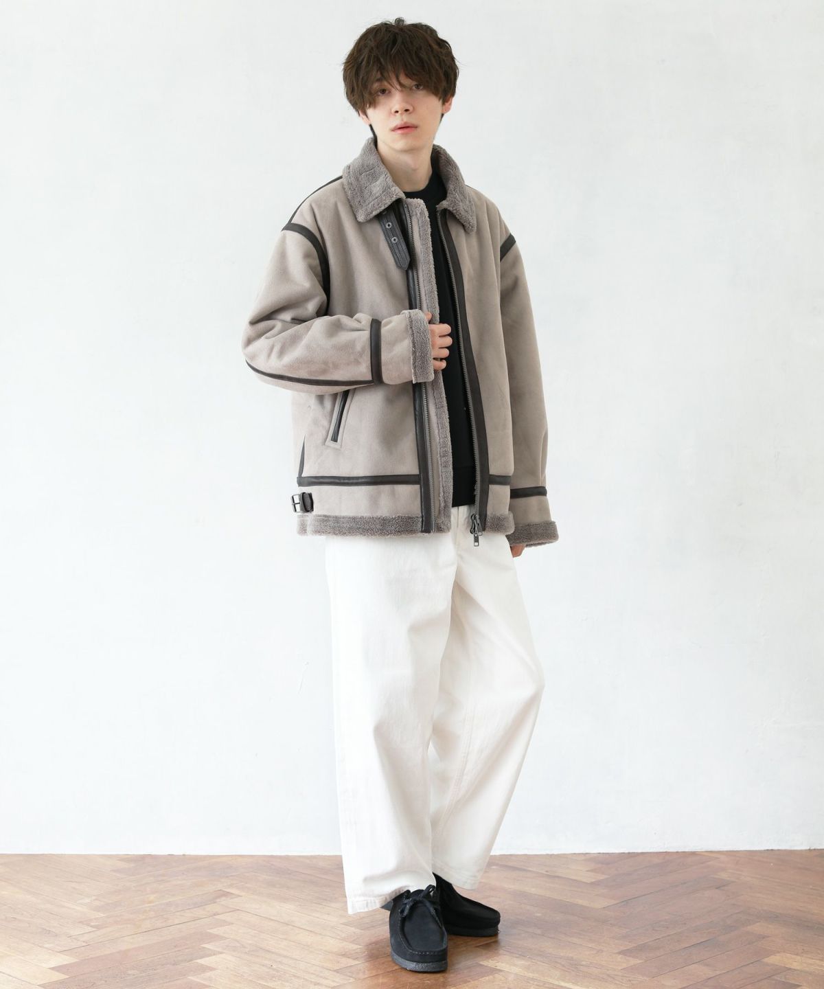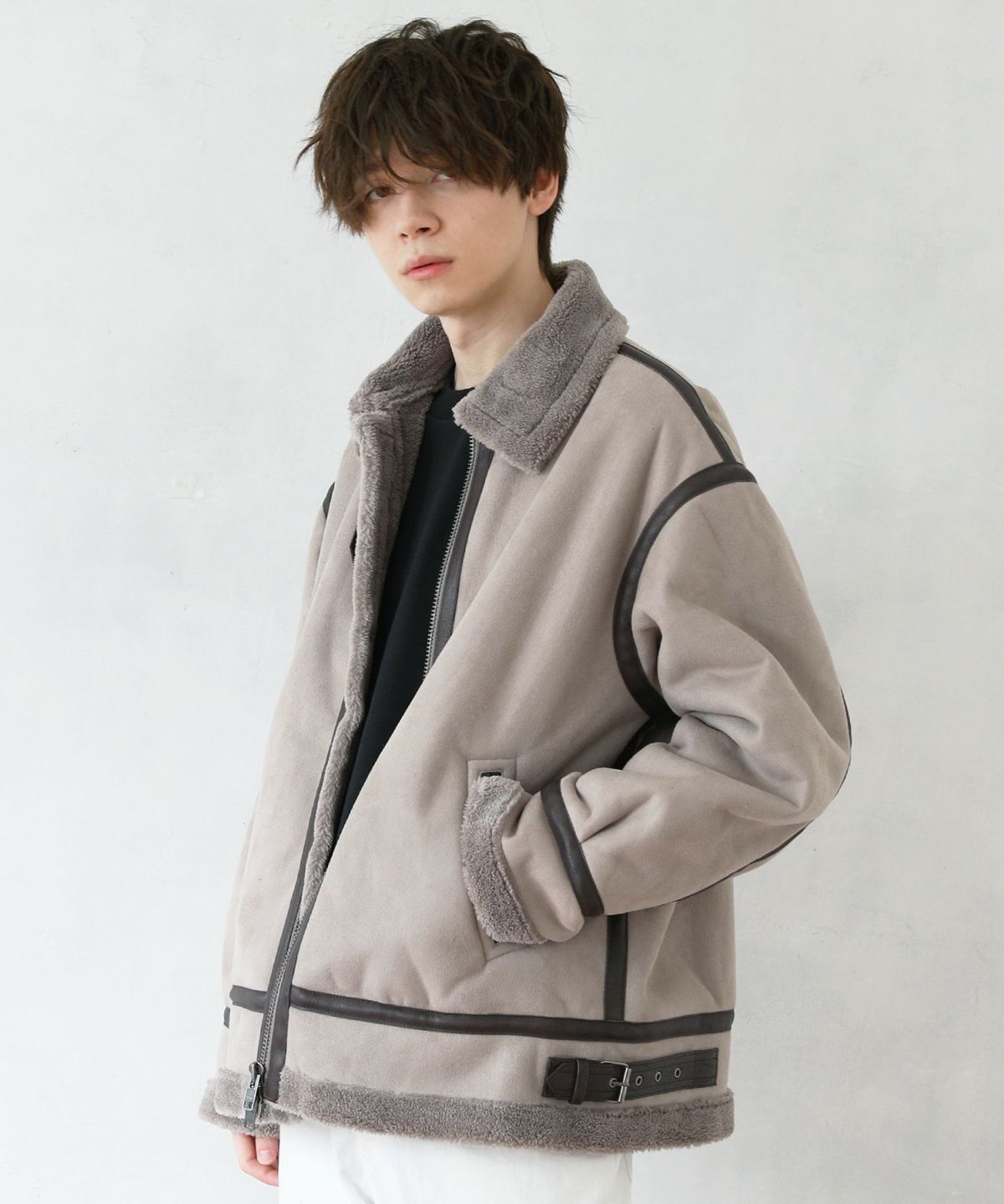 1930年代に登場したB-3フライトジャケットのデザインをベースにし、素材には繊細で高級感のある裏ボアエコムートンを採用しました。オーバーサイズのシルエットが程良いボリューム感を演出します。ボリューミーな見た目に反してその重さは軽量。長時間着ていても疲れにくい、着心地の良いアウターです。パイピングのデザインが目を惹くアクセントとなっています。