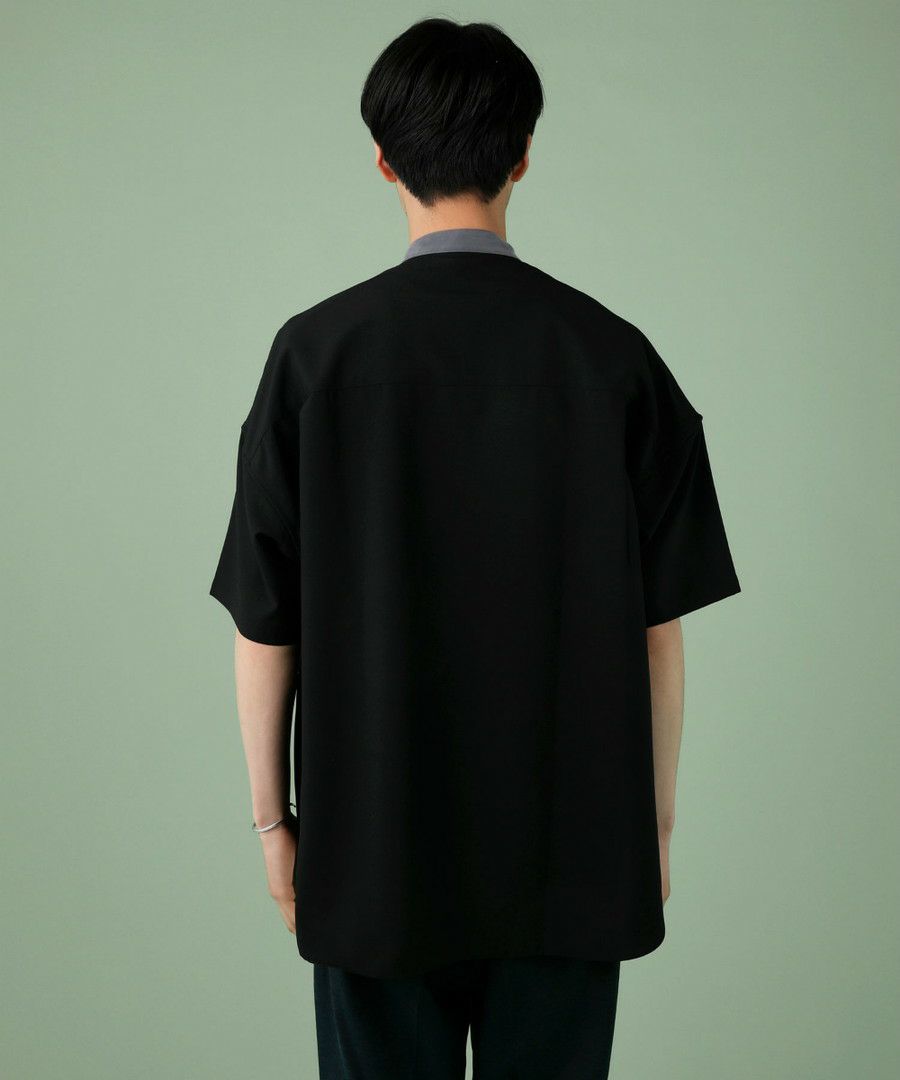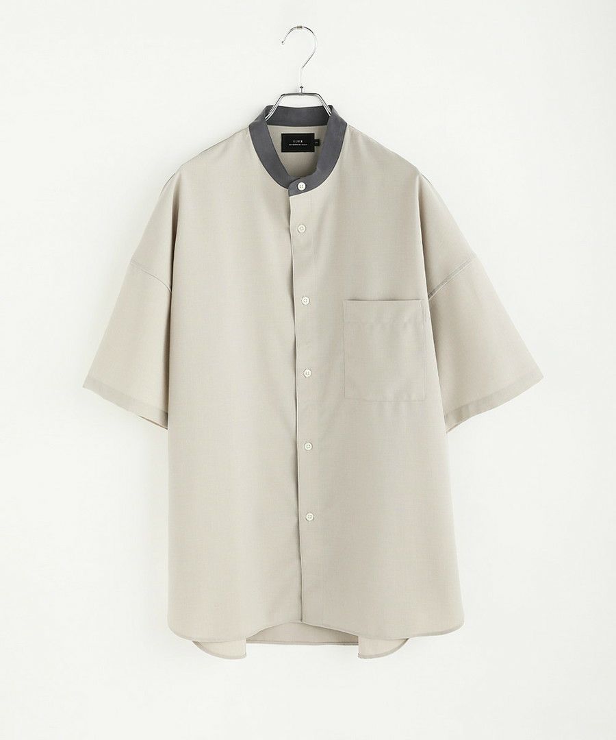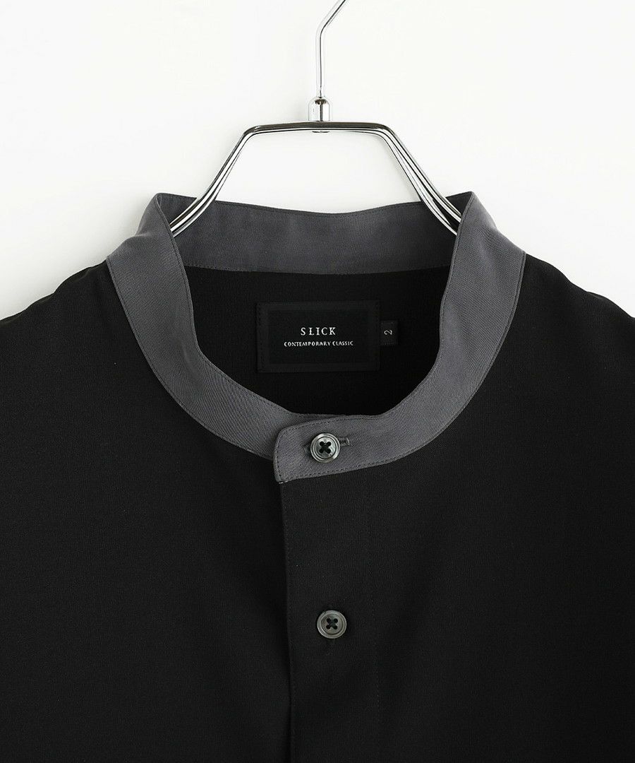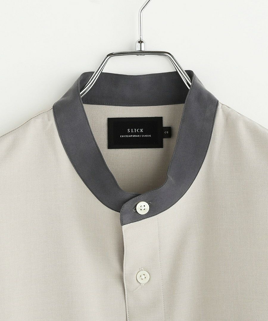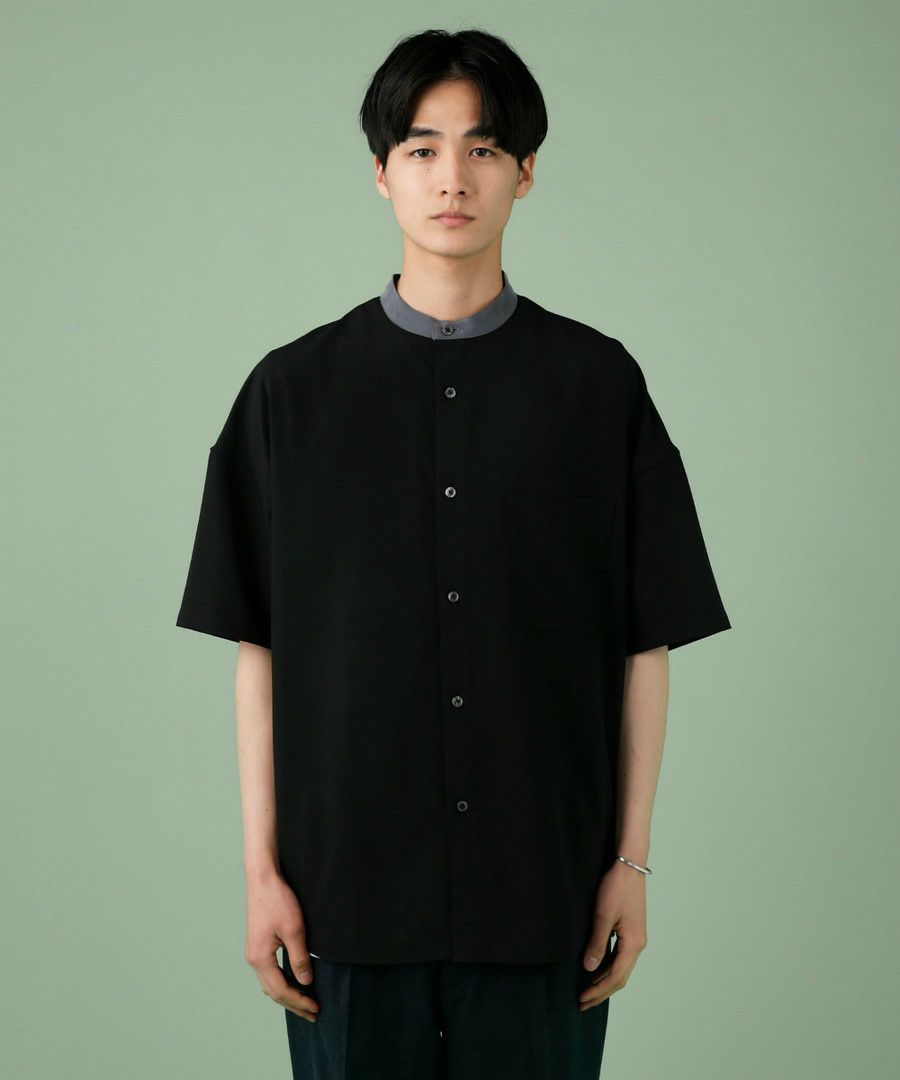 襟とボディで配色を変えたクレリック襟が特徴のオーバーサイズのバンドカラーシャツ。 素材感を生かすようにそぎ落としたミニマルなデザインですが、台襟の配色で単調になり過ぎない印象にまとめてくれます。 脇の縫い目は折伏せ縫いや、運針の細やかなステッチを採用したりと、縫製も丁寧に行った日本製です。