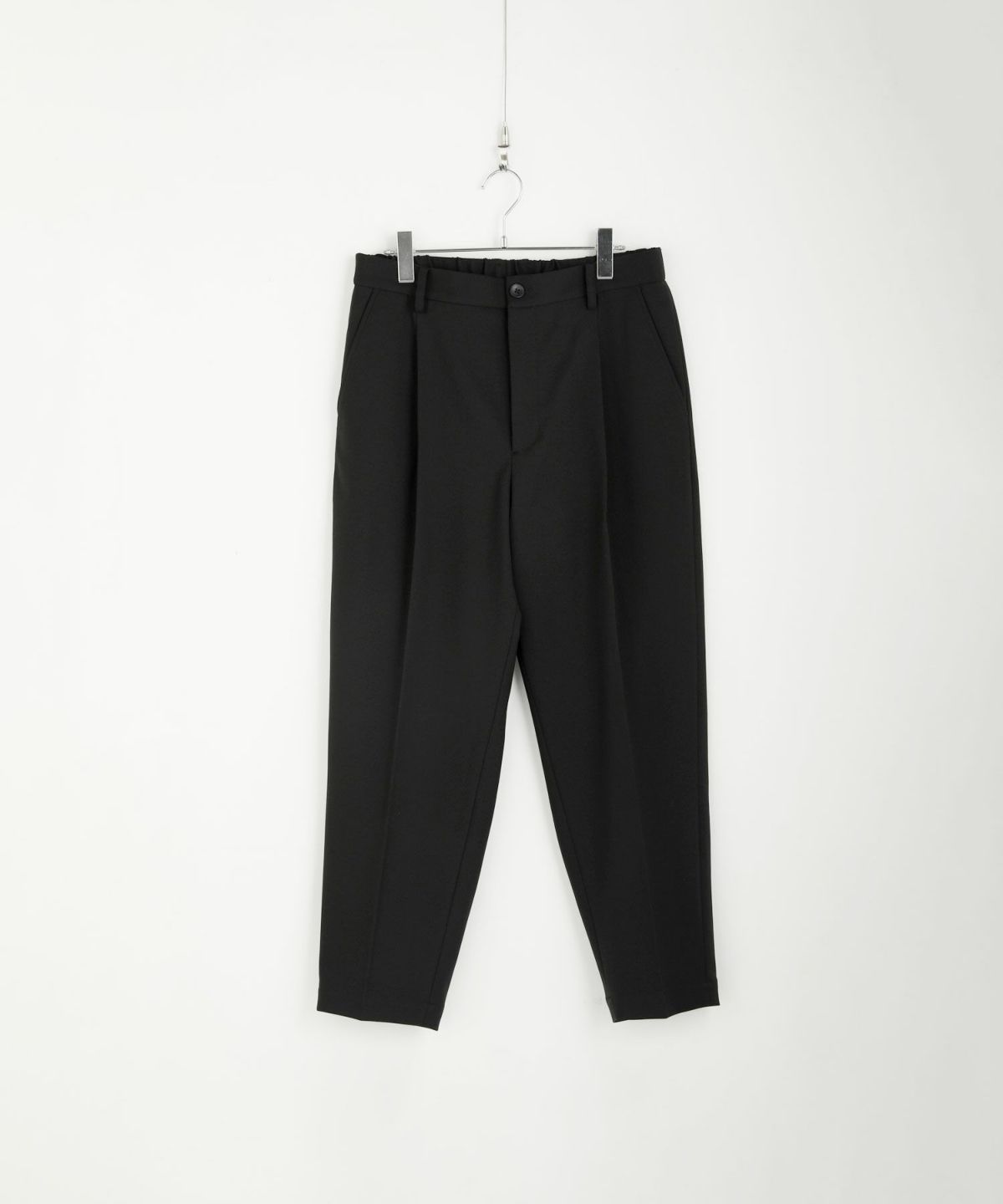 裾に向かって細くなるテーパードラインに、センタープレスを施した一本。ヒップから太股部分にゆとりがあり、程よい抜け感のあるコーデにまとまります。また、腰部分にゴムウエストを採用し、正面からの上品さはキープしつつ締め付け感がないリラックスアイテムに仕上がりました。