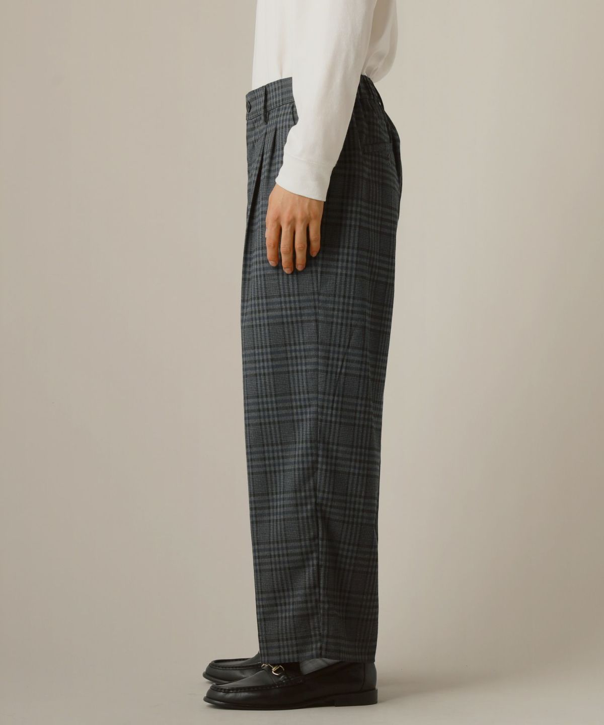 クラシックなチェック柄が目を惹くテーパードスラックス。フロントに2タックとセンタープレスを入れることで程よいボリューム感をプラス、抜け感のある上品な印象に仕上げました。落ち着きのあるダークトーンのチェック柄なので、カジュアルさの中にも大人の雰囲気を醸します。