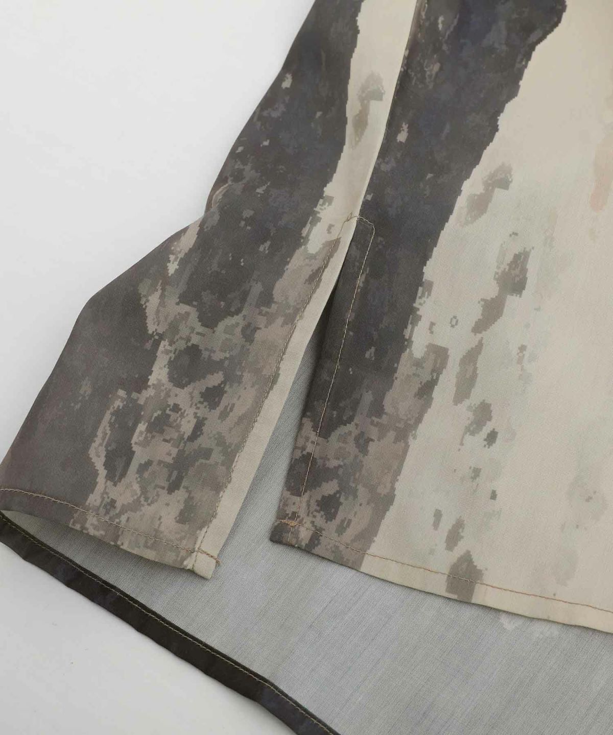 インパクトのあるアブストラクト柄が印象的なドルマンスリーブシャツ。抽象的な大柄のモチーフが印象的で、一枚着でも存在感のあるアイテムです。深い青のネイビー、シックな雰囲気のグレーベージュの2色の展開。派手過ぎない色合いで趣きあるコーディネートができるので、ラフな装いやカジュアルに決めたい時もワンポイントとして役に立つ一着です。