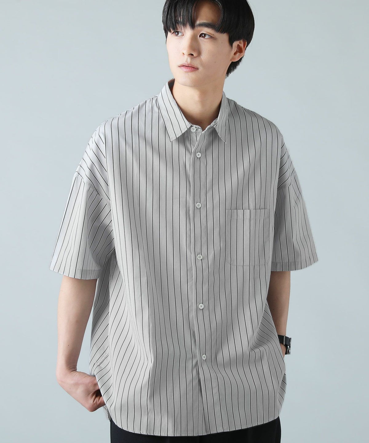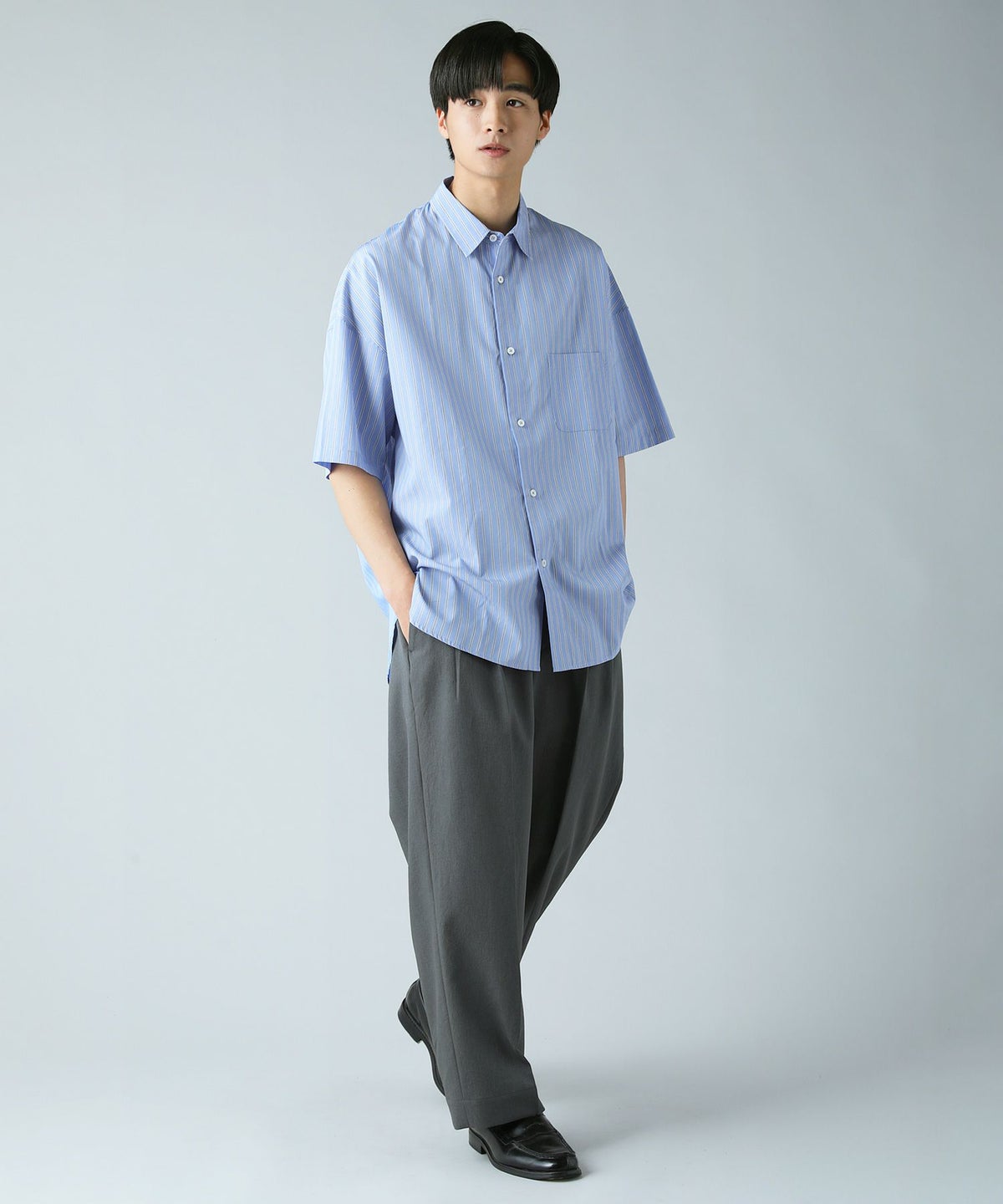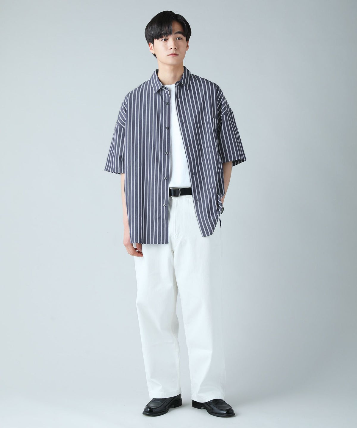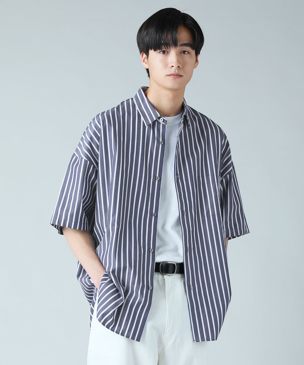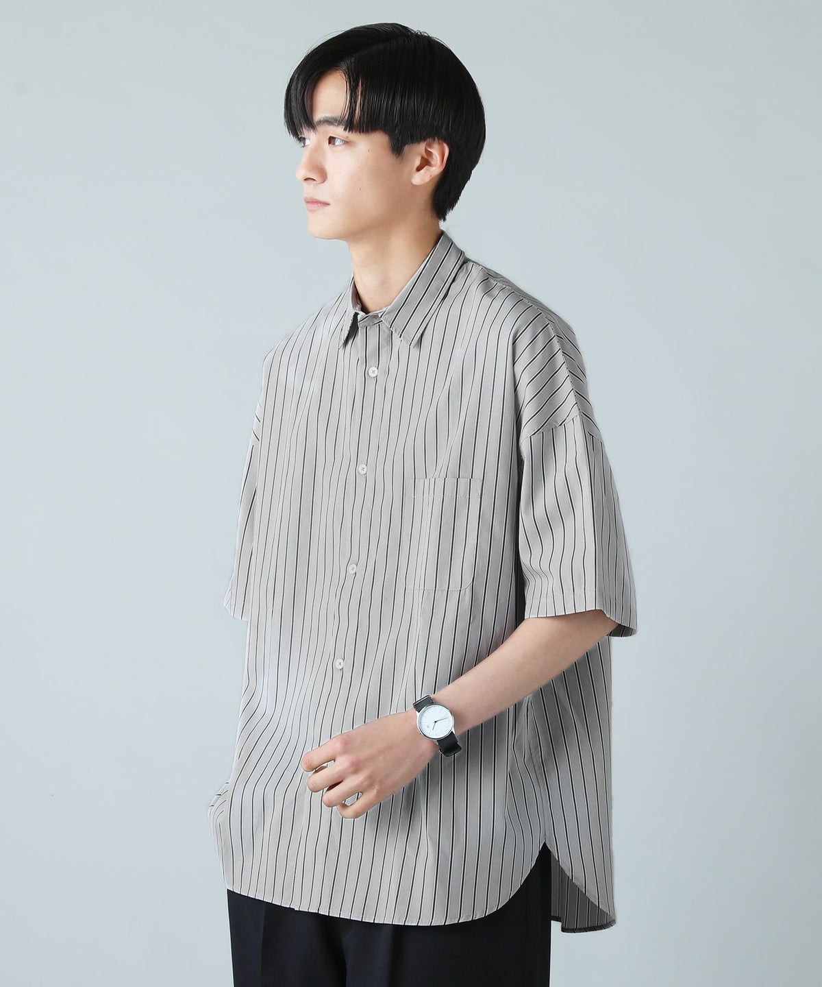 ハイカウントストライプドロップショルダー半袖シャツ