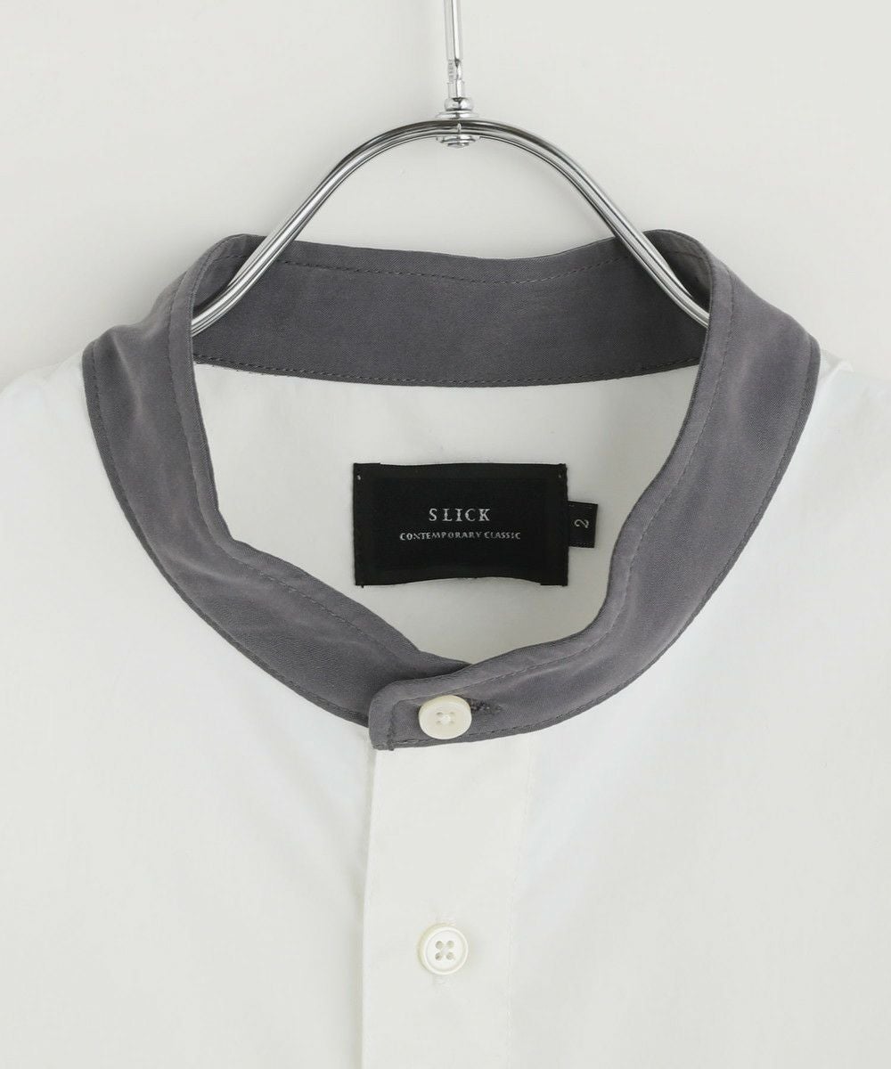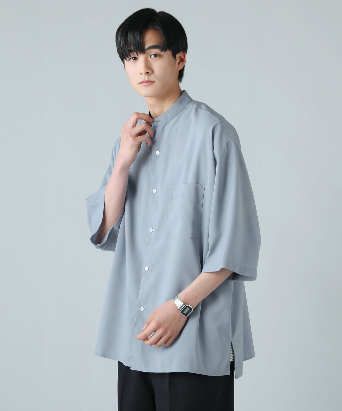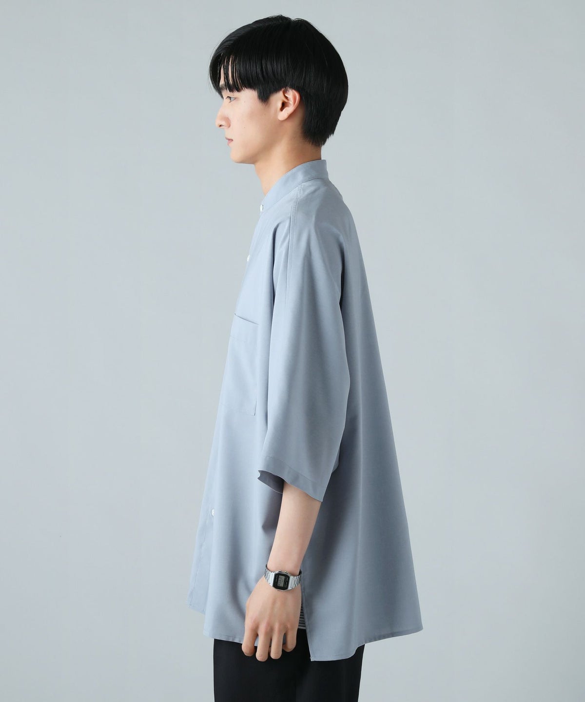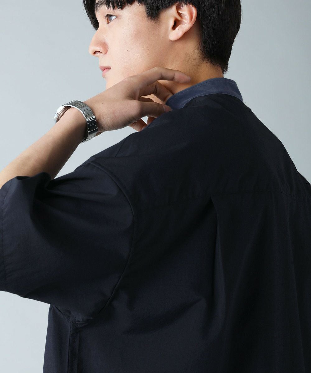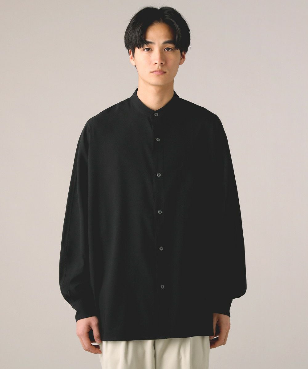 ドロップショルダー半袖バンドカラークレリックシャツ
