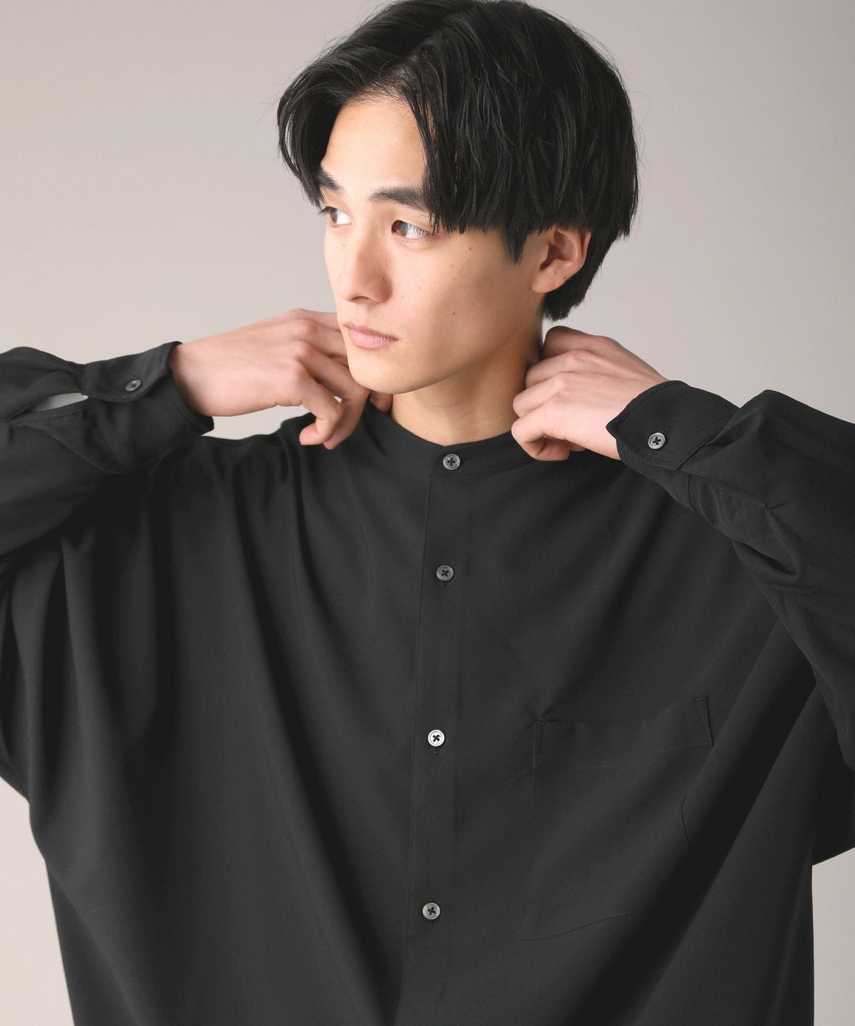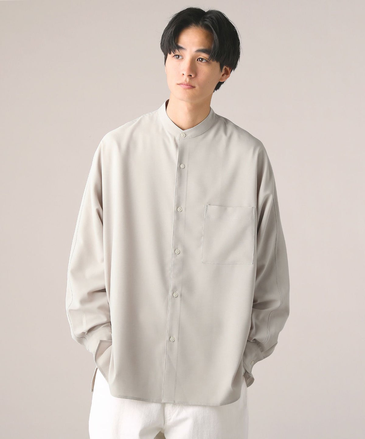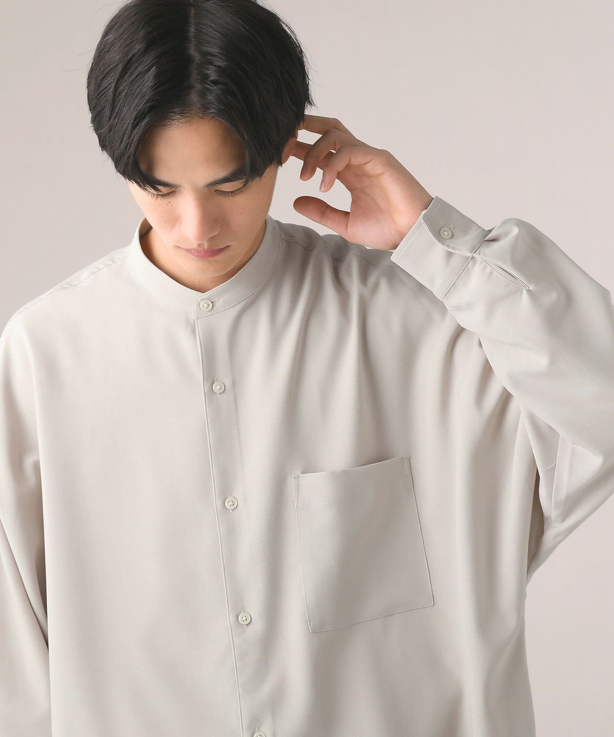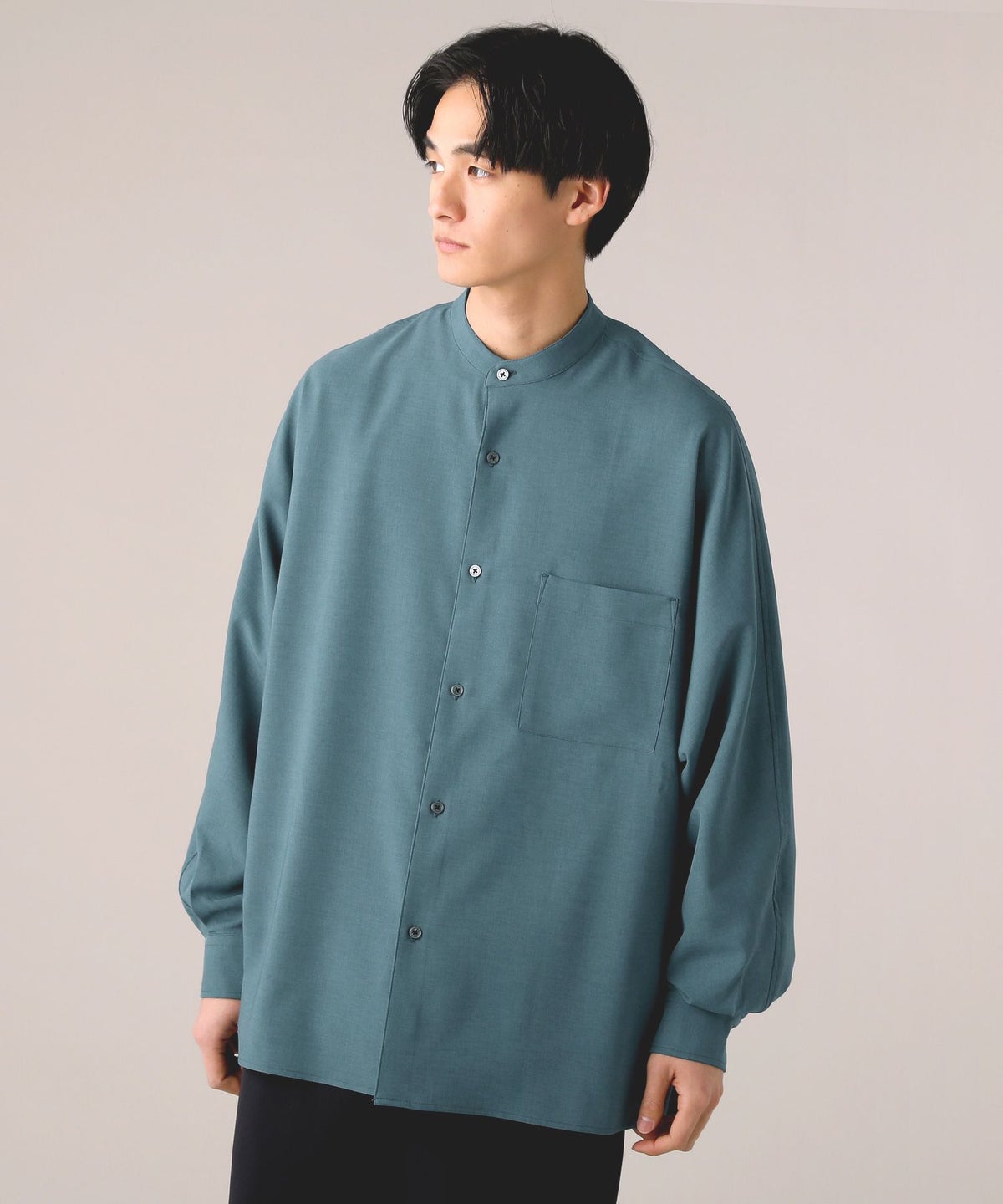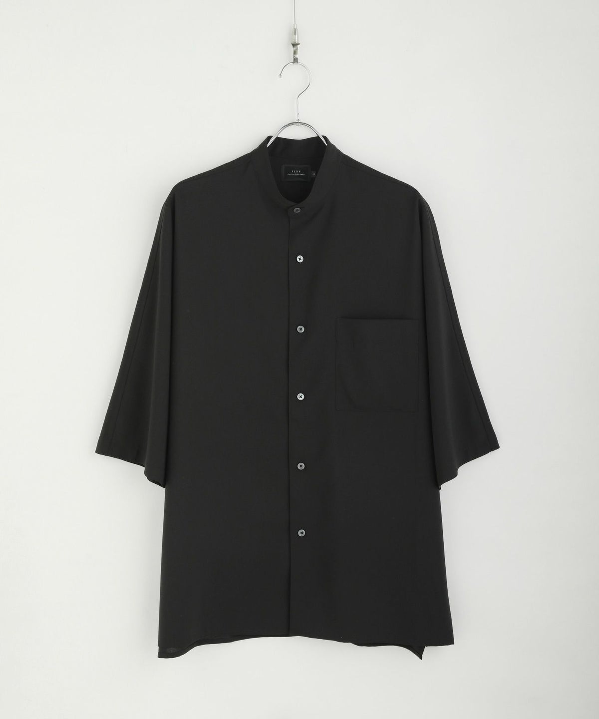 ドロップショルダー半袖バンドカラークレリックシャツ