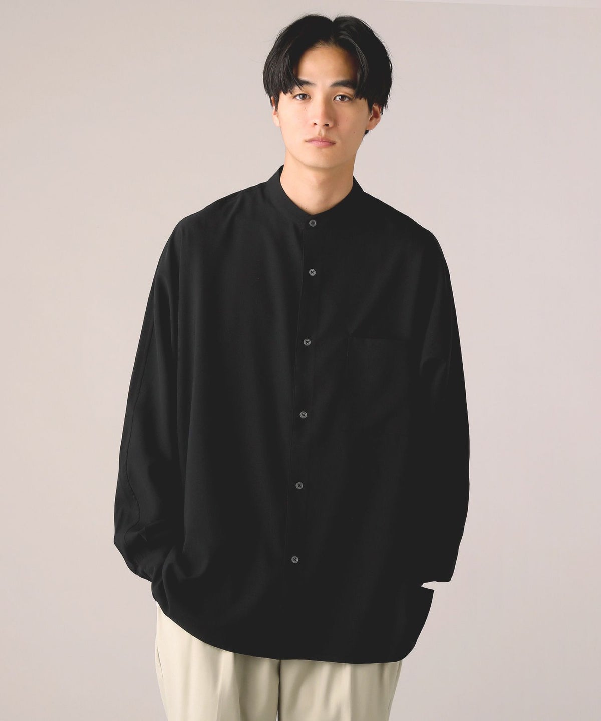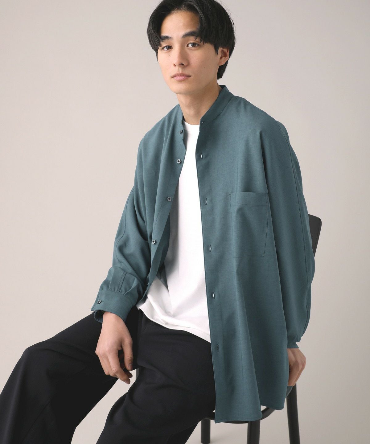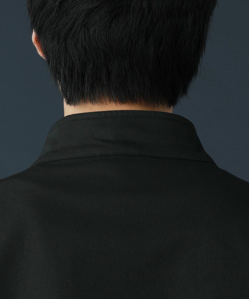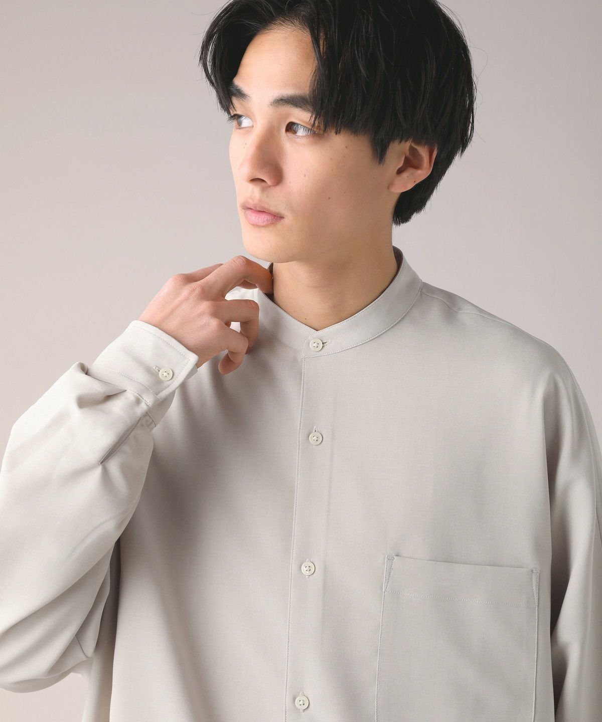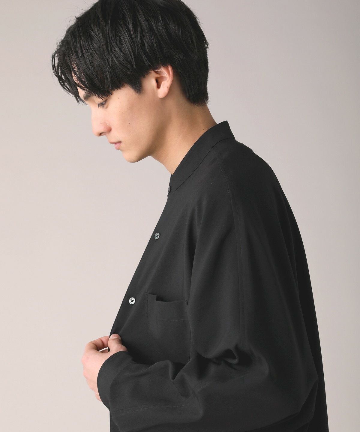 ドロップショルダー半袖バンドカラークレリックシャツ