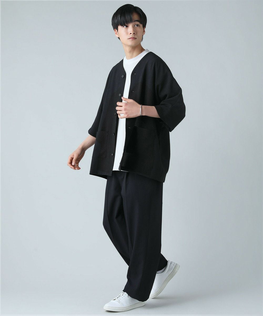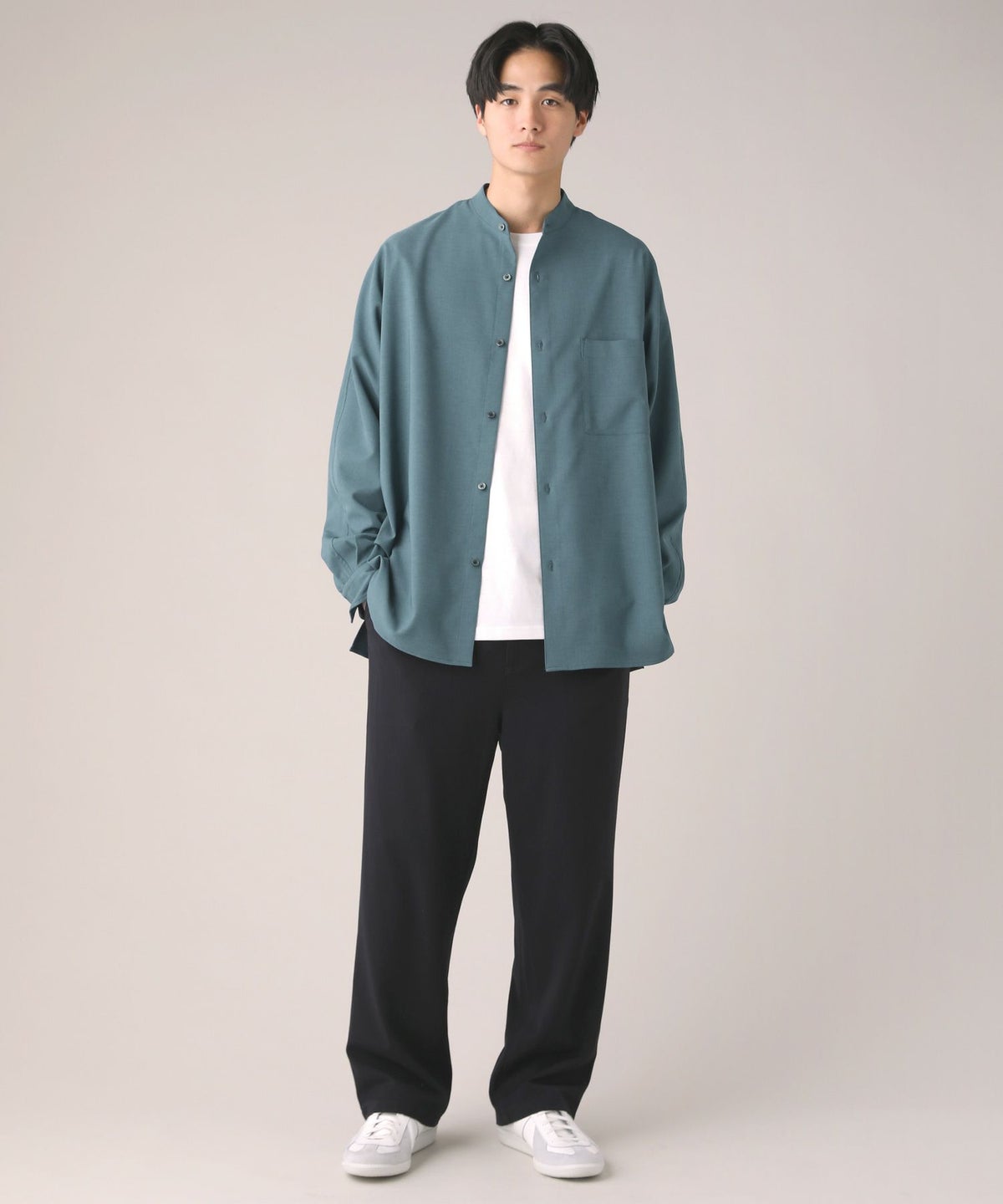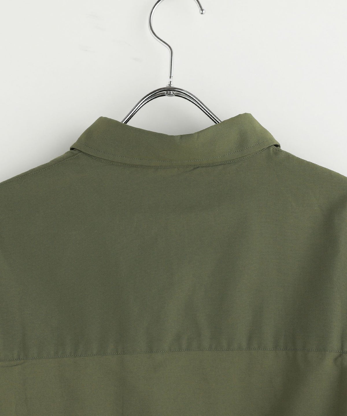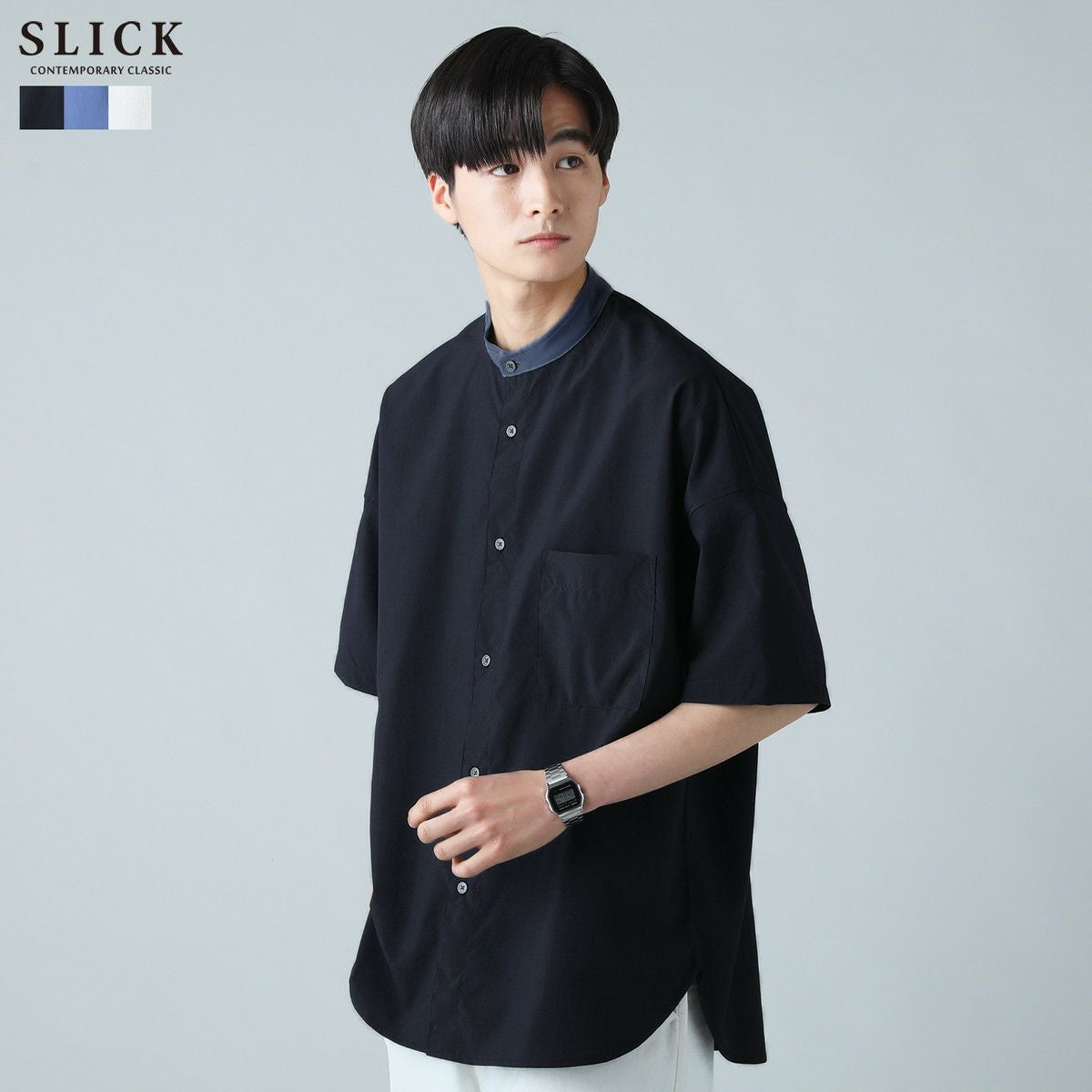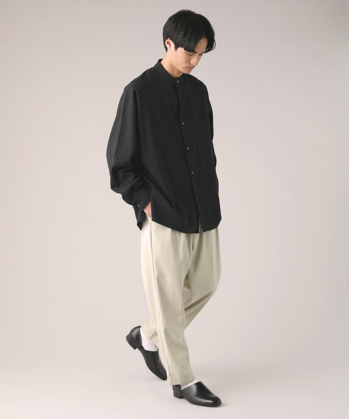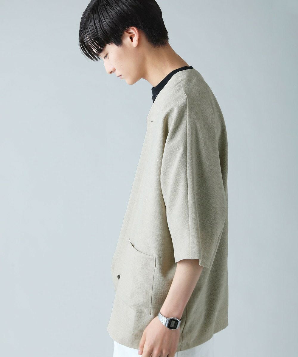 ドロップショルダー半袖バンドカラークレリックシャツ