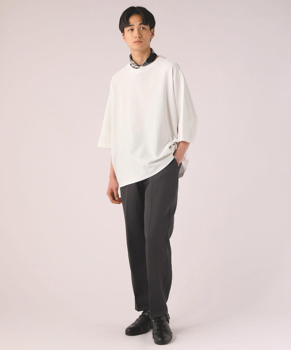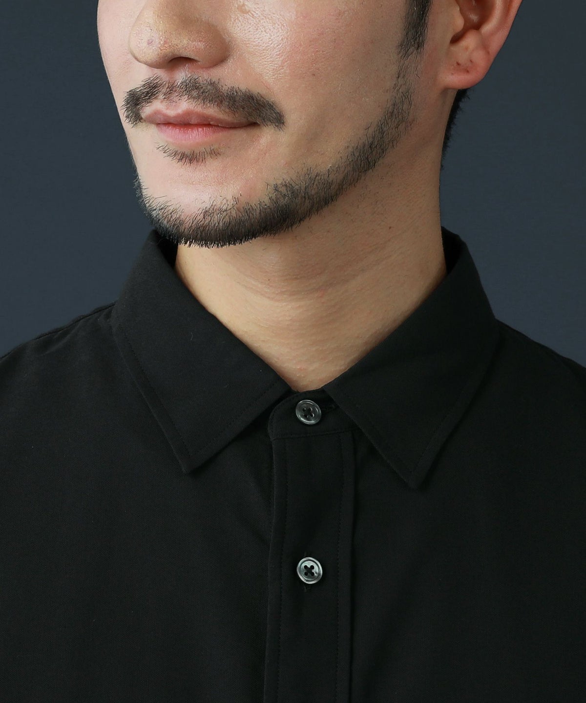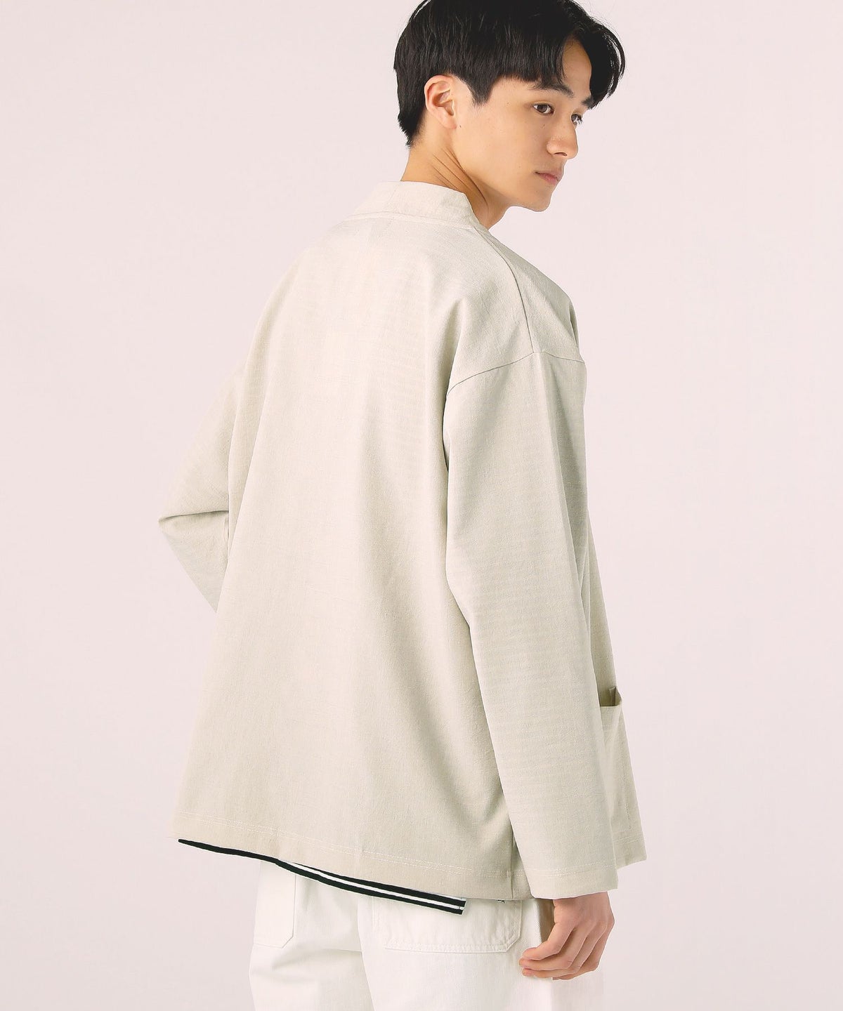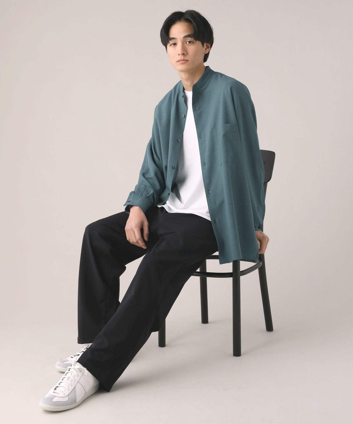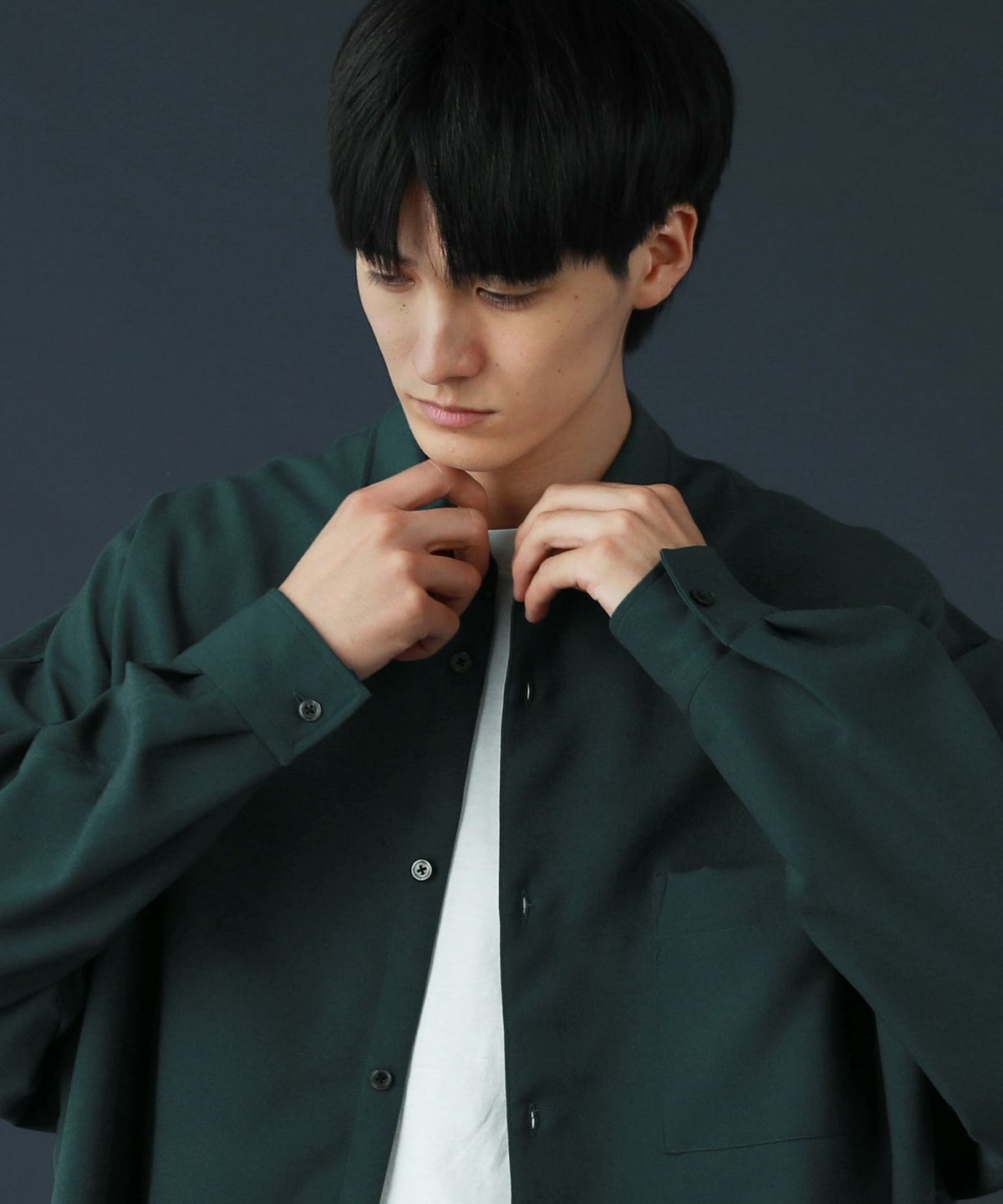 ドロップショルダー半袖バンドカラークレリックシャツ
