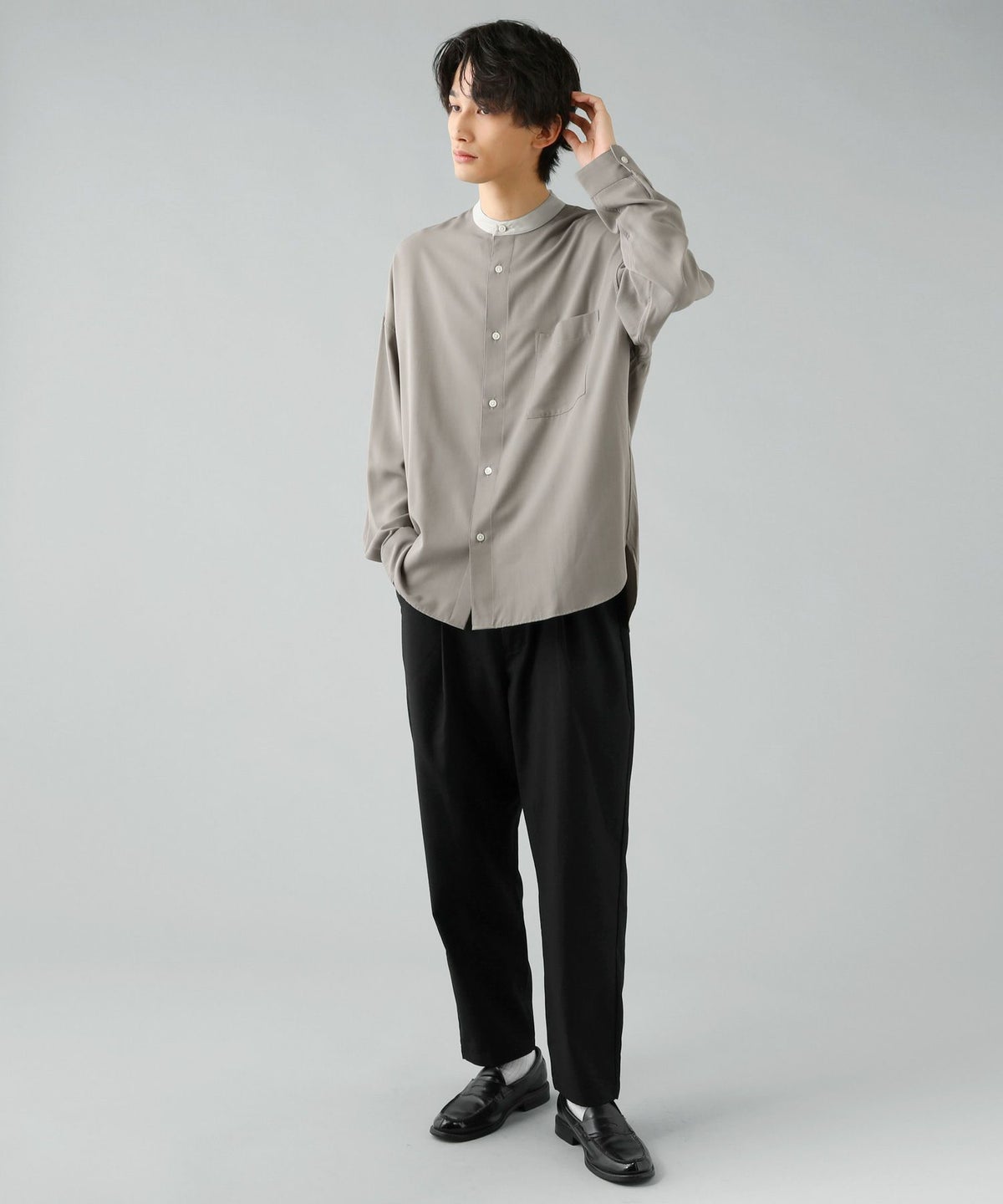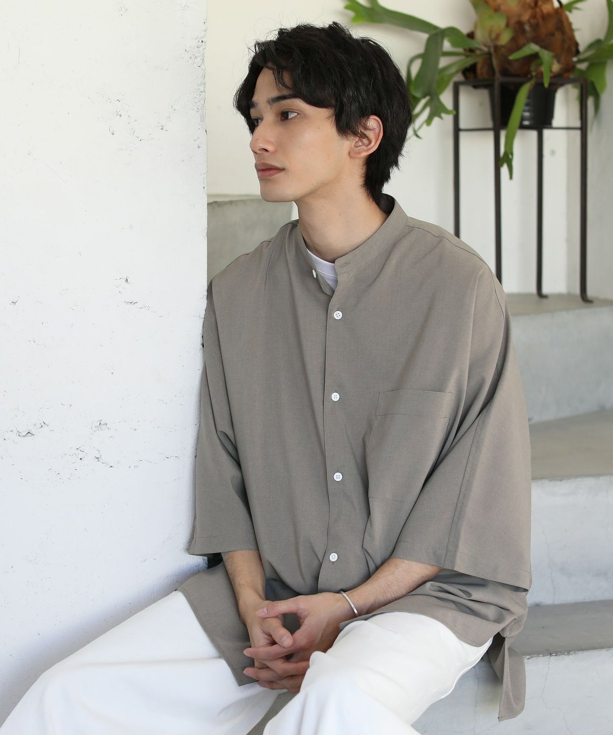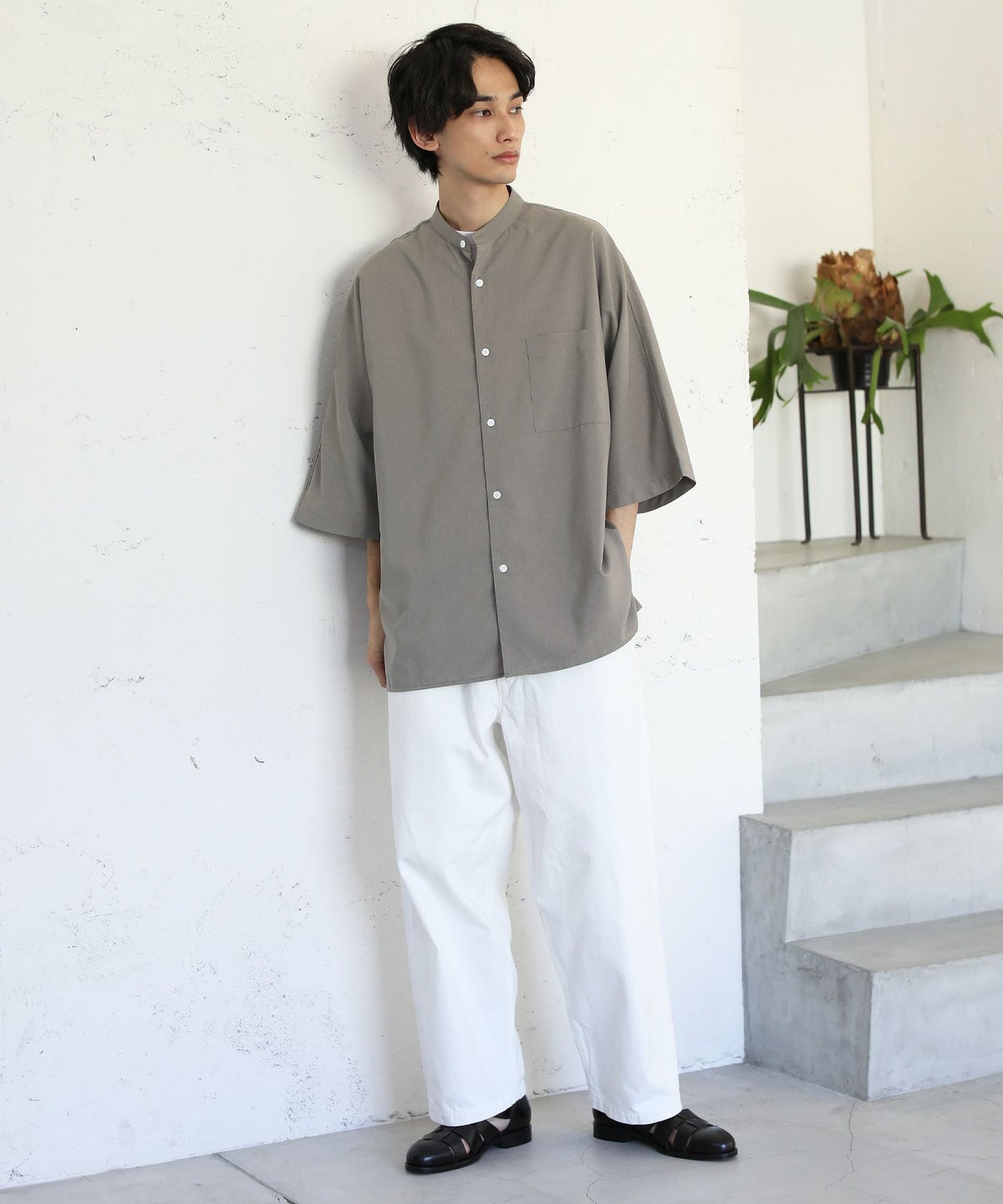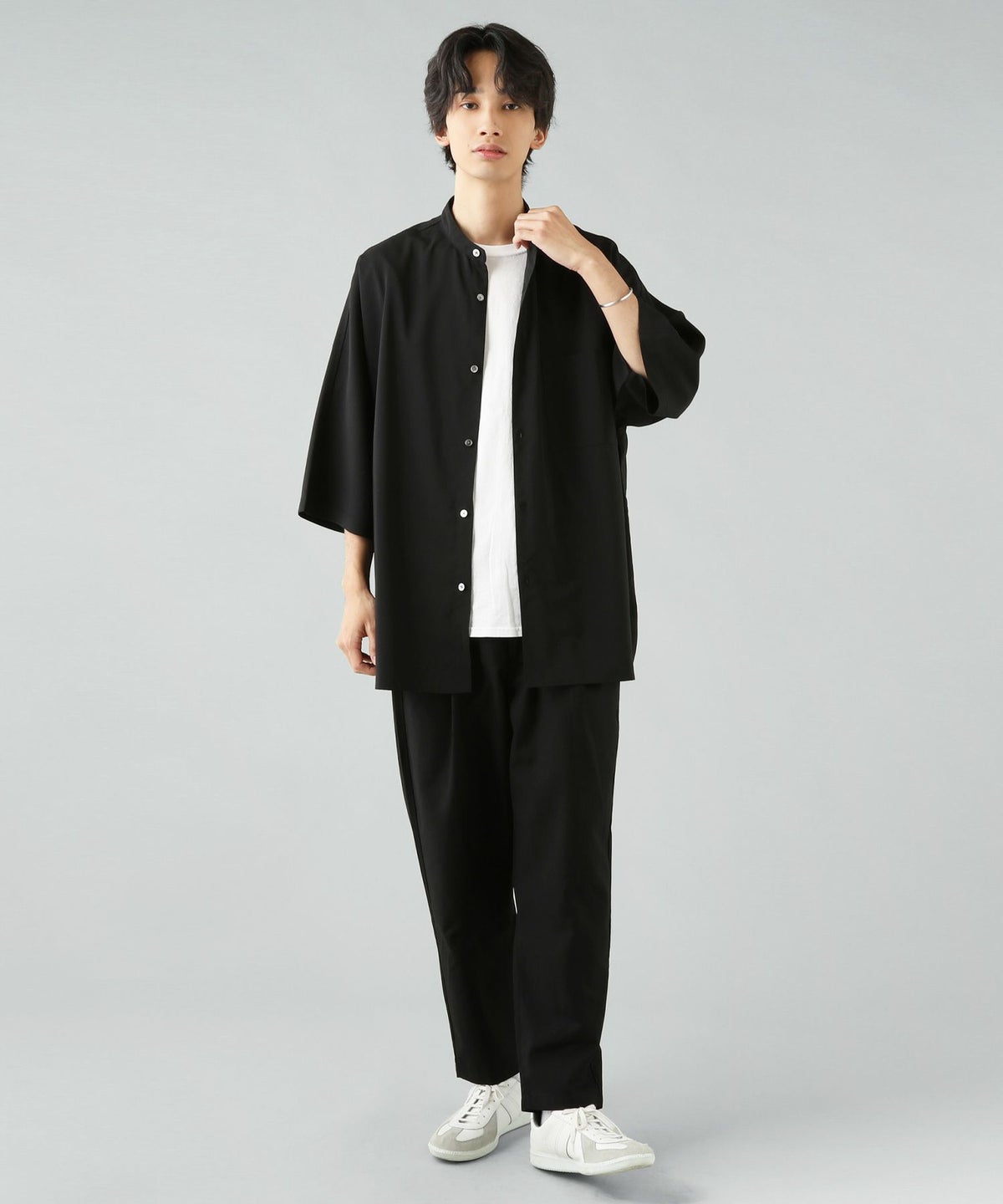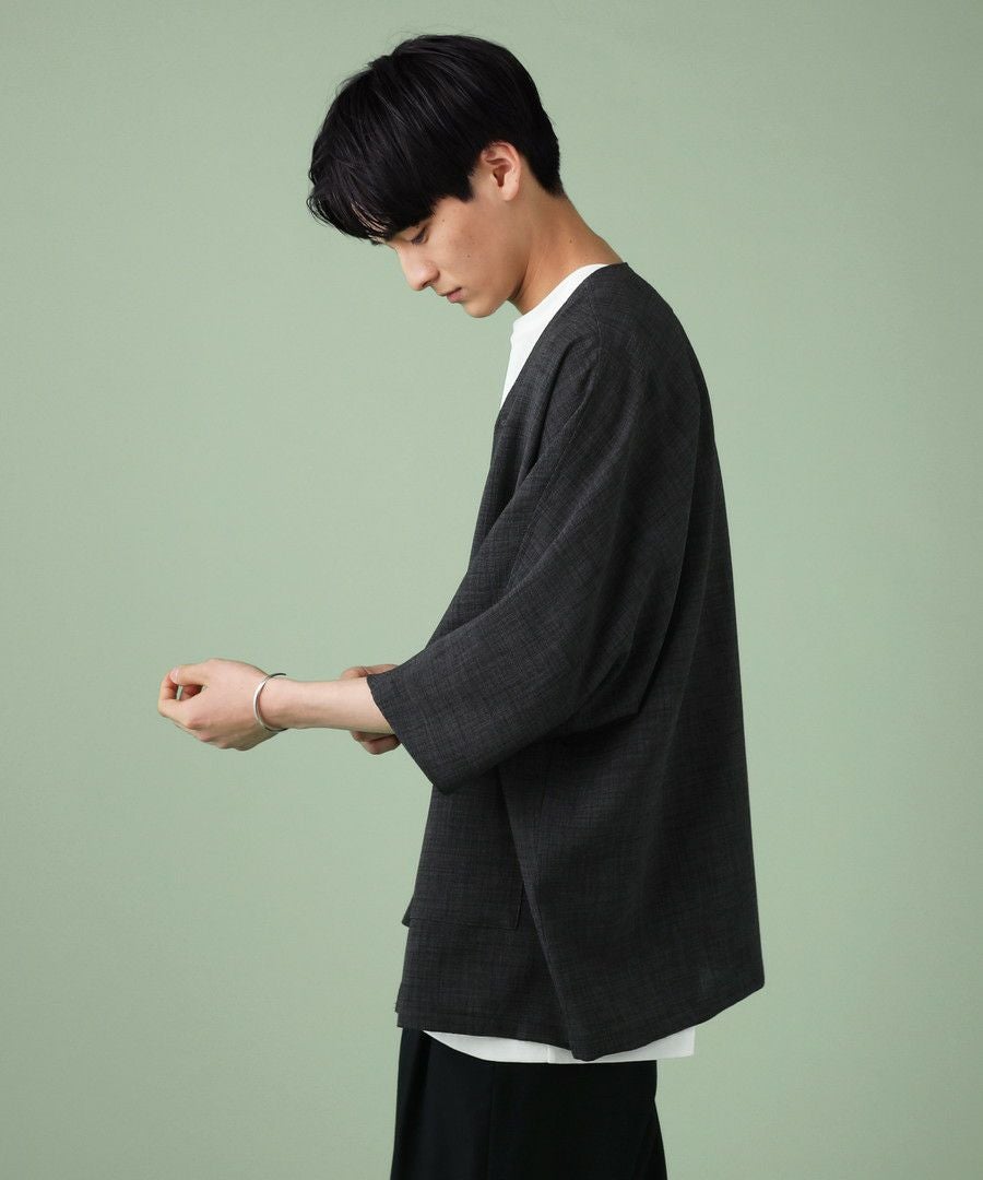 ウォッシャーとろみドルマンスリーブバンドカラー半袖シャツ
