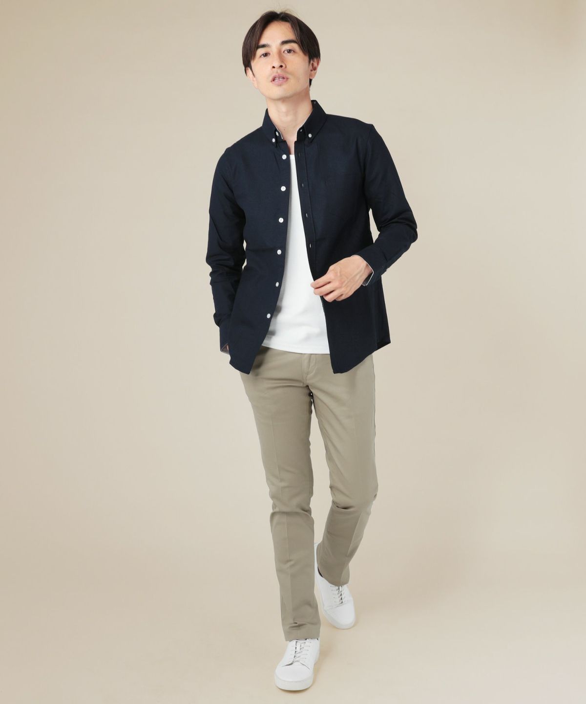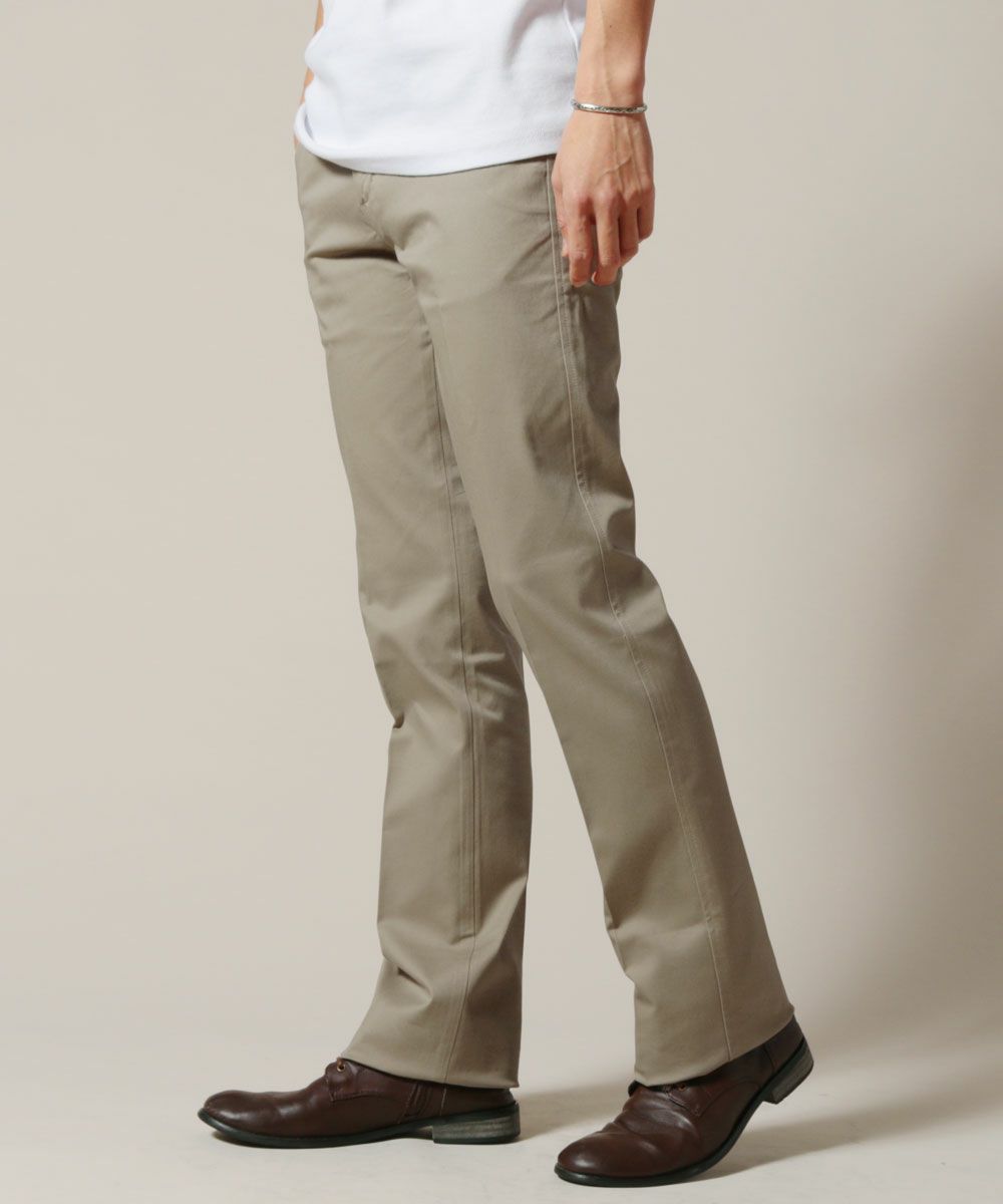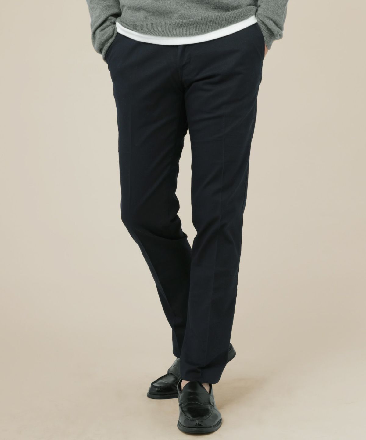 裾が少しだけ広がったシューカットシルエット。美しい脚のシルエットを作り出すために計算されたパターンによって、膝下からすらりと伸びる美脚シルエットが生み出されます。上品な印象のチノ生地を採用した、ビジネスシーンもオフスタイルにも着回せる一本です。