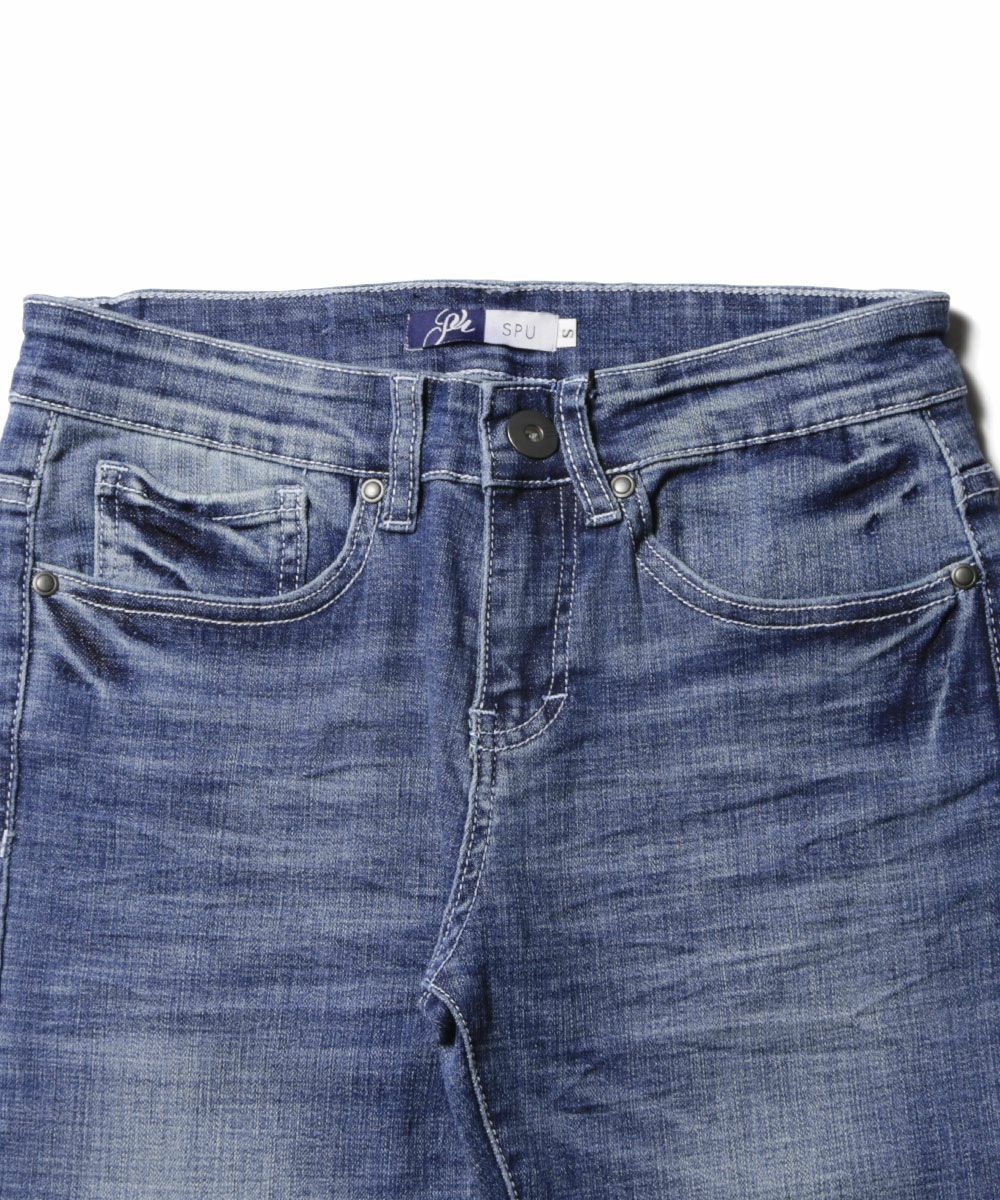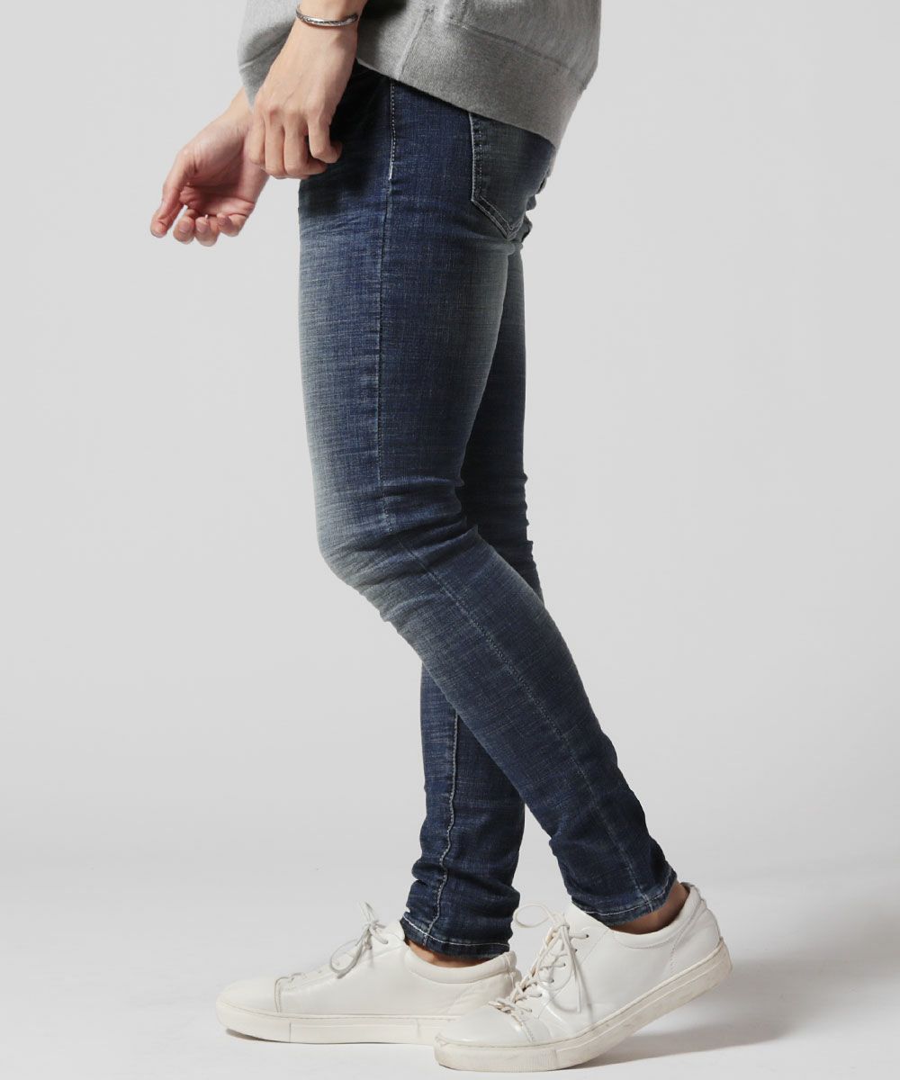 太さをあえて不揃いにした糸を使用するスラブ素材を使用。生地表面に独特の凹凸感を生み出します。随所に施されたウォッシュ加工やダメージ加工がヴィンテージ感を演出しており、穿き込むうちに風合いを増していきます。また、ストレッチ性が高いため履き心地も良いです。
