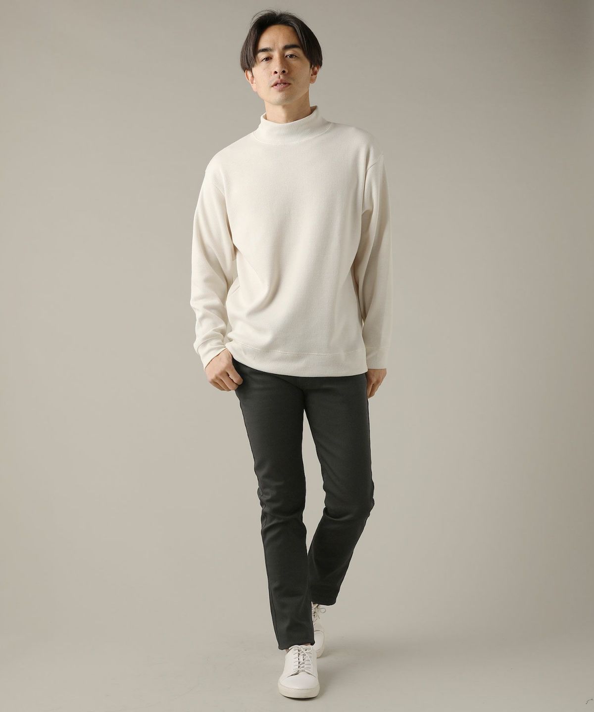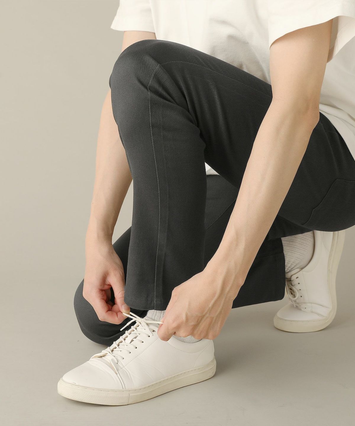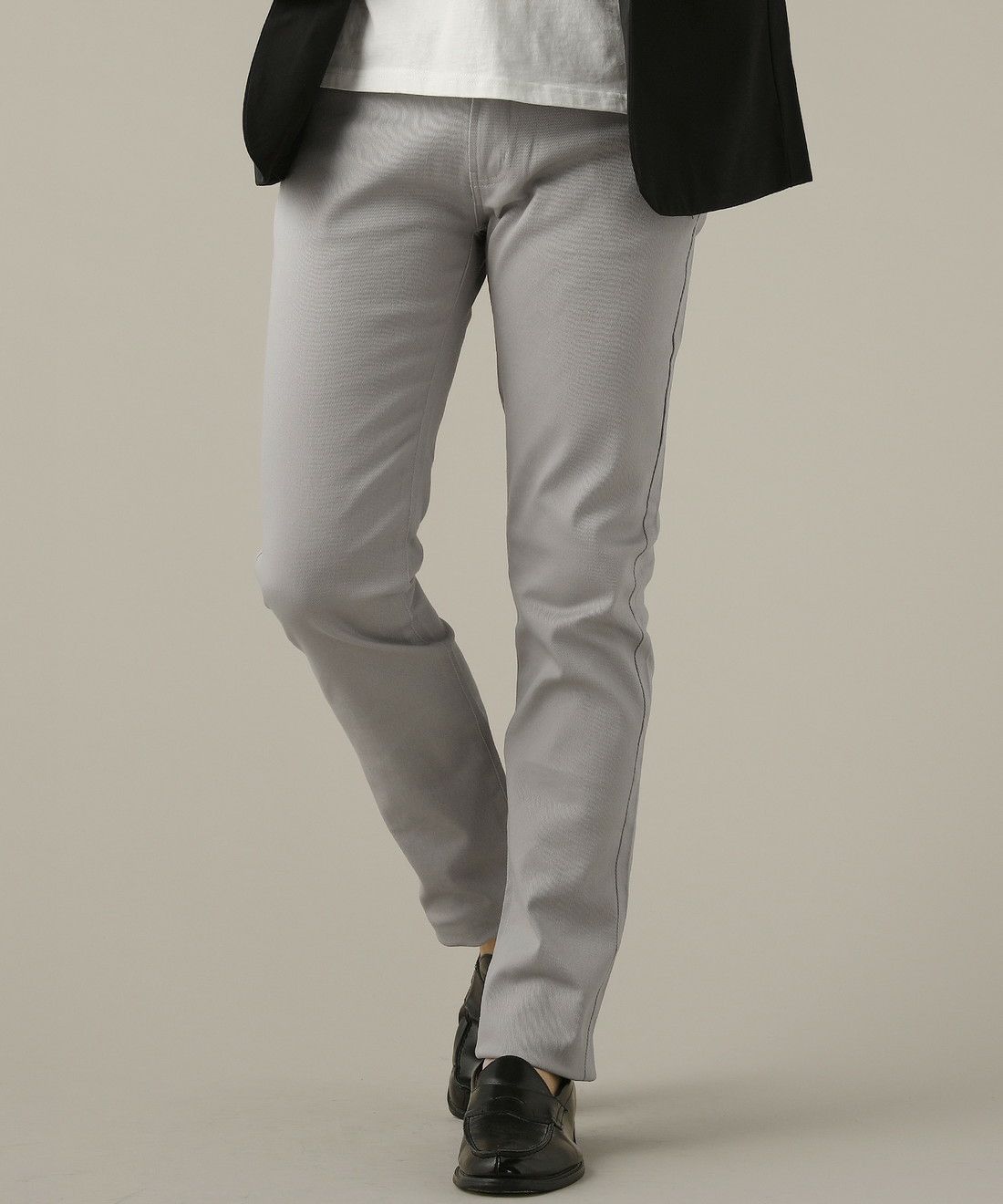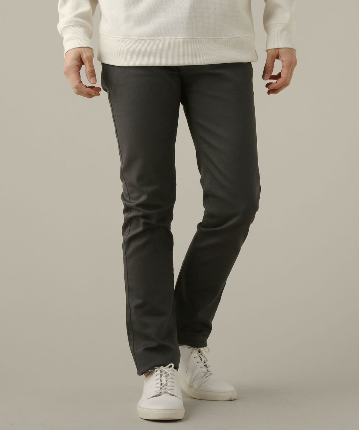 細身のシルエットに最適なカツラギ生地を選定しました。カツラギとは、「葛城(カツラギ)織り」という太い糸で織った厚手綿織物。綾織は「ツイル」とも呼ばれるため、カツラギもツイルの一種に分類されます。肉厚で耐久性が高いのがメリットで、フィット感の高い細身のスキニーでもタイツのように見えることはありません。デニムよりやわらかくて傷みにくく、ご自宅でのお手入れも簡単です。