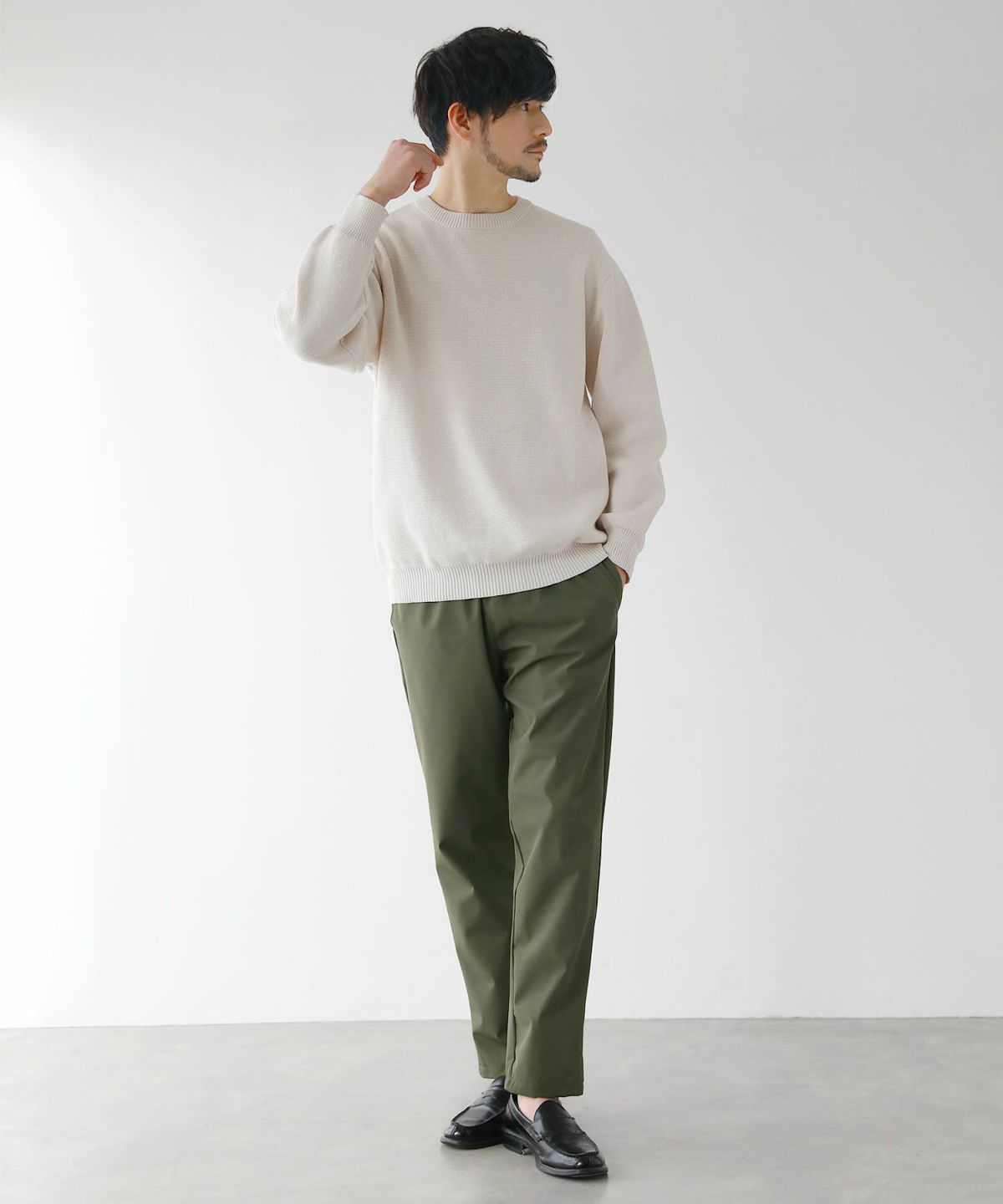 カーキやアイボリーといった中明度のボトムを合わせると今風のニュアンスカラーコーデが完成。白シャツとのレイヤードコーデや、セットアップのインナーとして合わせるなど、大人のキレイめスタイルとしての着用もおすすめです。