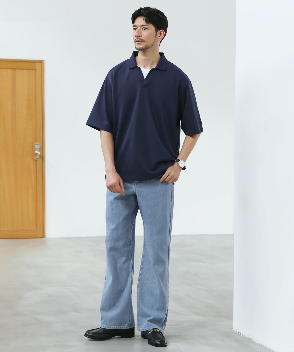 ひんやりとした着心地を体感できる接触冷感スキッパーポロシャツです。身幅と腕ぐりにたっぷりとゆとりを持たせ、動きやすくルーズな旬のシルエットに仕上げました。通常のポロシャツと違い、胸元のボタンを取り除いたスキッパースタイルにすることで胸元に自然な抜け感をプラスしています。また、抗菌防臭機能と接触冷感機能を併せ持った特殊な生地を使用。オンにもオフにも活躍する汎用性の高いデザインで、汗ばむ夏のシーズンでも涼しく清潔にご着用いただけます。