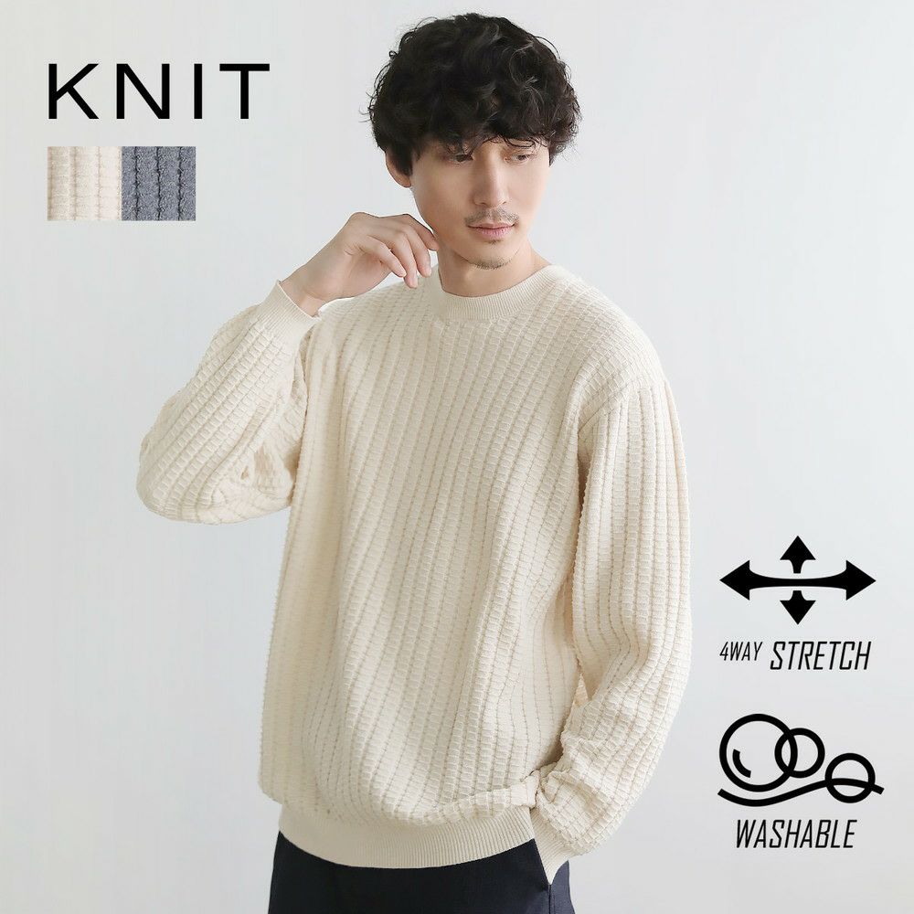 ポコポコとした立体的な格子柄で表情豊かに仕上げられたクルーネックニットです。
