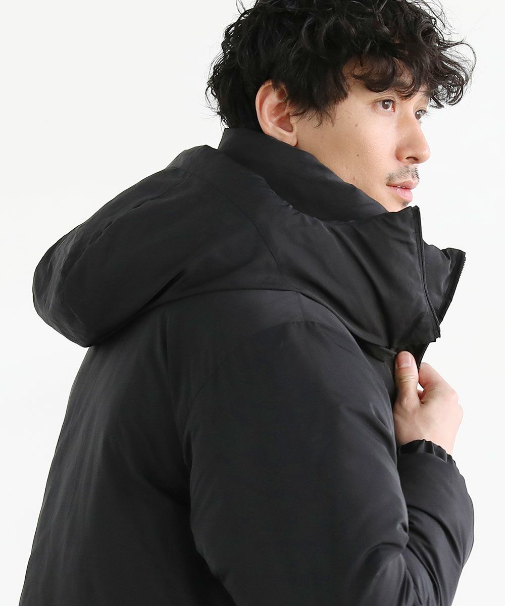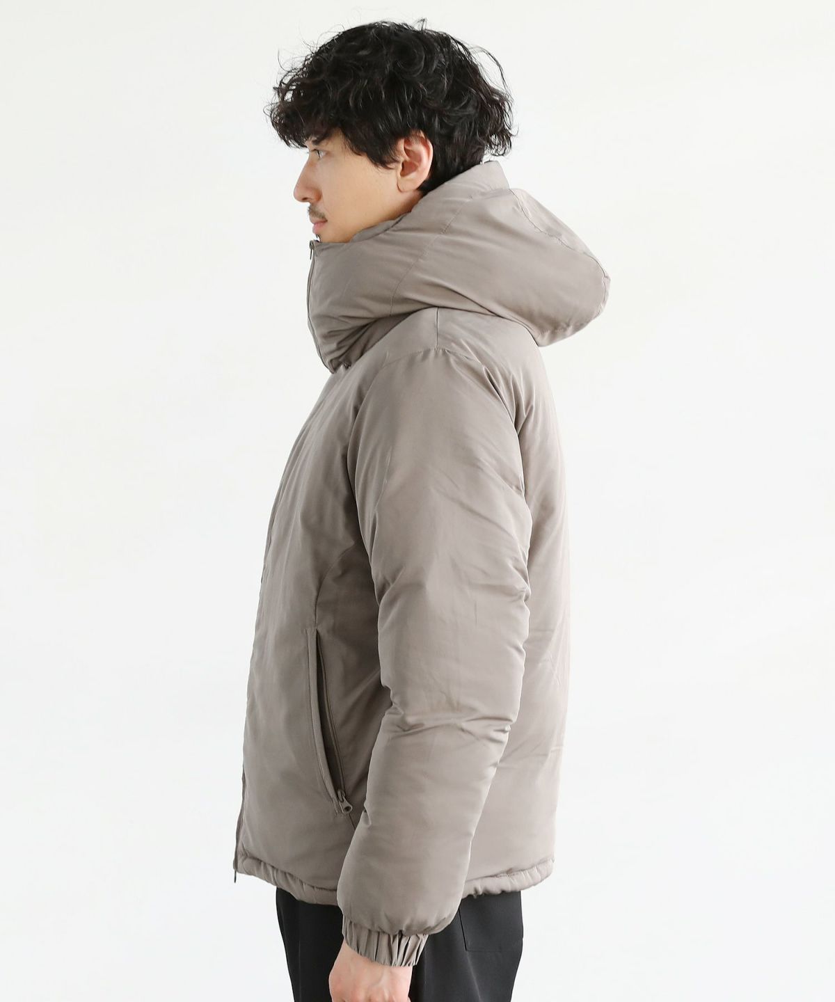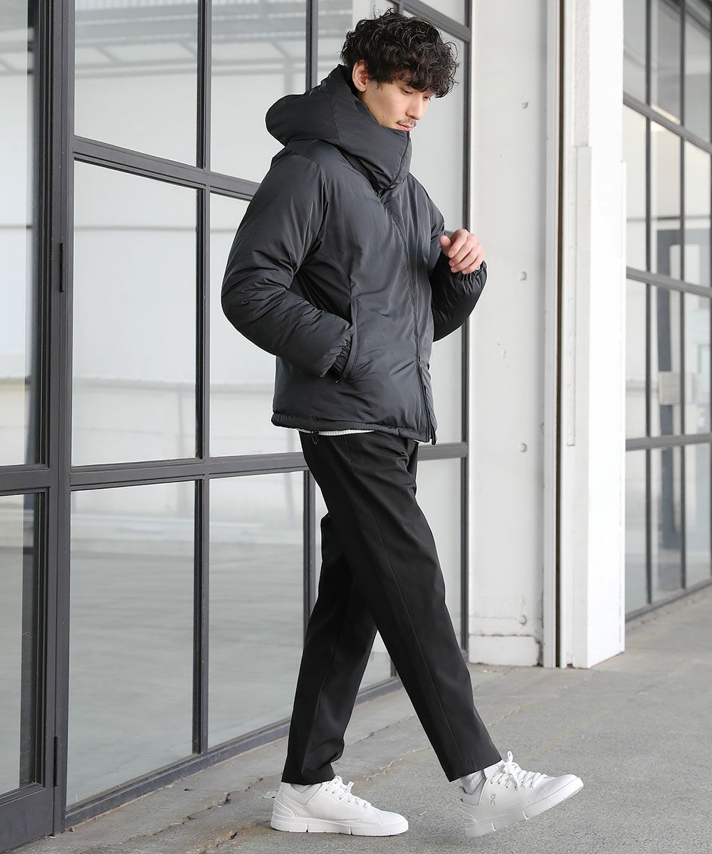 表側に中綿袋のもこもこ感を出さないシームレスデザインですっきりとした印象にまとめています。さらに脇の部分だけを身頃とは別パーツで縫い合わせるパターンにすることで着用時のウエスト周りの着ぶくれ感が抑えられるように設計。中綿入りでありながらもスマートに見えるシルエットを実現させました。細身に感じられますが、内側には 厚手のケーブルニット を着用できるほどのゆとりがあります。