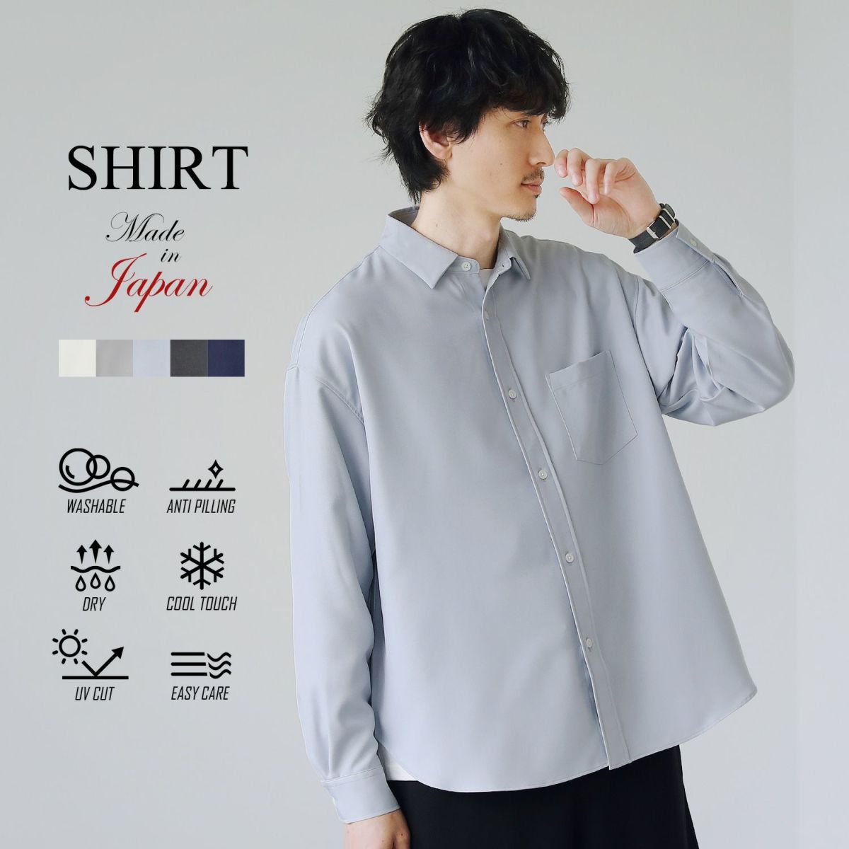 シワになりにくく毛羽立ちにくい生地を用いて、いつでもキレイにご着用いただけるシャツを仕立てました。ほのかに艶のある上品な生地感に日本製の丁寧な縫製が相まって、より一層キレイめな印象が引き立てられるシャツとなっております。生地は麻調のドライな質感で、肌に触れるとひんやりと心地よい接触冷感機能も備えているので、汗ばむ季節のお洒落着に最適です。さらに気兼ねなく日常的に着用とお洗濯を繰り返すことができるウォッシャブル仕様にもなっております。上質な見た目でありながら、デイリーユースに適した機能性も有する一着です。