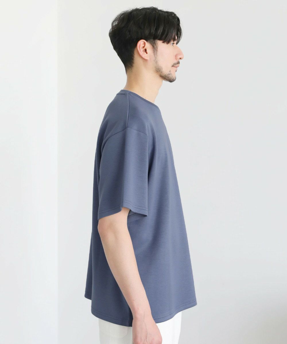 ゆったりとさせたシルエットとポリウレタン由来の伸縮性で身動きがとりやすく、動作にストレスを感じさせません。空気を含んだようなふくらみと適度なハリがある生地で形が崩れにくいため、どの角度から見ても立体的でしゃんとした印象に。シワにもなりにくく着ている間キレイめなシルエットをキープしてくれる、大人な表情のTシャツです。