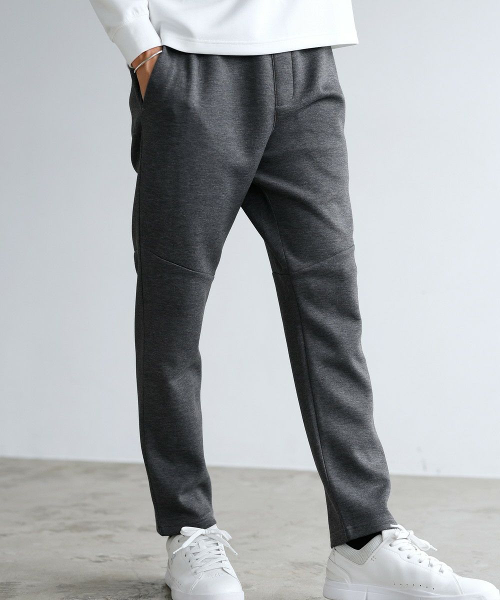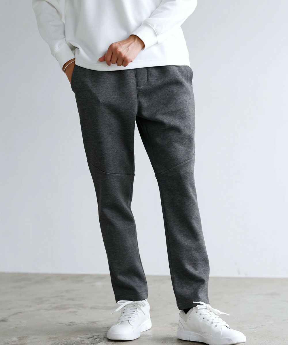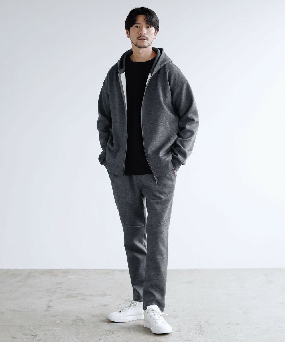 デイリーユースに最適な穿き心地抜群のイージーテックパンツ。カジュアルな印象が強いスウェットパンツを品の良い滑らかなハイポンチ生地で仕立て、キレイめスタイルにも取り入れやすいアイテムへとブラッシュアップさせました。シンプルなプルオーバーやカットソーと組み合わせるだけで簡単に軽快でお洒落な着こなしが完成します。さらに同素材の ZIPパーカー と揃えて着ればセットアップコーデも可能に。テイスト問わずに合わせられる高い着回し力で、ヘビロテ間違いなしの一本です。