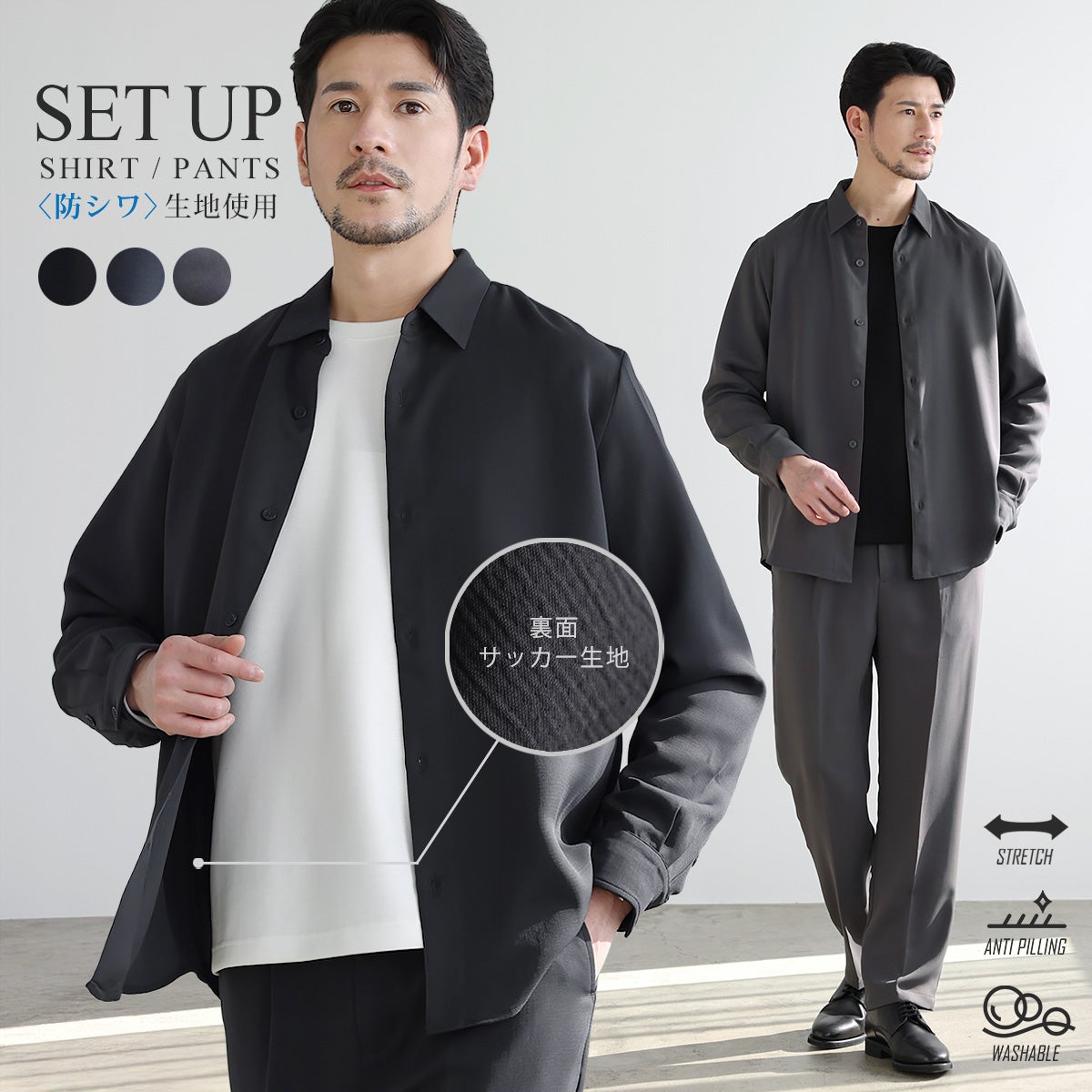【イージーケア・吸水速乾・通気性・軽量】コットンリネンライクテックキャンバスオープンカラーシャツ&イージーパンツセットアップ