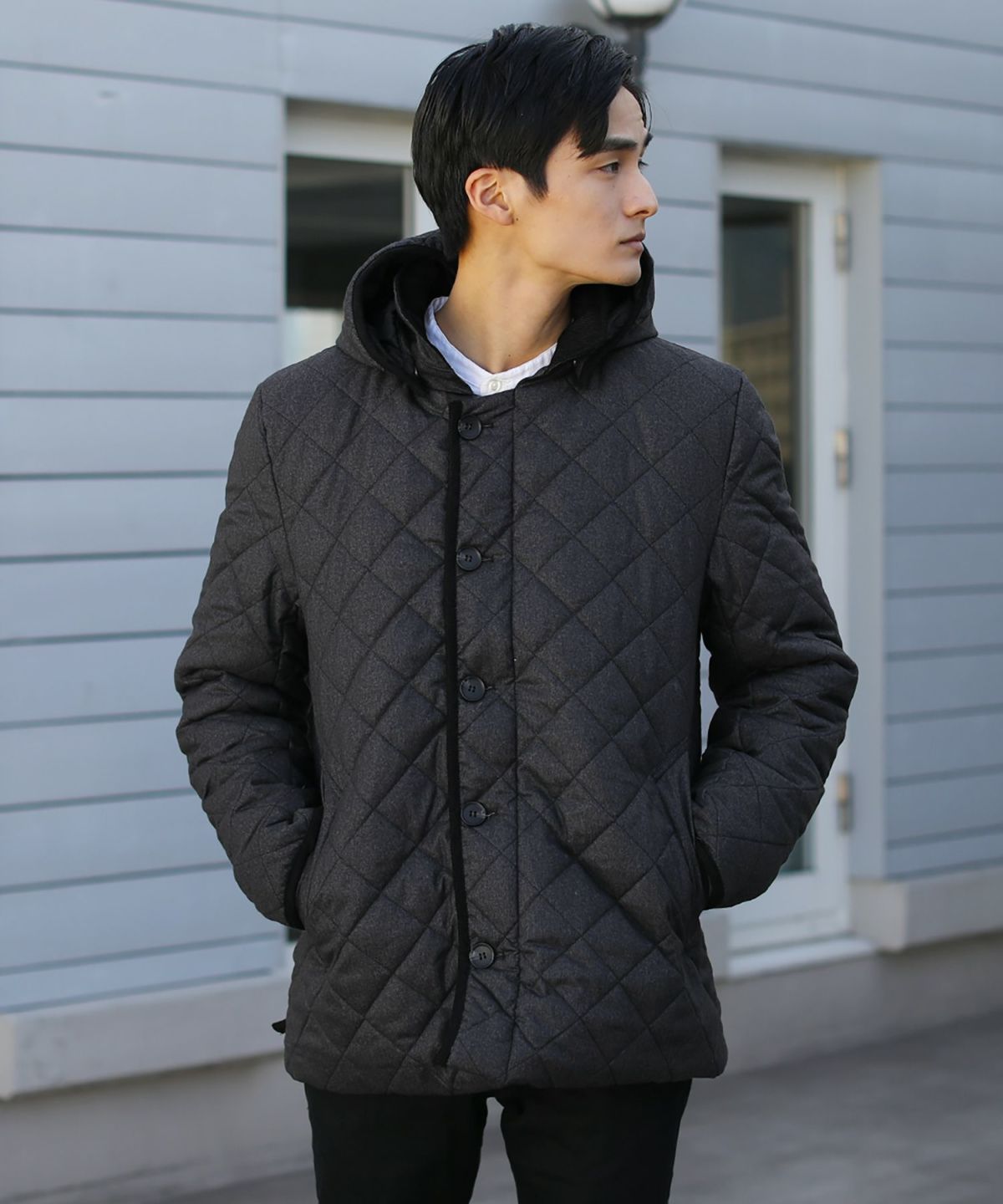ウールライク撥水ダイヤキルティングシンサレート中綿脱着フードジャケット