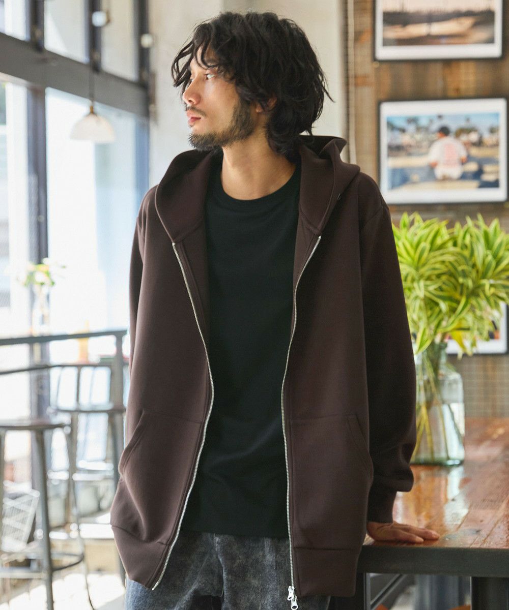 スタンダードなボックスシルエットですが、やや肩のラインを落としたデザインと広めに設定した身幅が、窮屈感なくゆとりのある着心地を実現。フード部分は生地を二枚合わせにしており着用時もフードの立ち上がりが美しく、コーディネートのポイントになります。ジップはダブルジップ仕様にしているため着用時の印象を自在に変えることができ、着こなしの幅が広がります。