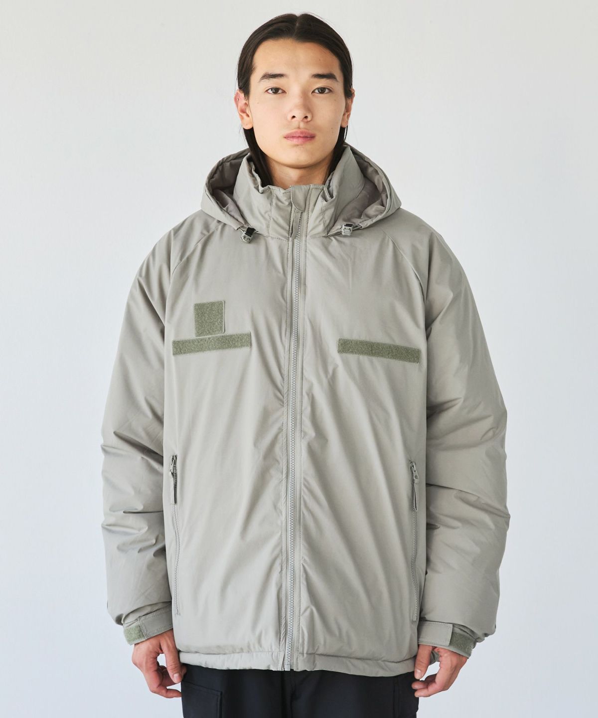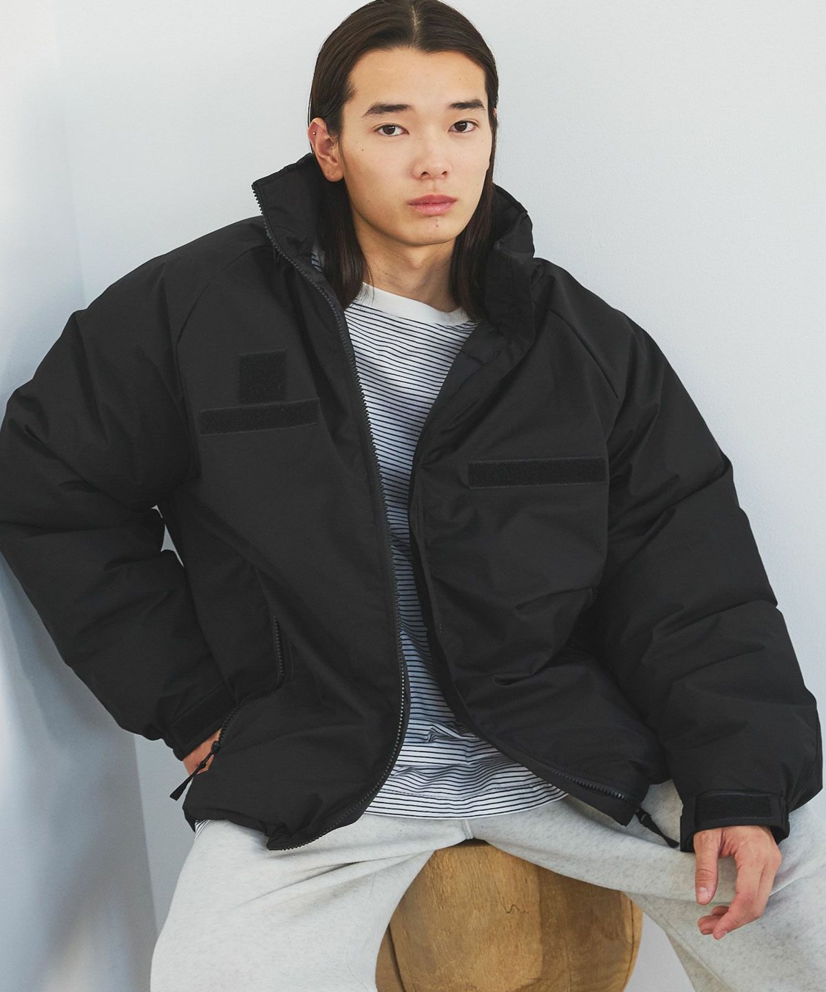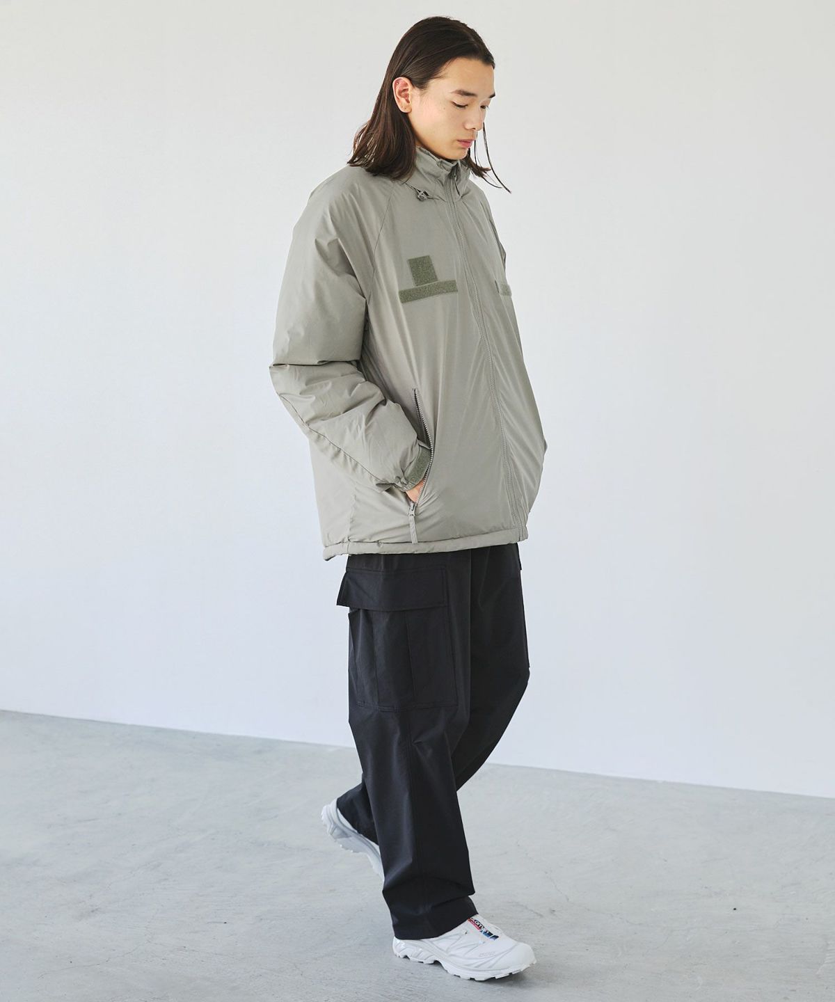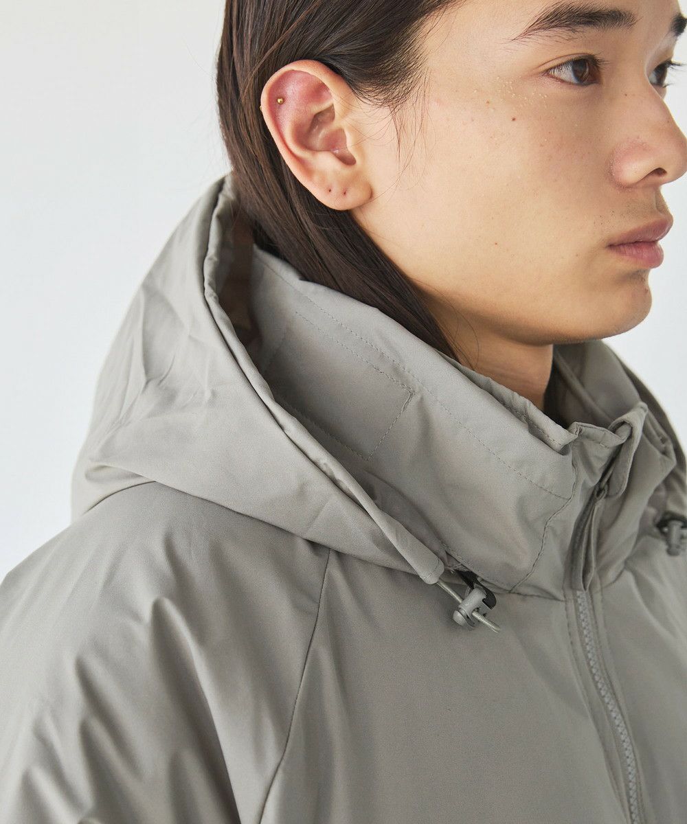 首元までしっかり温かいスタンドネックと、マジックテープ仕様の袖で冷気の侵入を防ぐ防寒性の高さも魅力的。裾に付いたドローコードは、絞り具合で裾の広がりを軽減して気密性を高めることができるだけでなく、丈感の変化で様々なシルエットを楽しめます。襟の内側に収納できるフードや胸元のベルクロパッチ、肘のエルボーパッチデザインなど、ミリタリーらしいディテールもデザイン性を高めるポイント。フロントファスナーにはスライダーが顔に当たるのを防ぐためにフラップを被せました。また、両サイドに設置したファスナーポケットはしっかりと大きく、ハンドウォームとしても機能する袋地がついています。