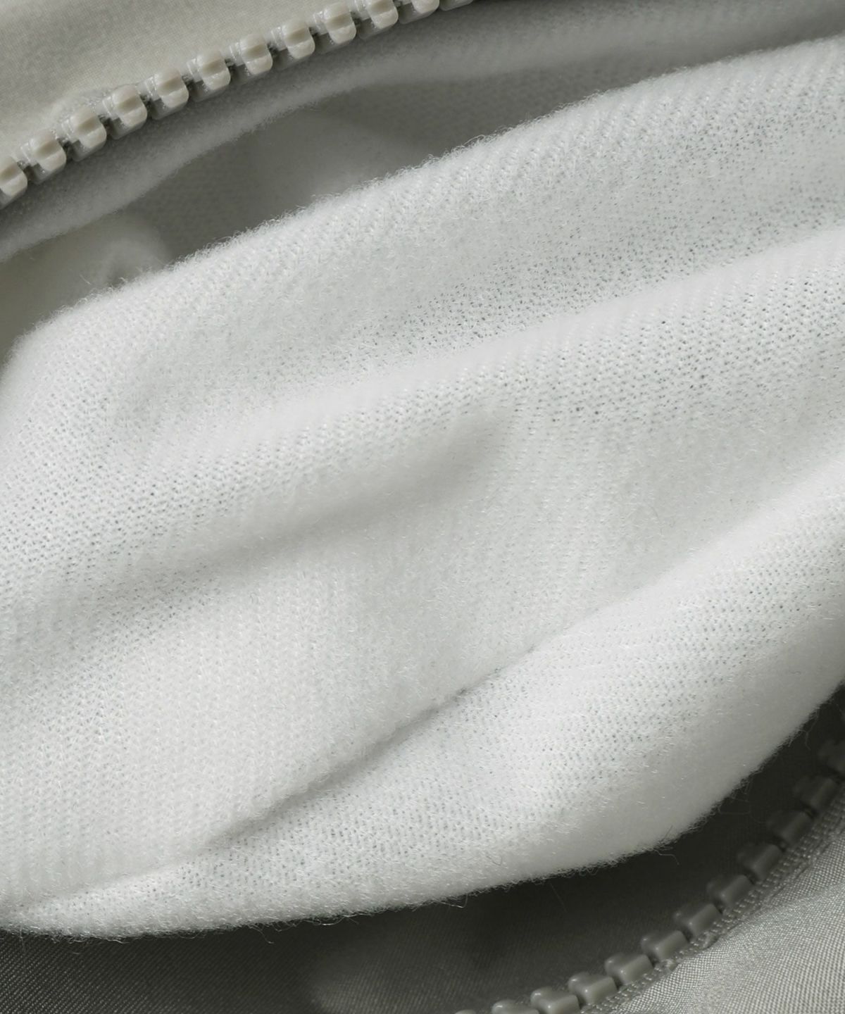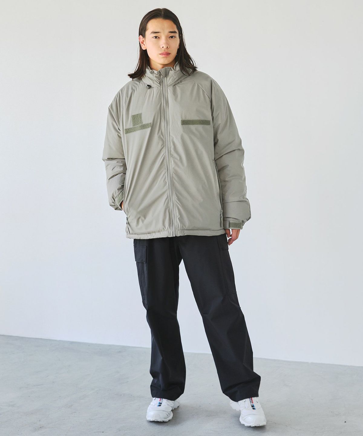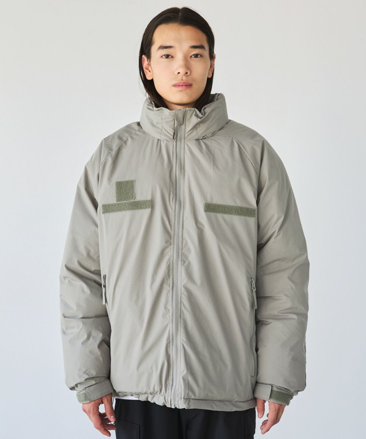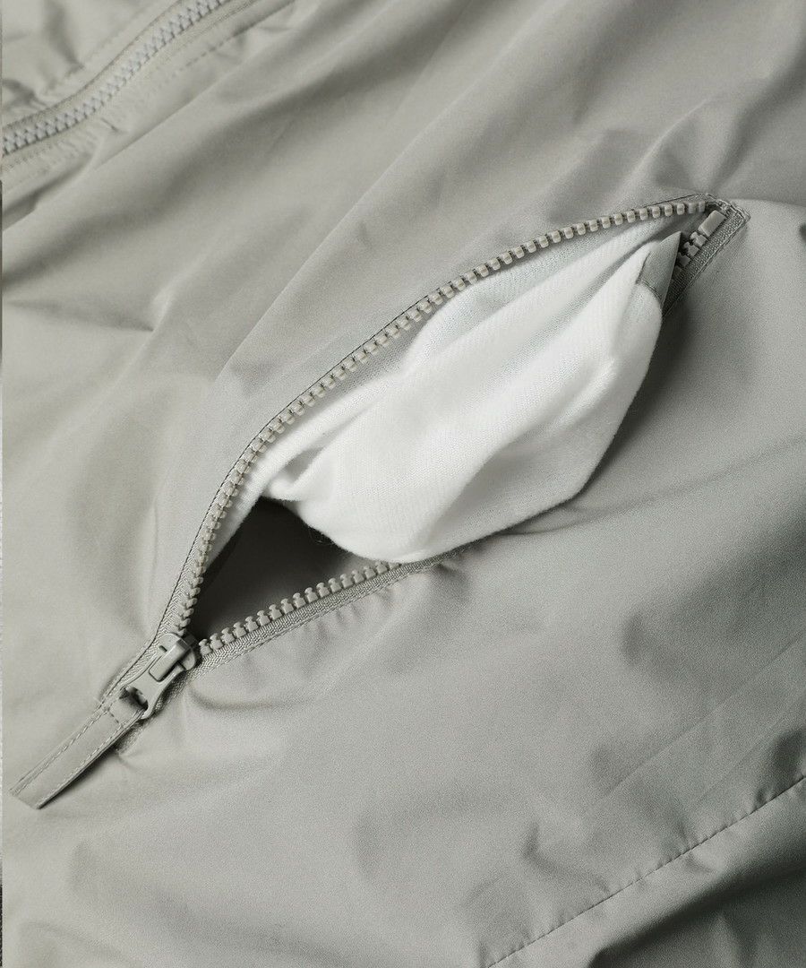 首元までしっかり温かいスタンドネックと、マジックテープ仕様の袖で冷気の侵入を防ぐ防寒性の高さも魅力的。裾に付いたドローコードは、絞り具合で裾の広がりを軽減して気密性を高めることができるだけでなく、丈感の変化で様々なシルエットを楽しめます。襟の内側に収納できるフードや胸元のベルクロパッチ、肘のエルボーパッチデザインなど、ミリタリーらしいディテールもデザイン性を高めるポイント。フロントファスナーにはスライダーが顔に当たるのを防ぐためにフラップを被せました。また、両サイドに設置したファスナーポケットはしっかりと大きく、ハンドウォームとしても機能する袋地がついています。