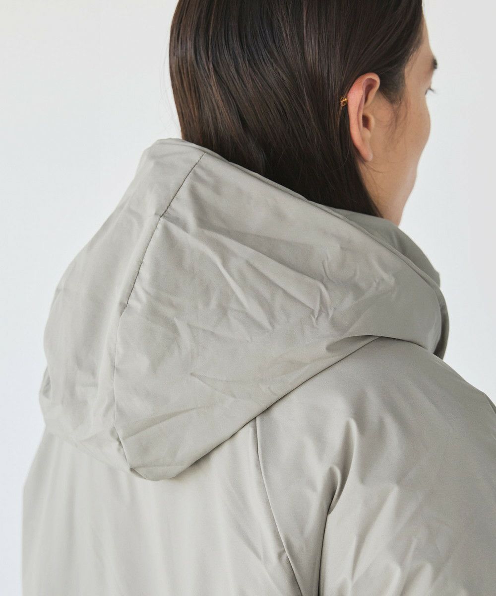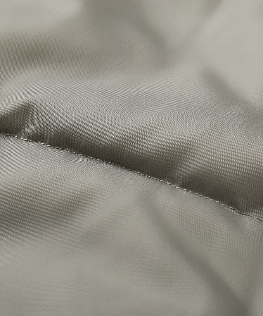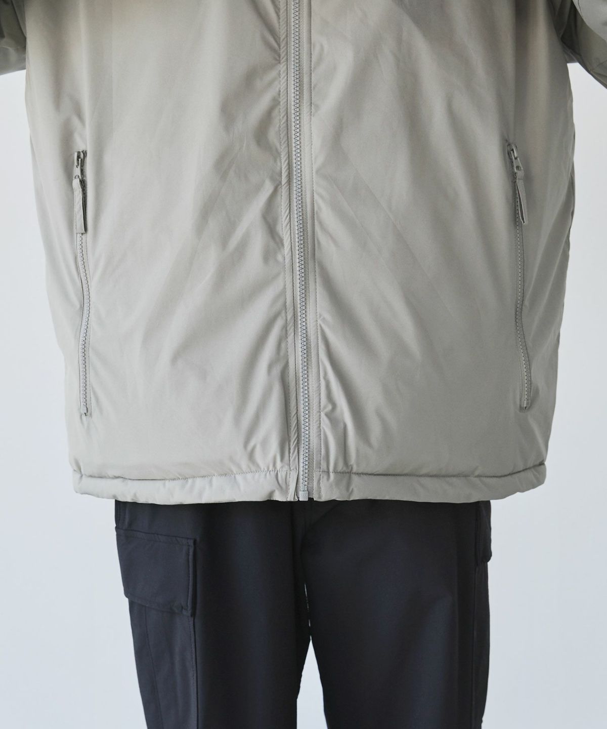 生地には、程よいハリ感と滑らかさを持つ撥水加工ポリエステル素材を採用しました。ふかふかとした中綿には極細ポリエステル繊維『ファイバーダウン』を使用しており、ダウンに比べると厚さが控え目でとても軽いのが特長。生地の間に暴風シートを挟み込んでいるため保温性も抜群です。