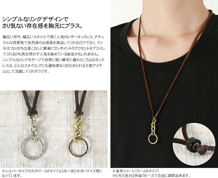 二連リング×革紐ナチュラルテイストレザーネックレス