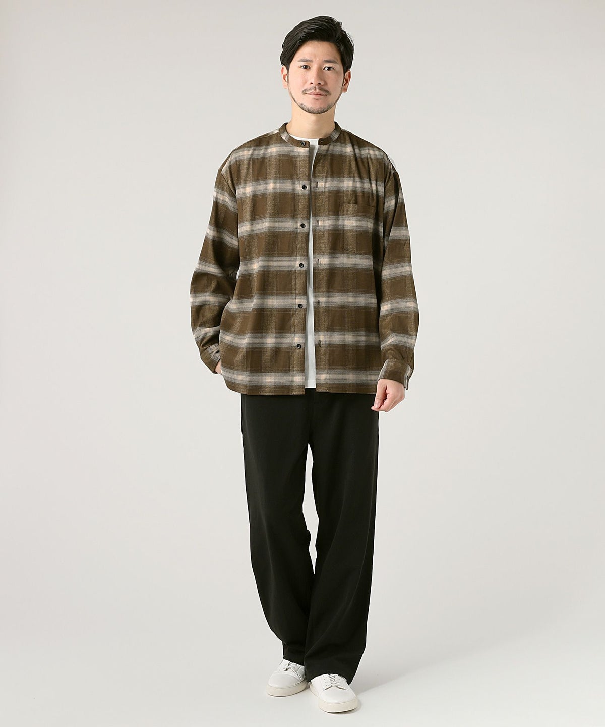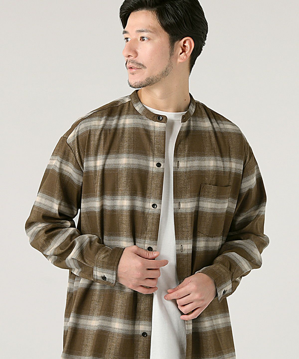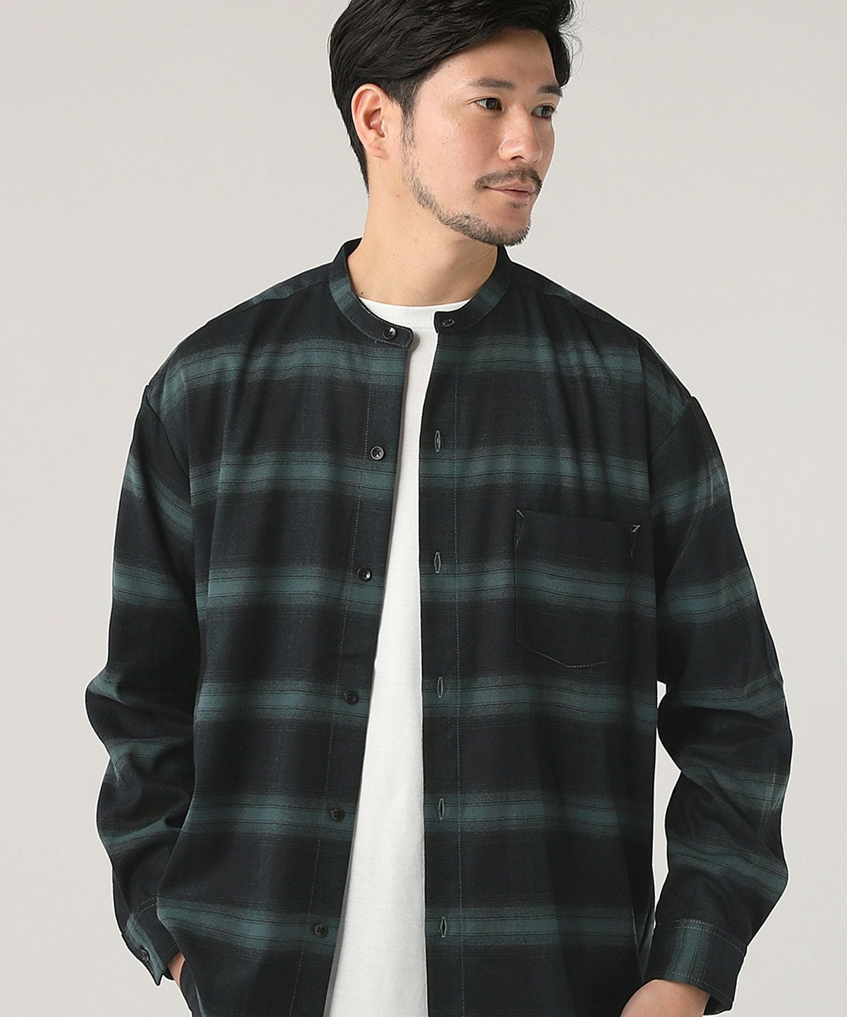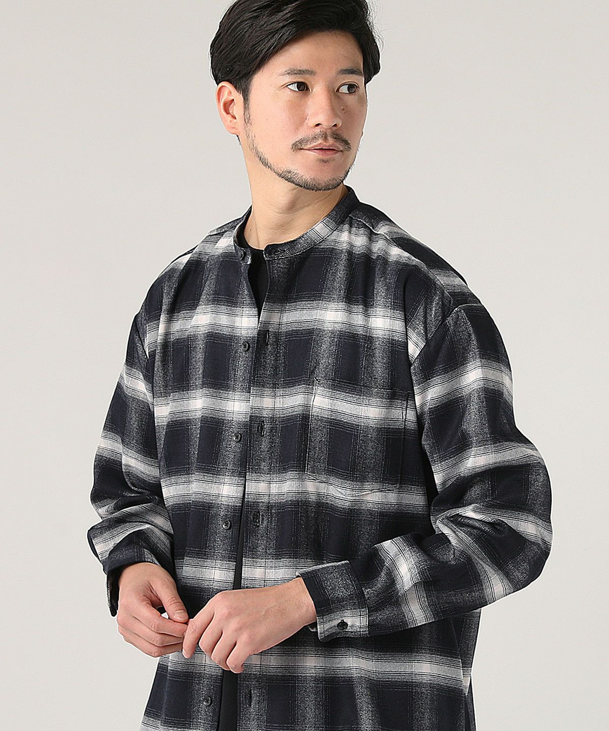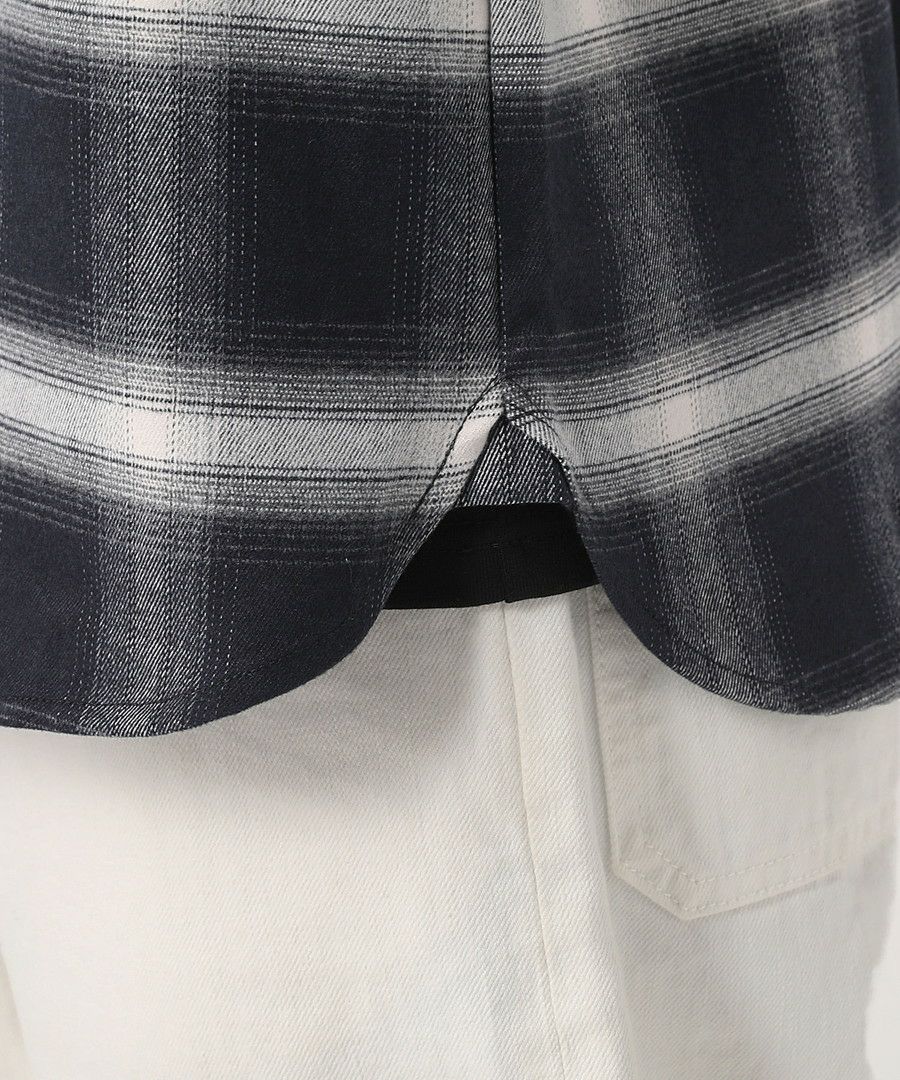 オンブレチェックバンドカラー長袖シャツ