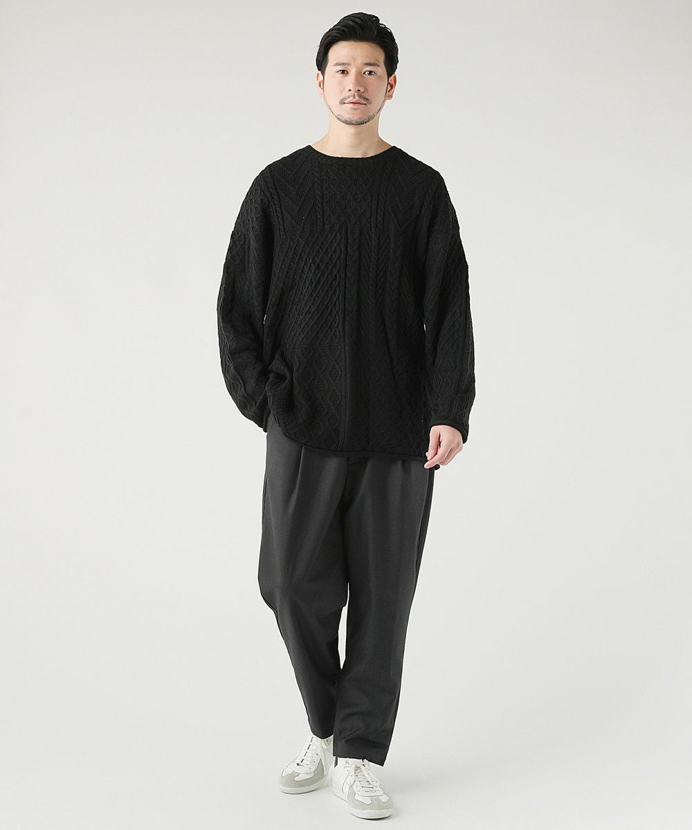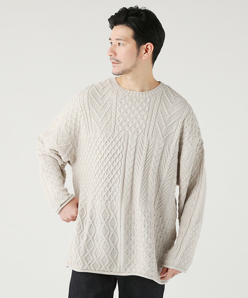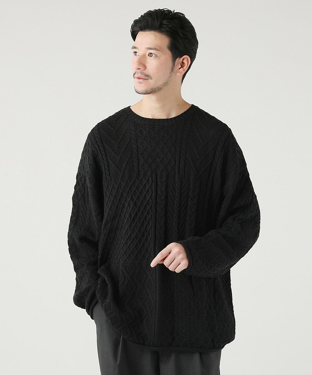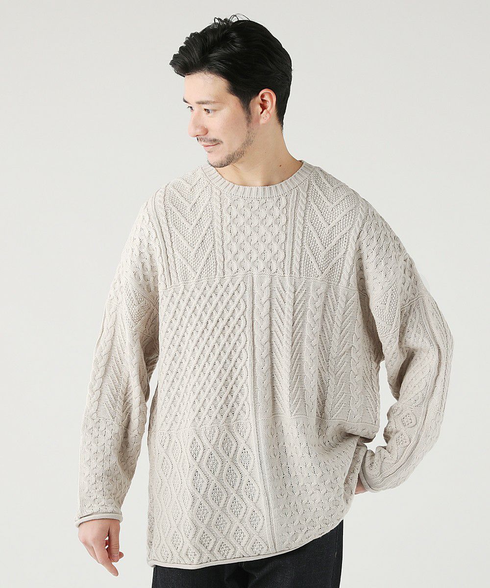 ケーブル編み切り替えクルーネックニット