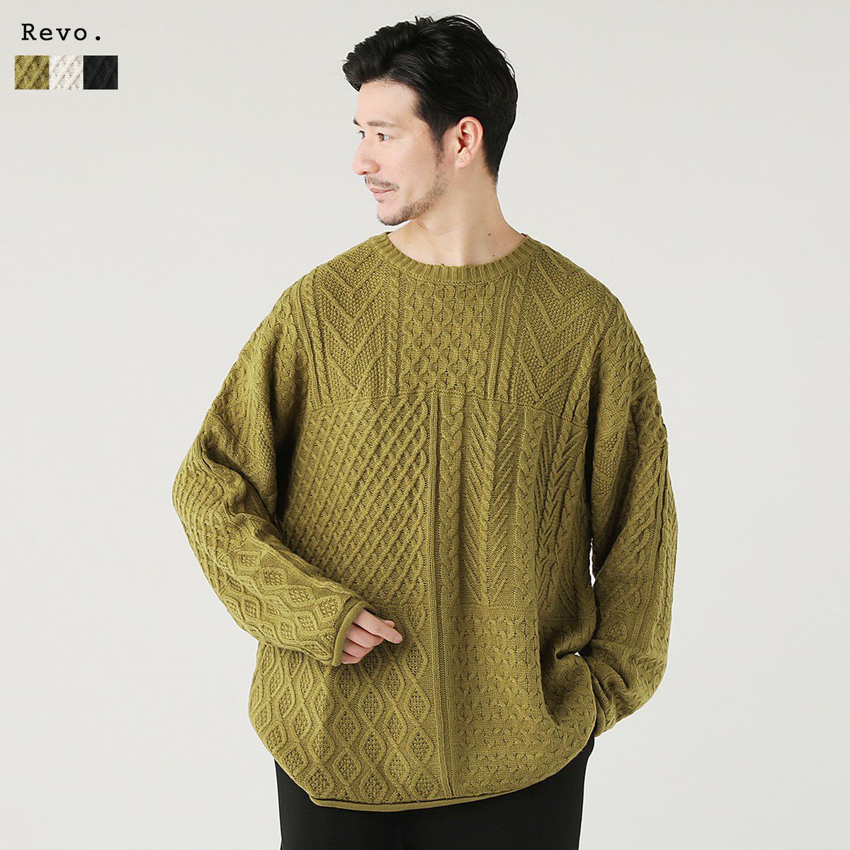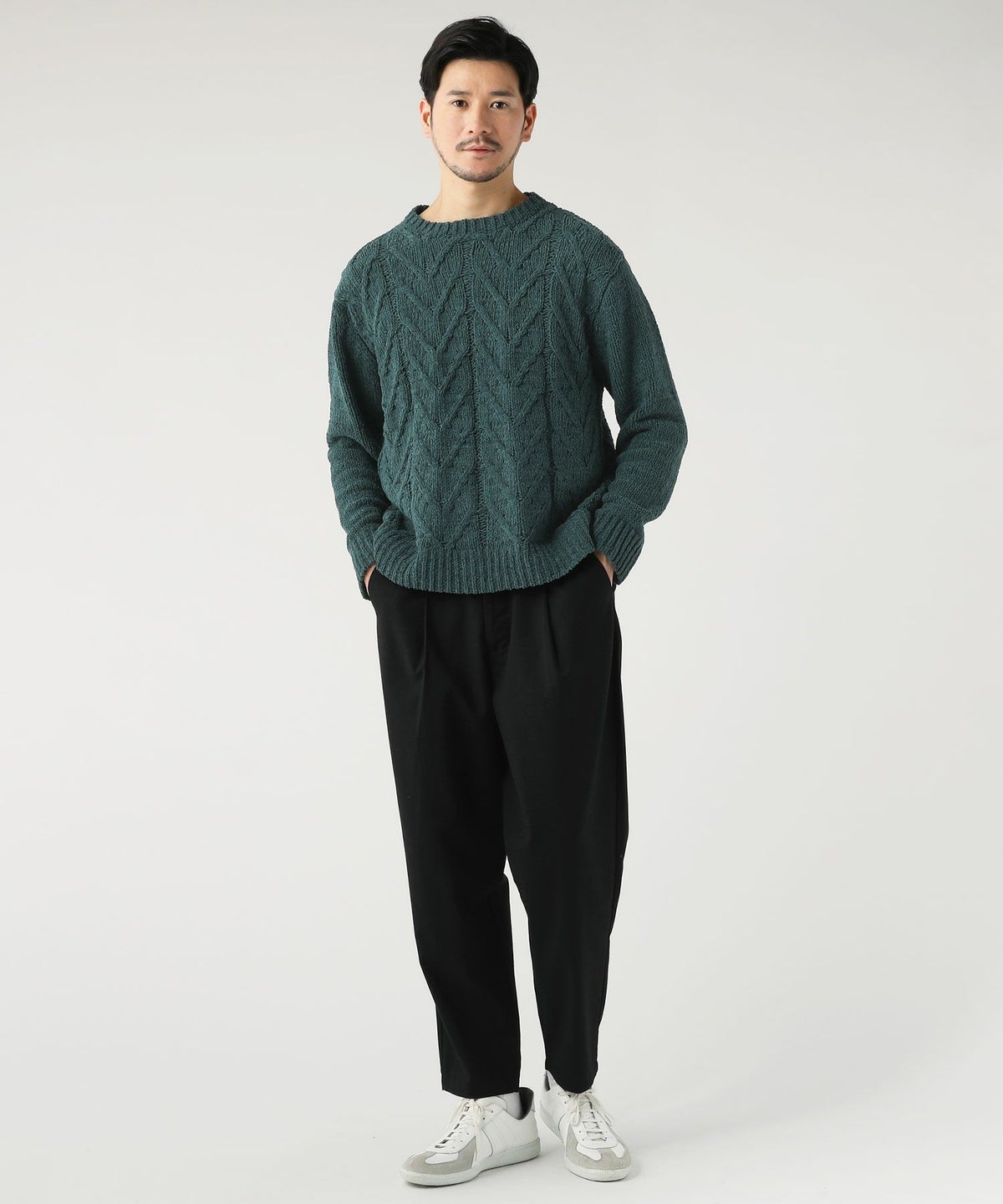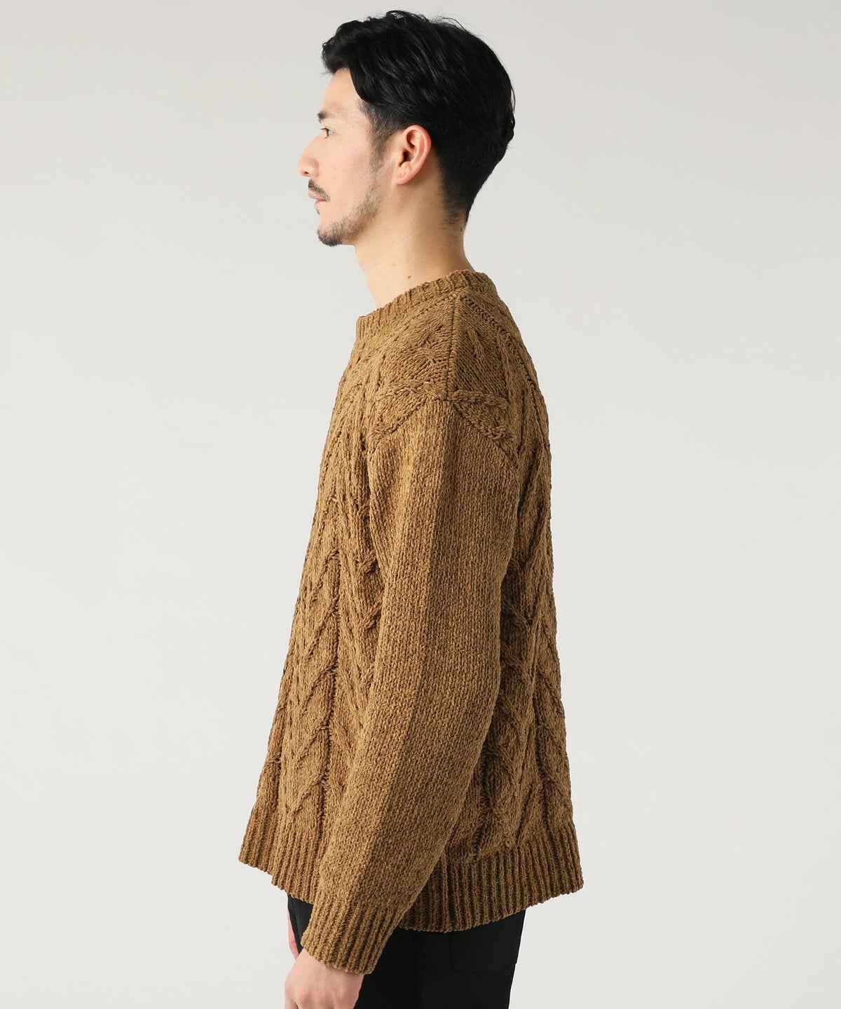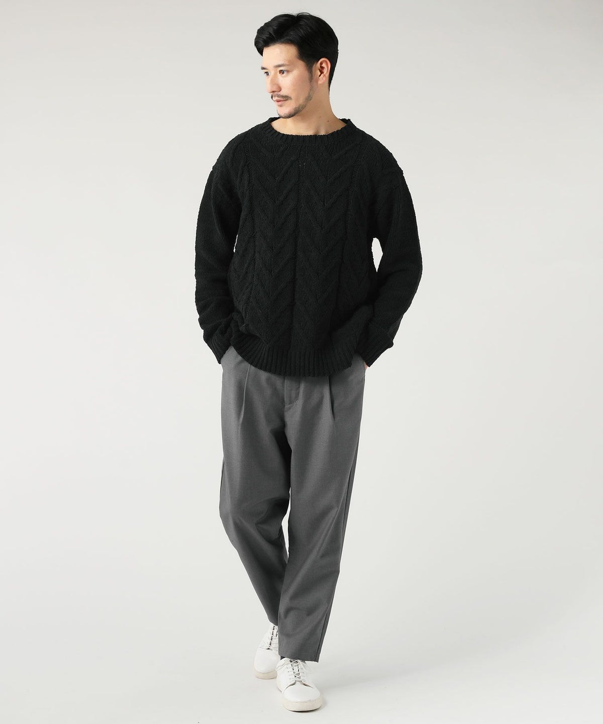 ケーブル編み切り替えクルーネックニット
