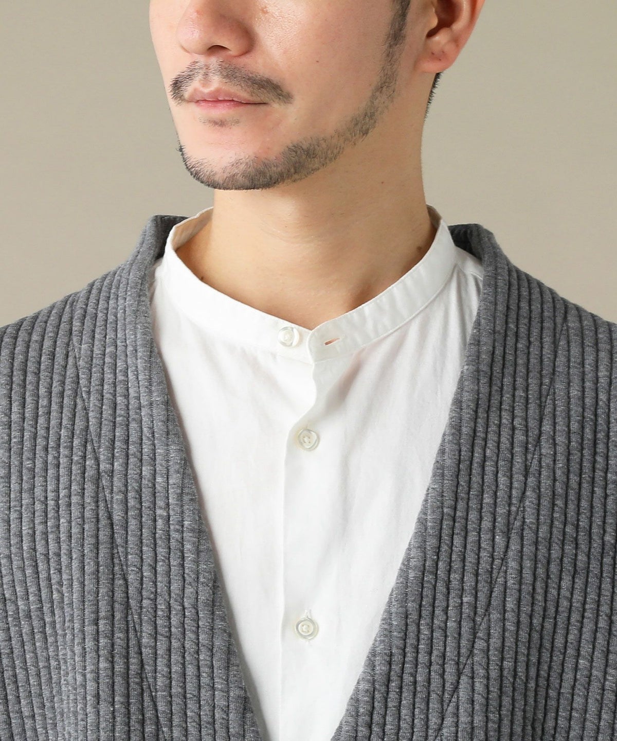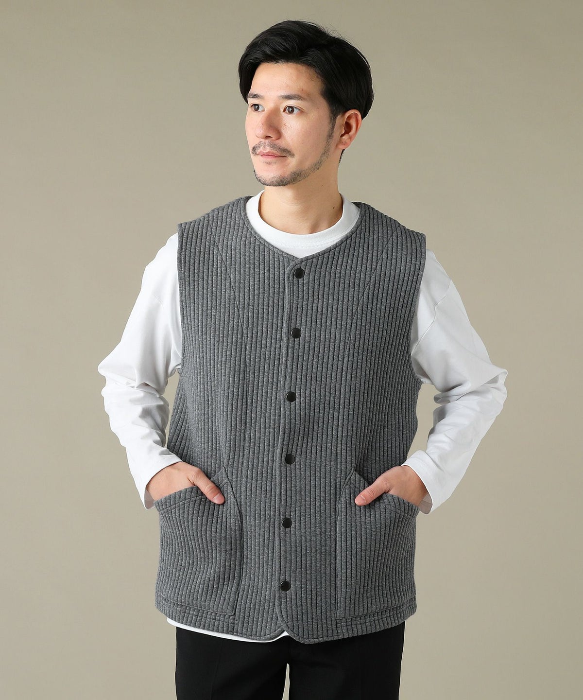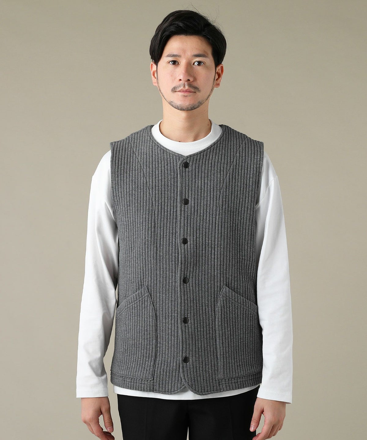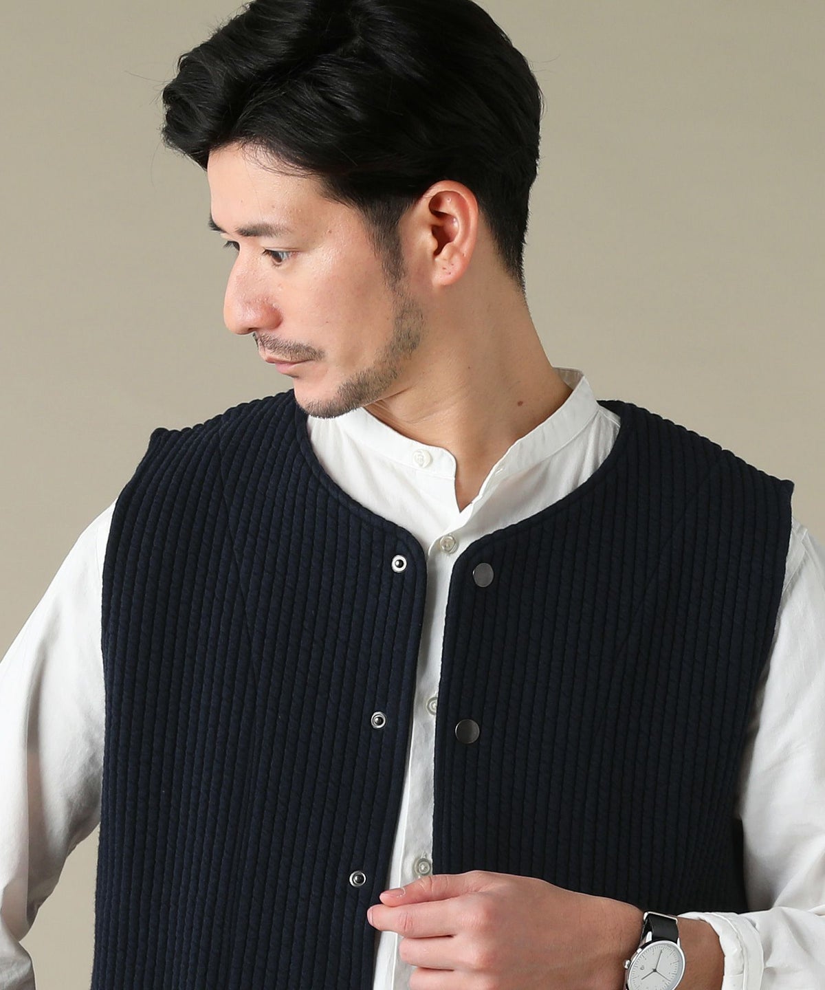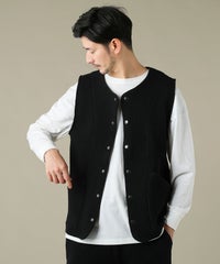 日本製「尾州」コットンキルトノーカラースナップベスト