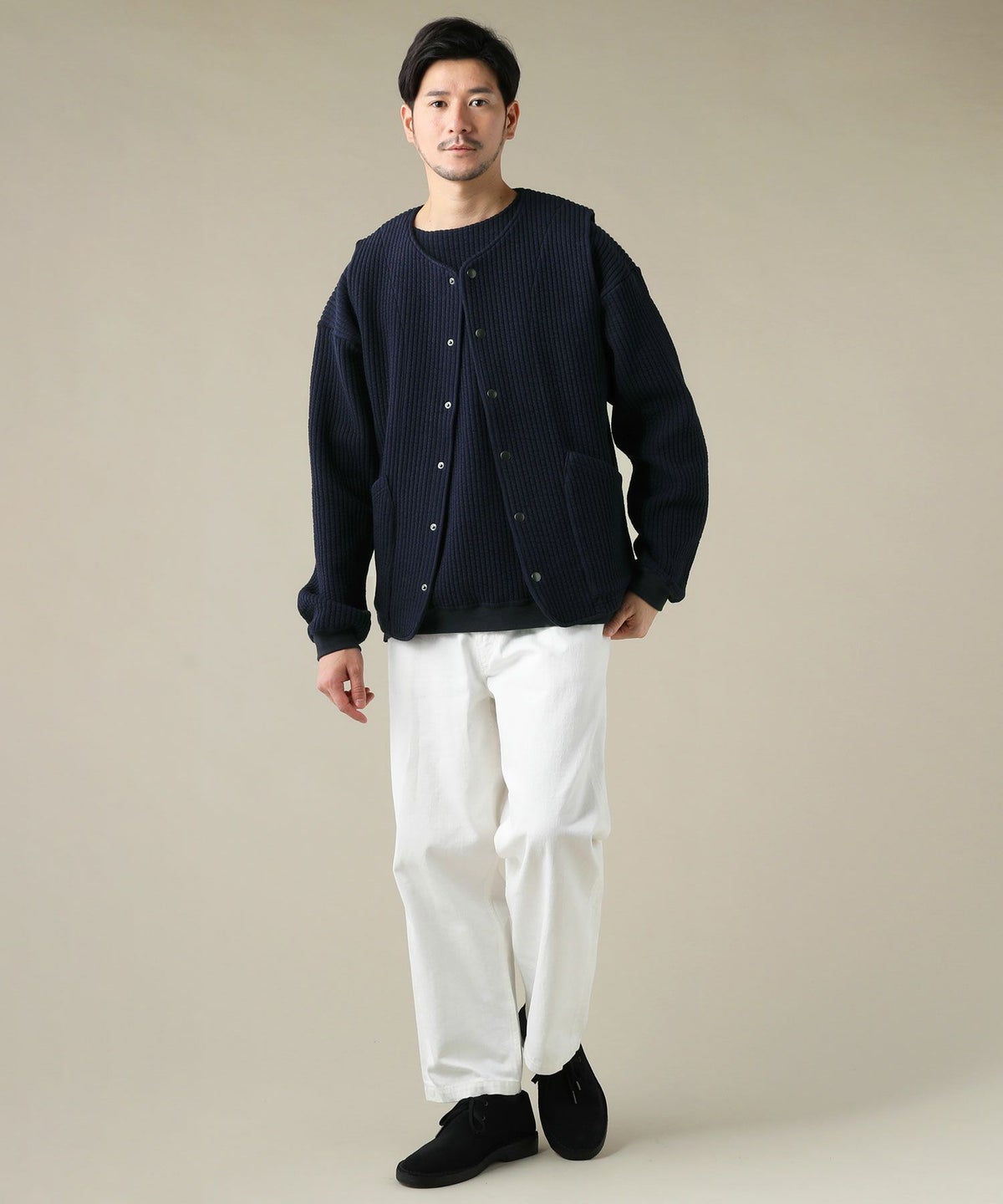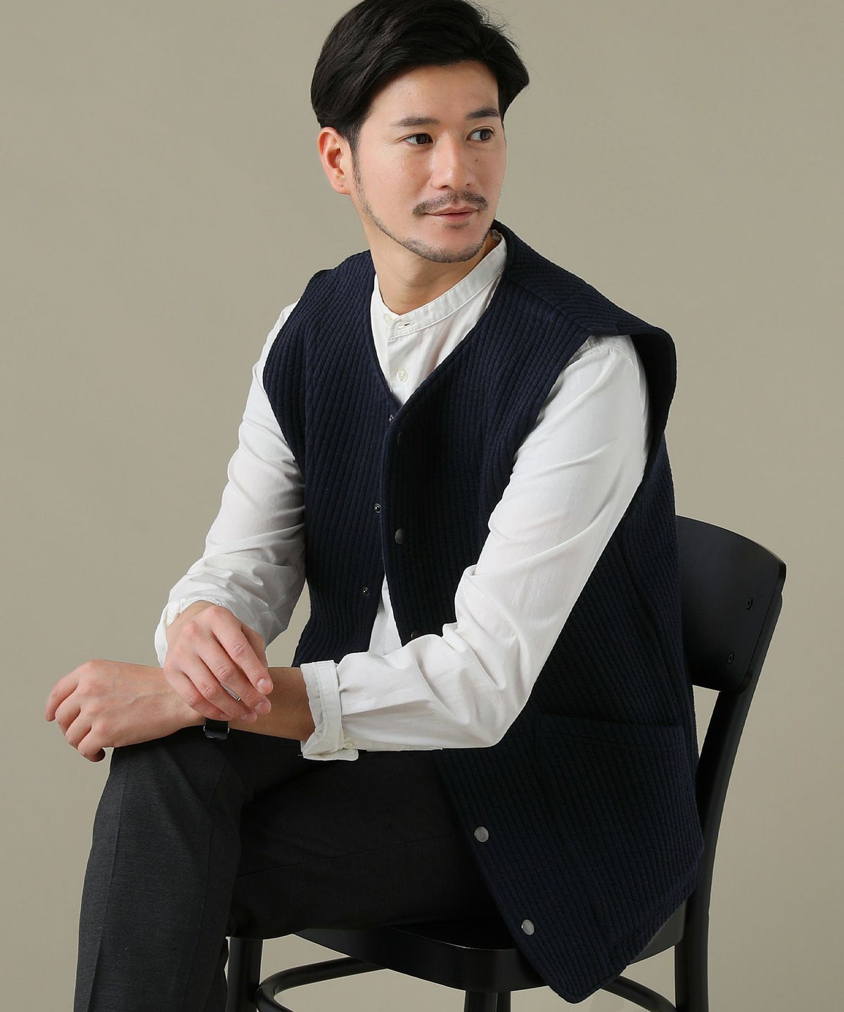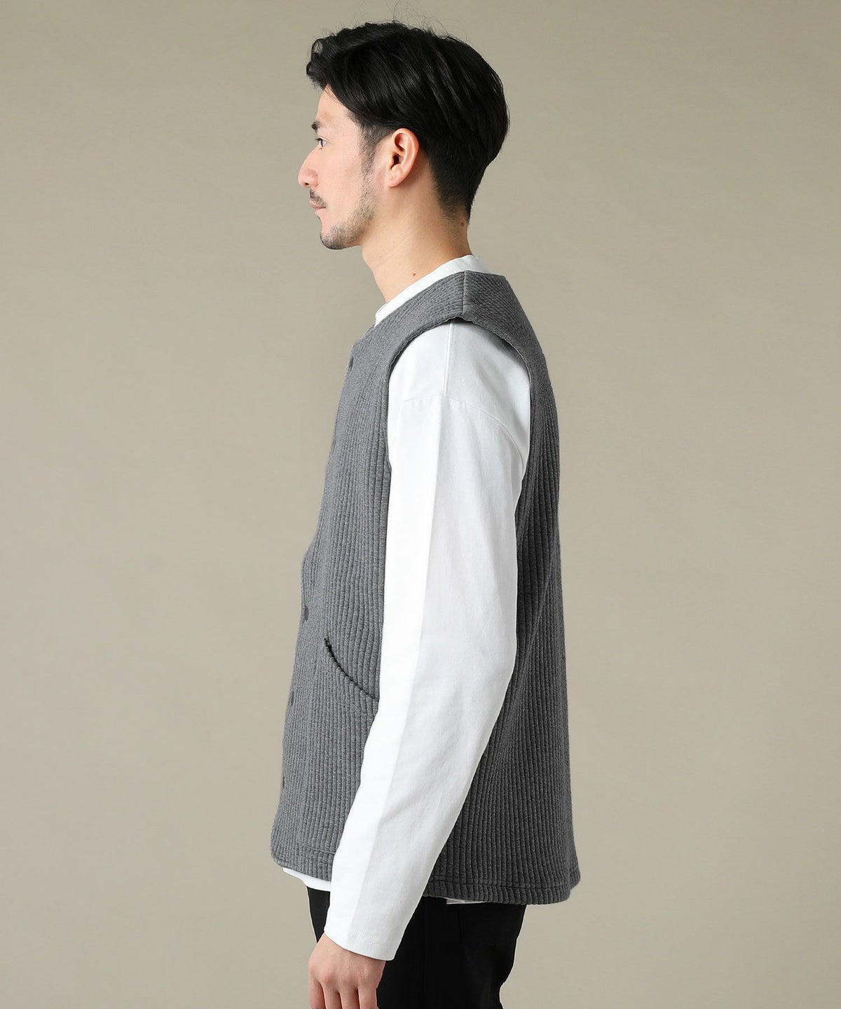 日本製「尾州」コットンキルトノーカラースナップベスト