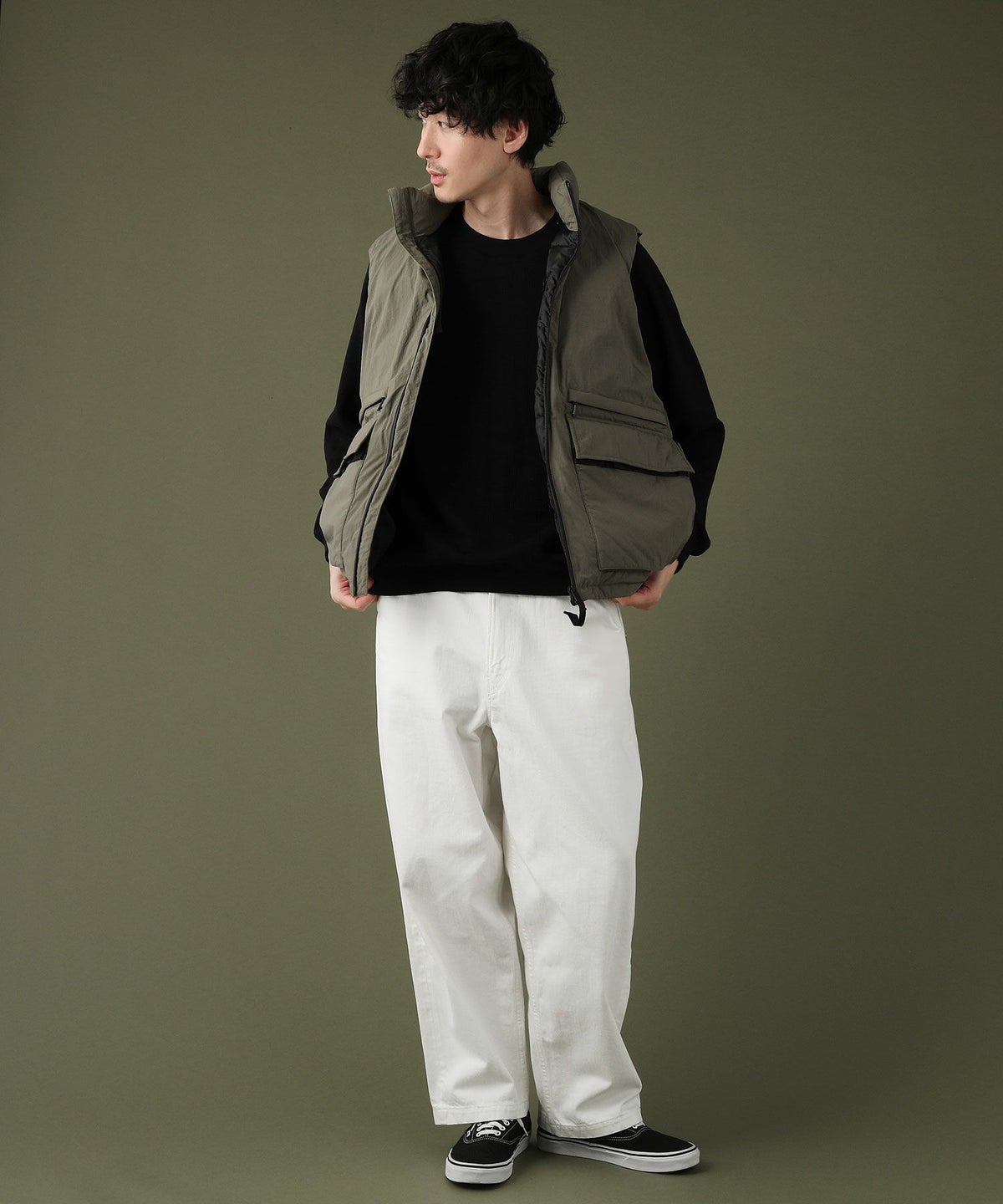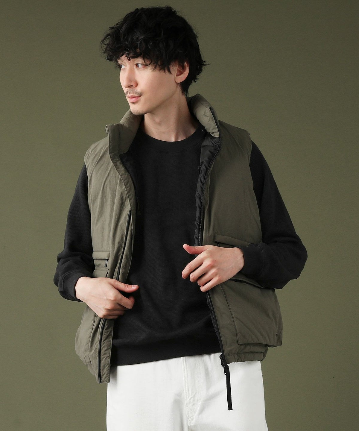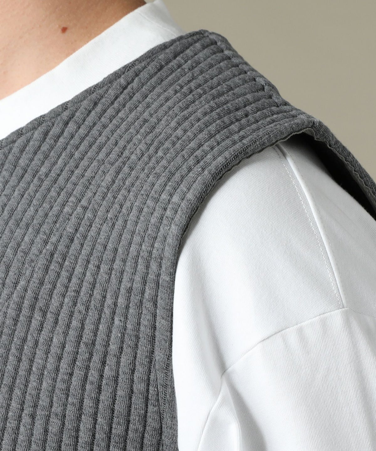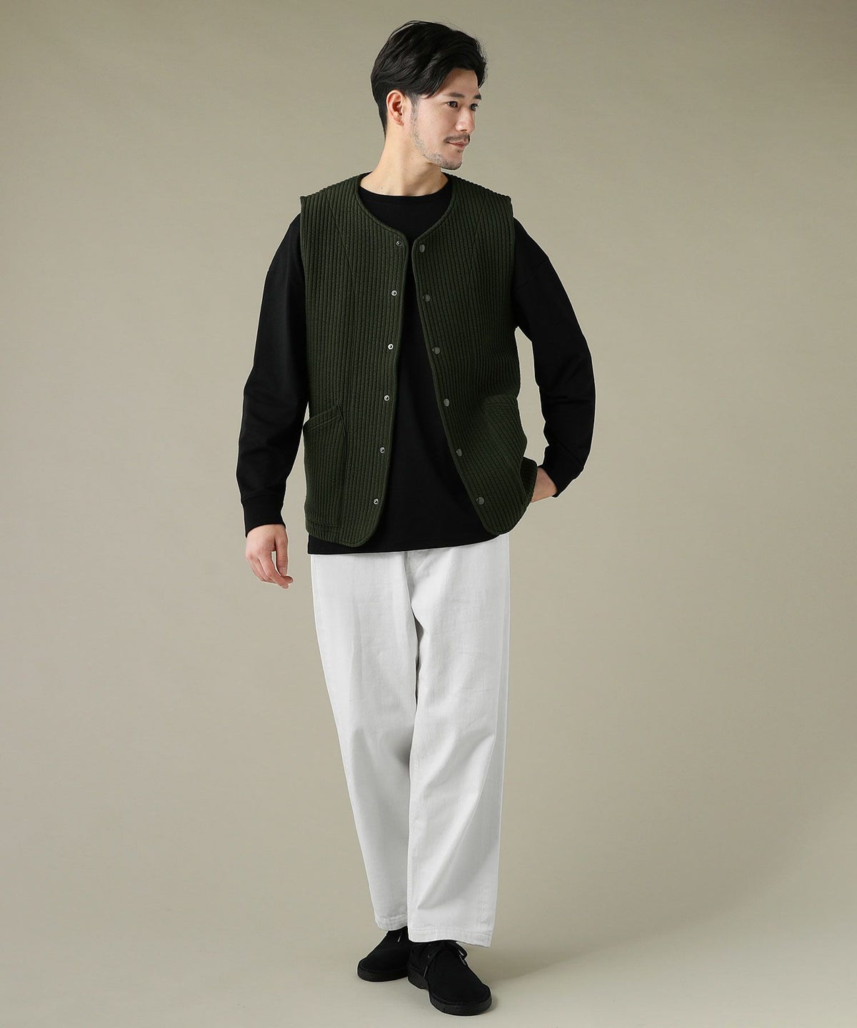 日本製「尾州」コットンキルトノーカラースナップベスト
