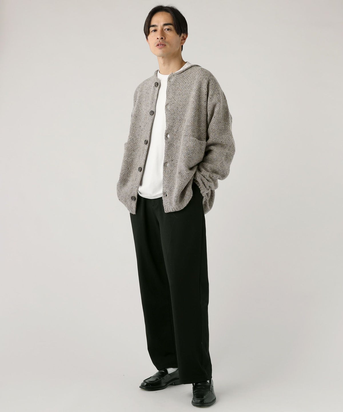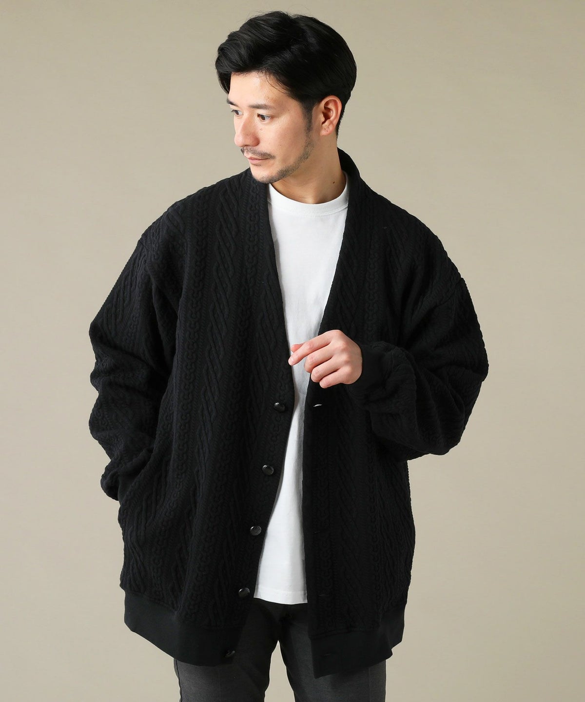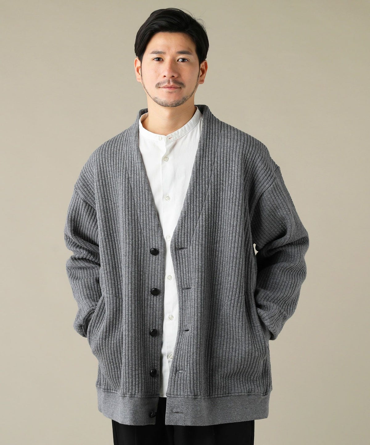 変形ダンボールニットボタンレステーラードカーディガン