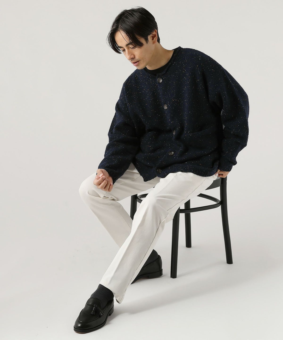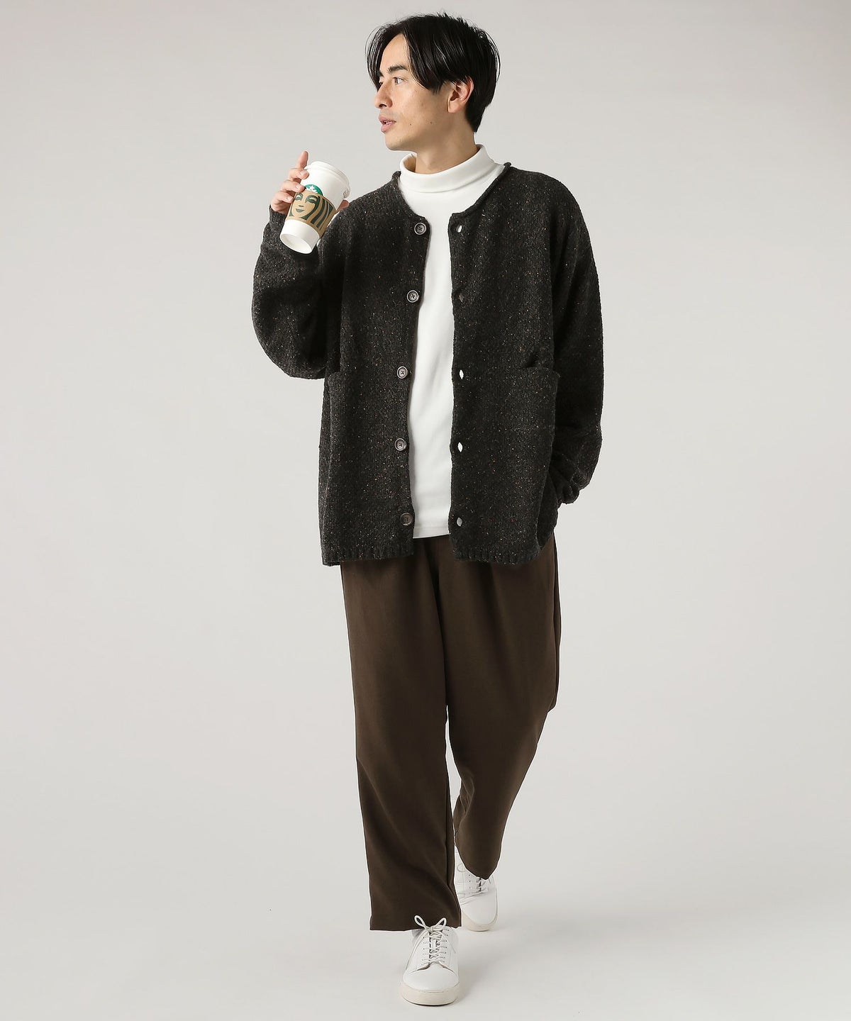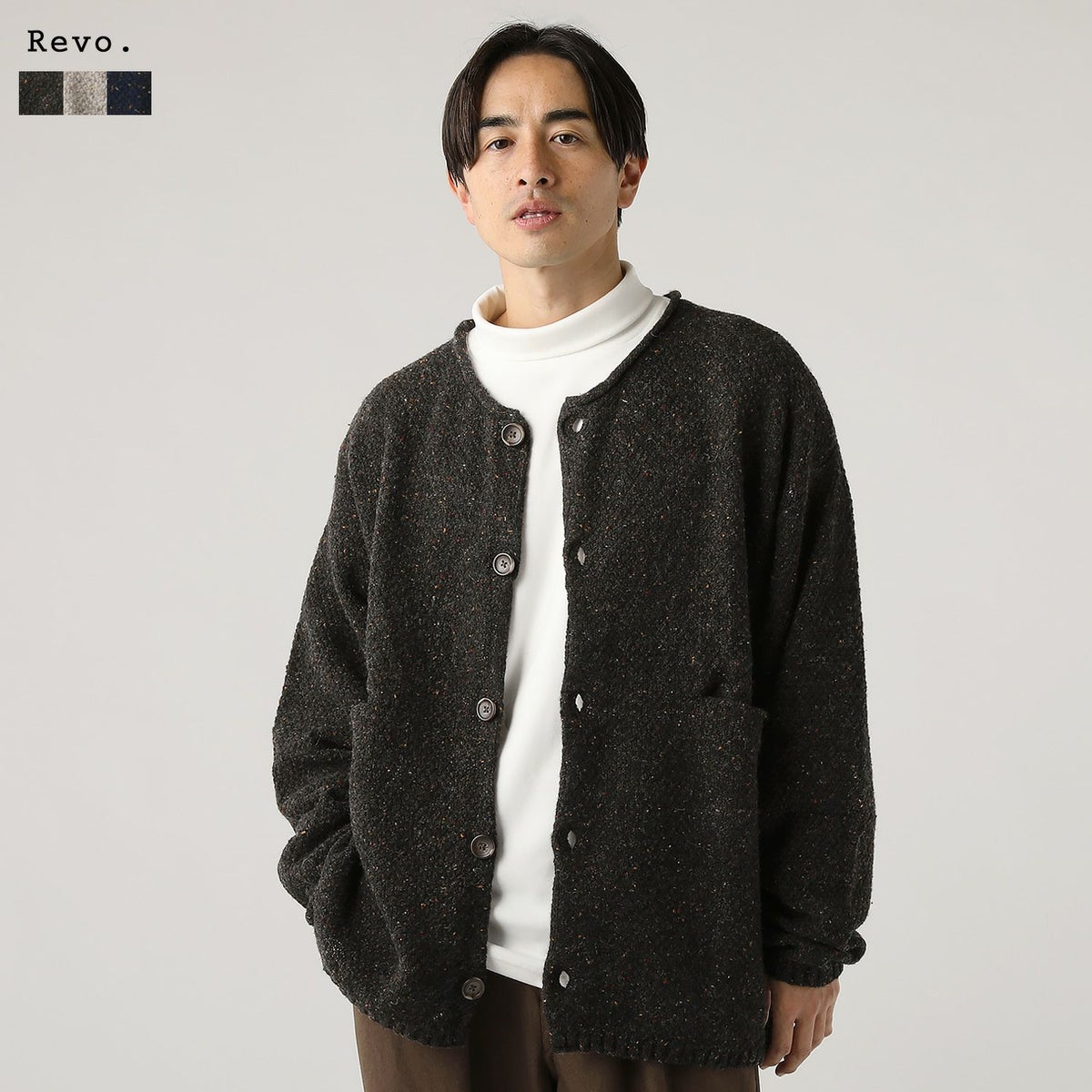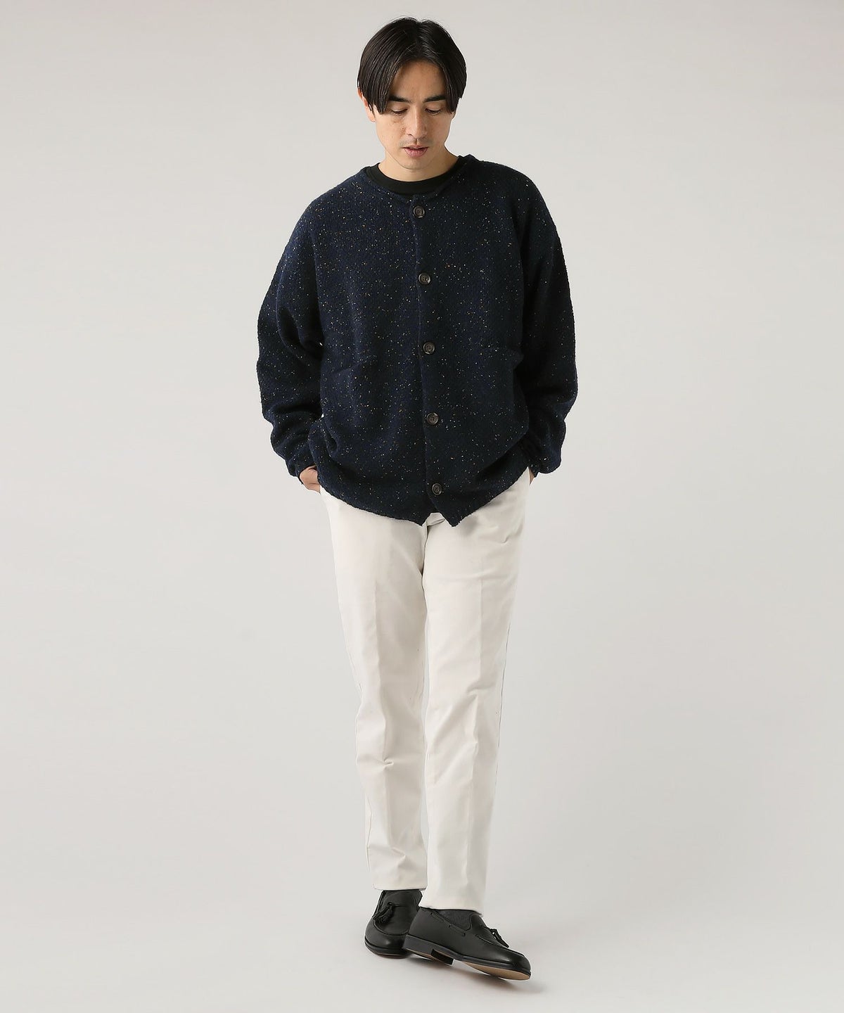 ウール混5G鹿の子編みカラーネップクルーネックカーディガン