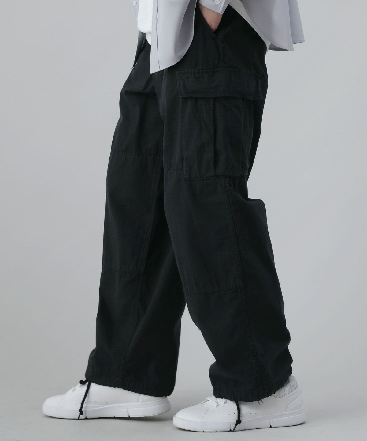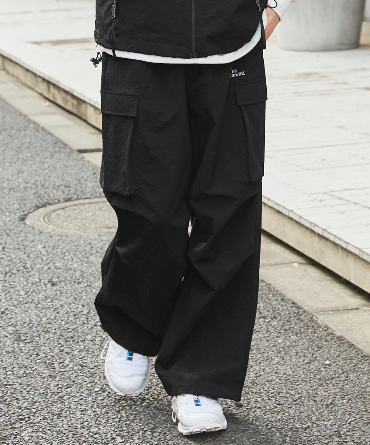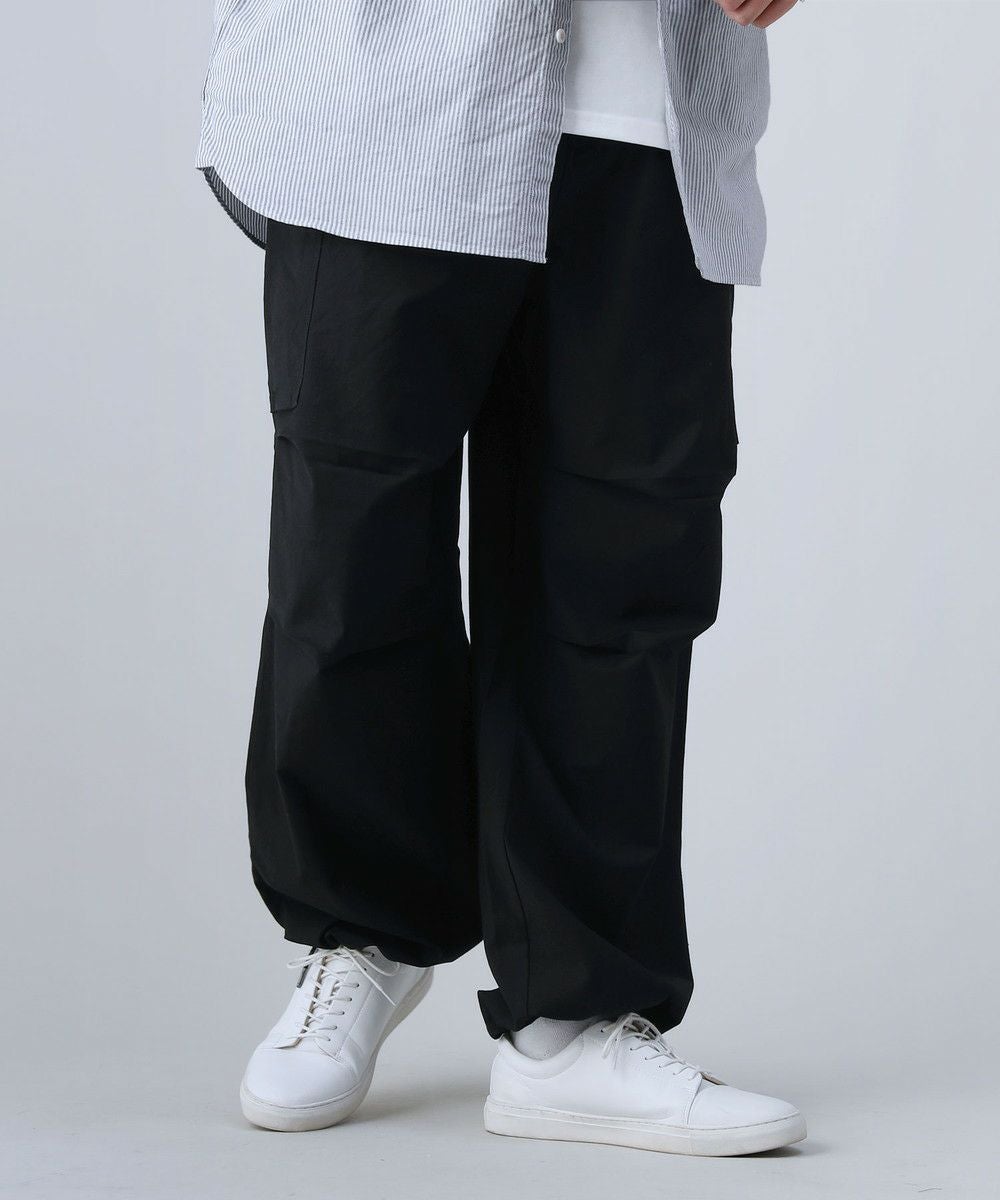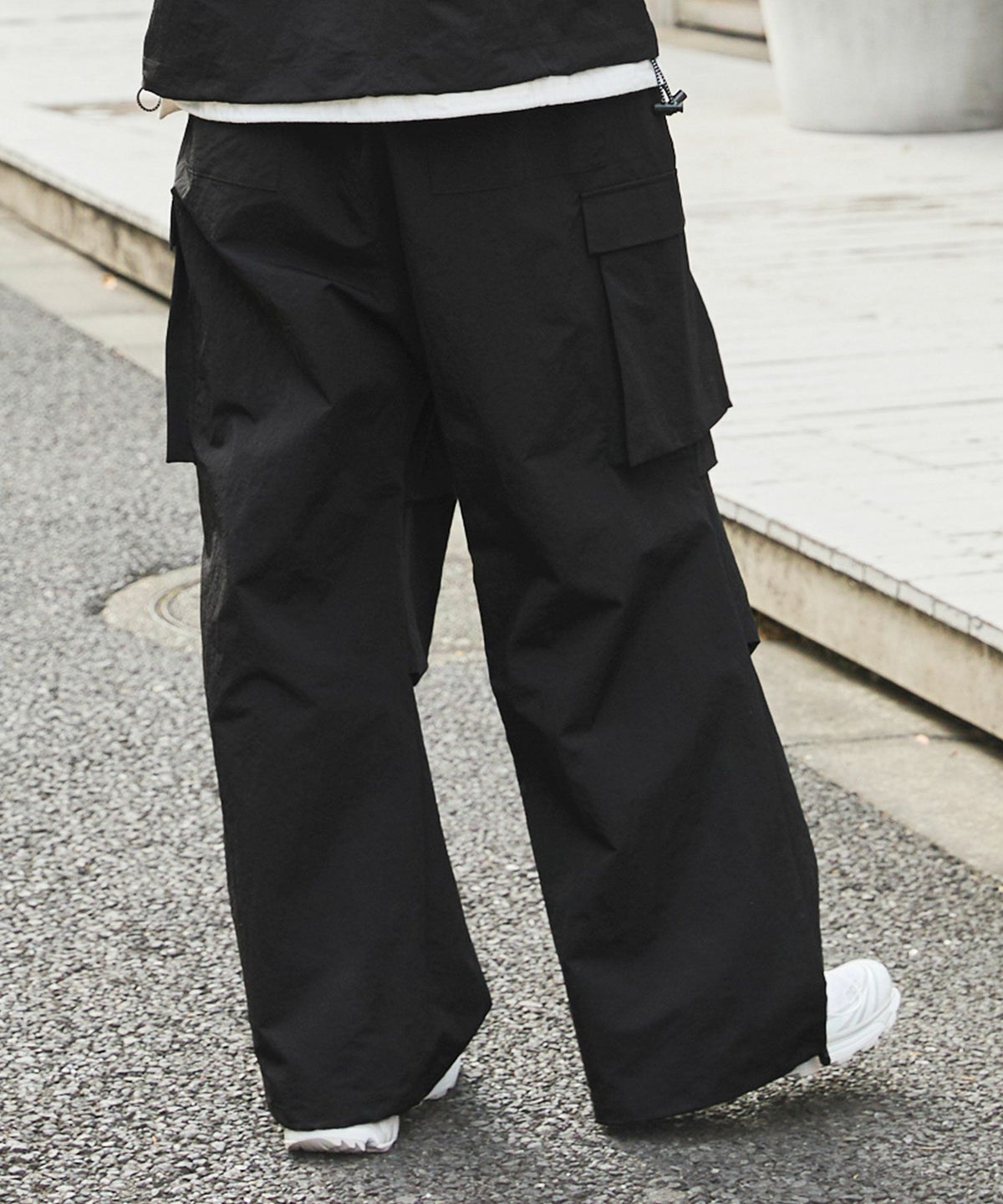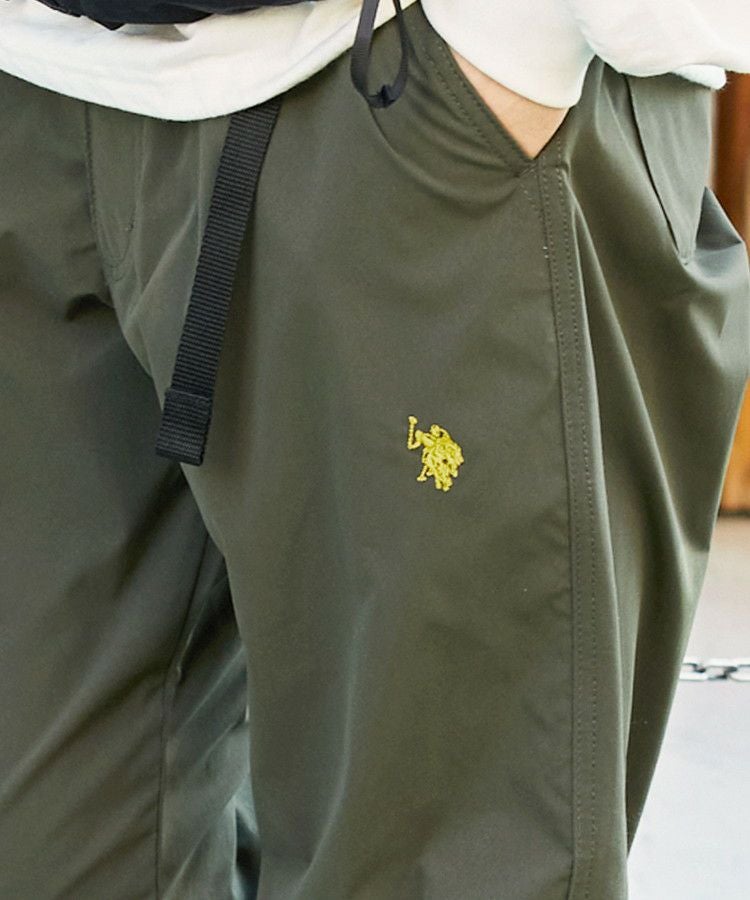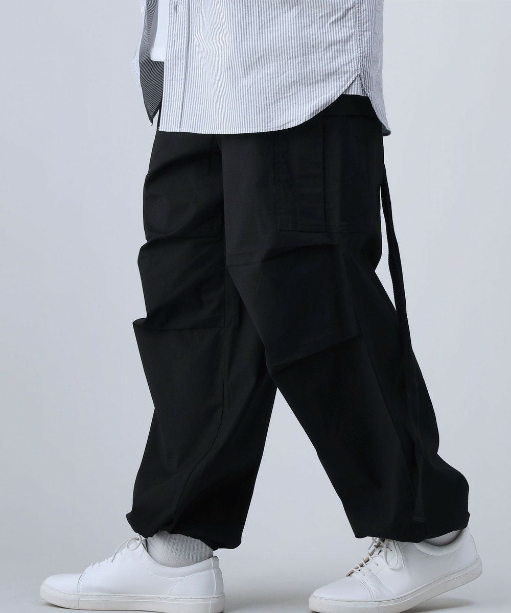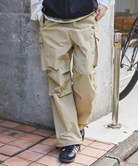ロゴ刺繍ナイロンワイド裾ドローコードカーゴパンツ