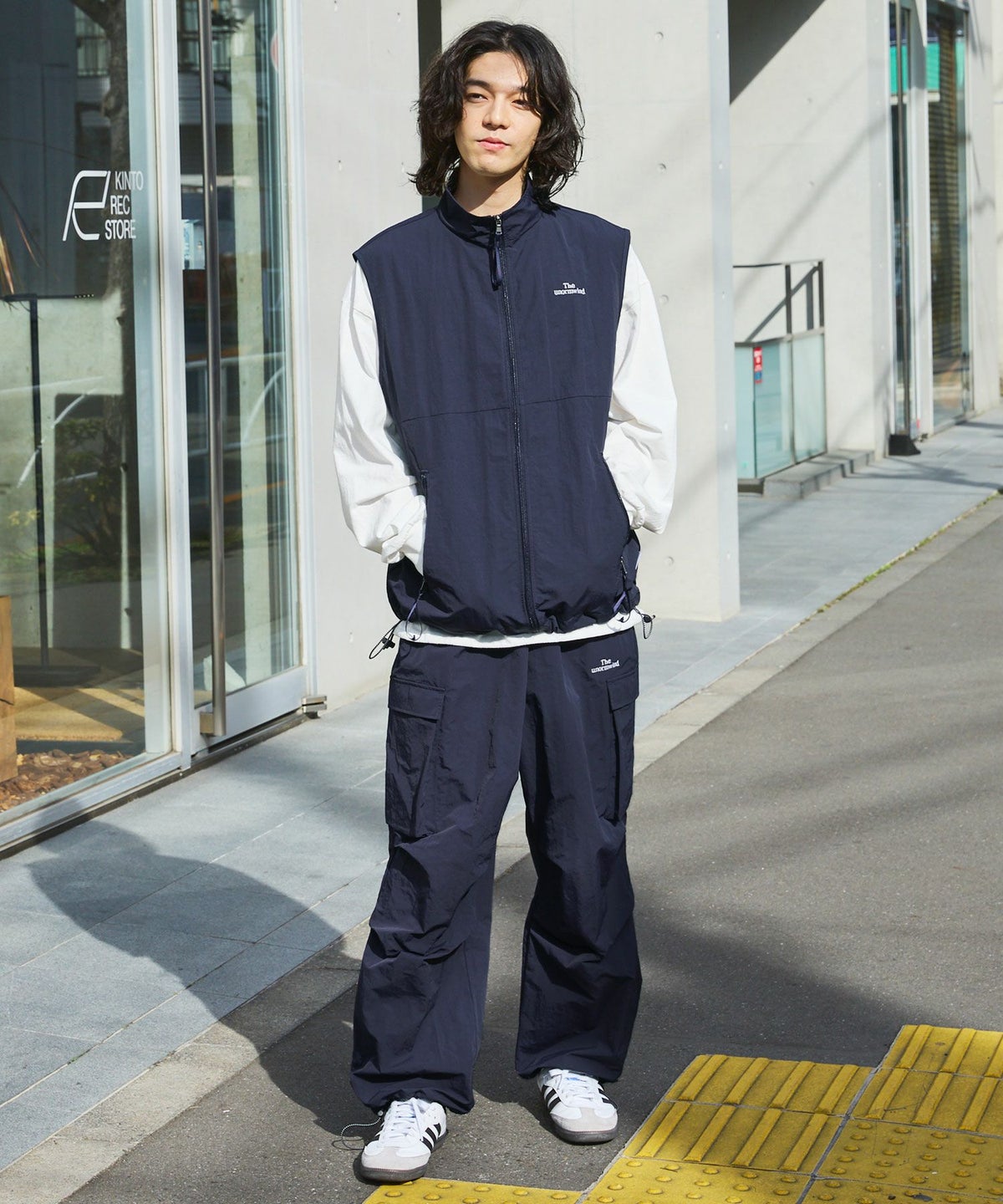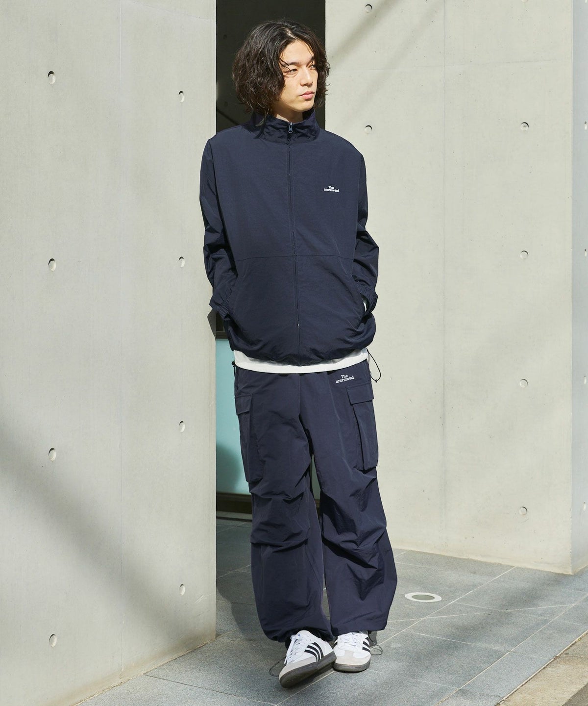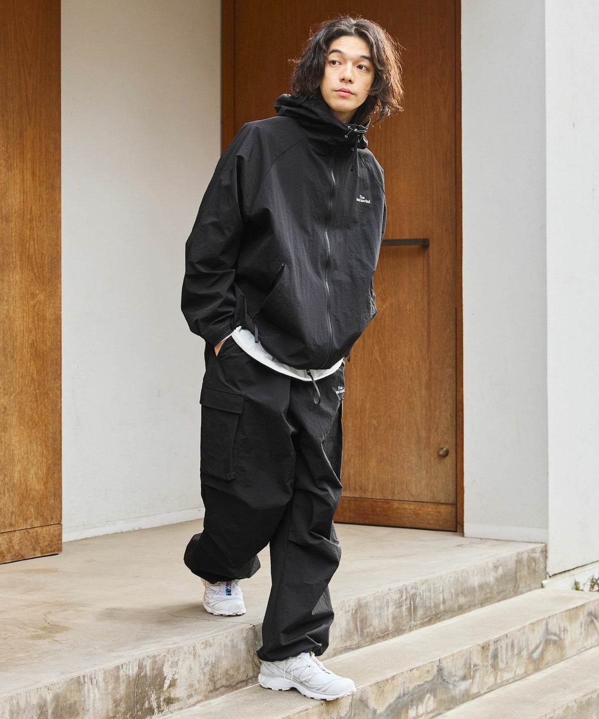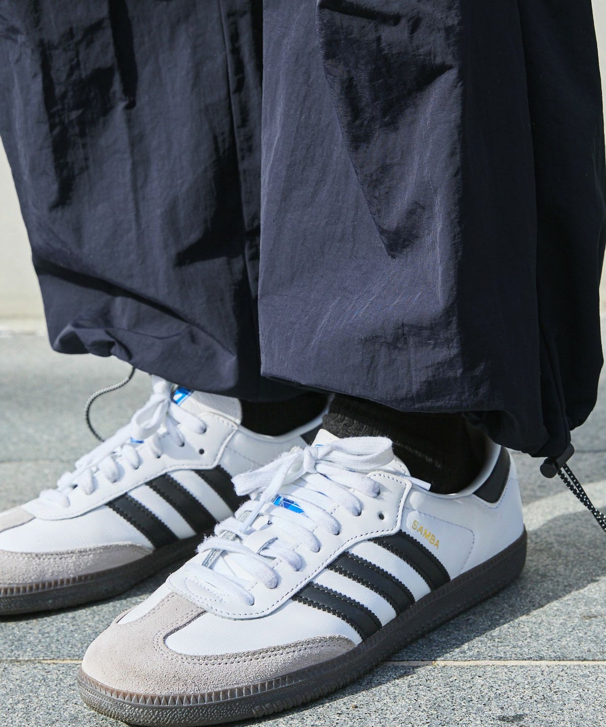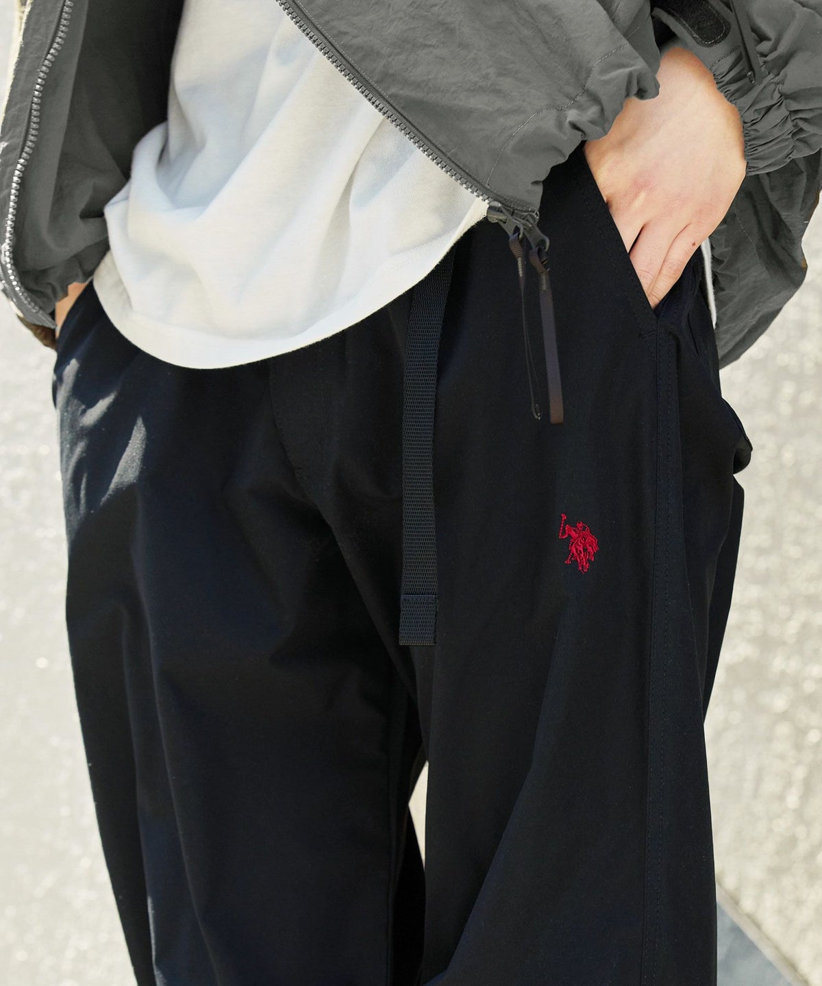 ロゴ刺繍ナイロンワイド裾ドローコードカーゴパンツ